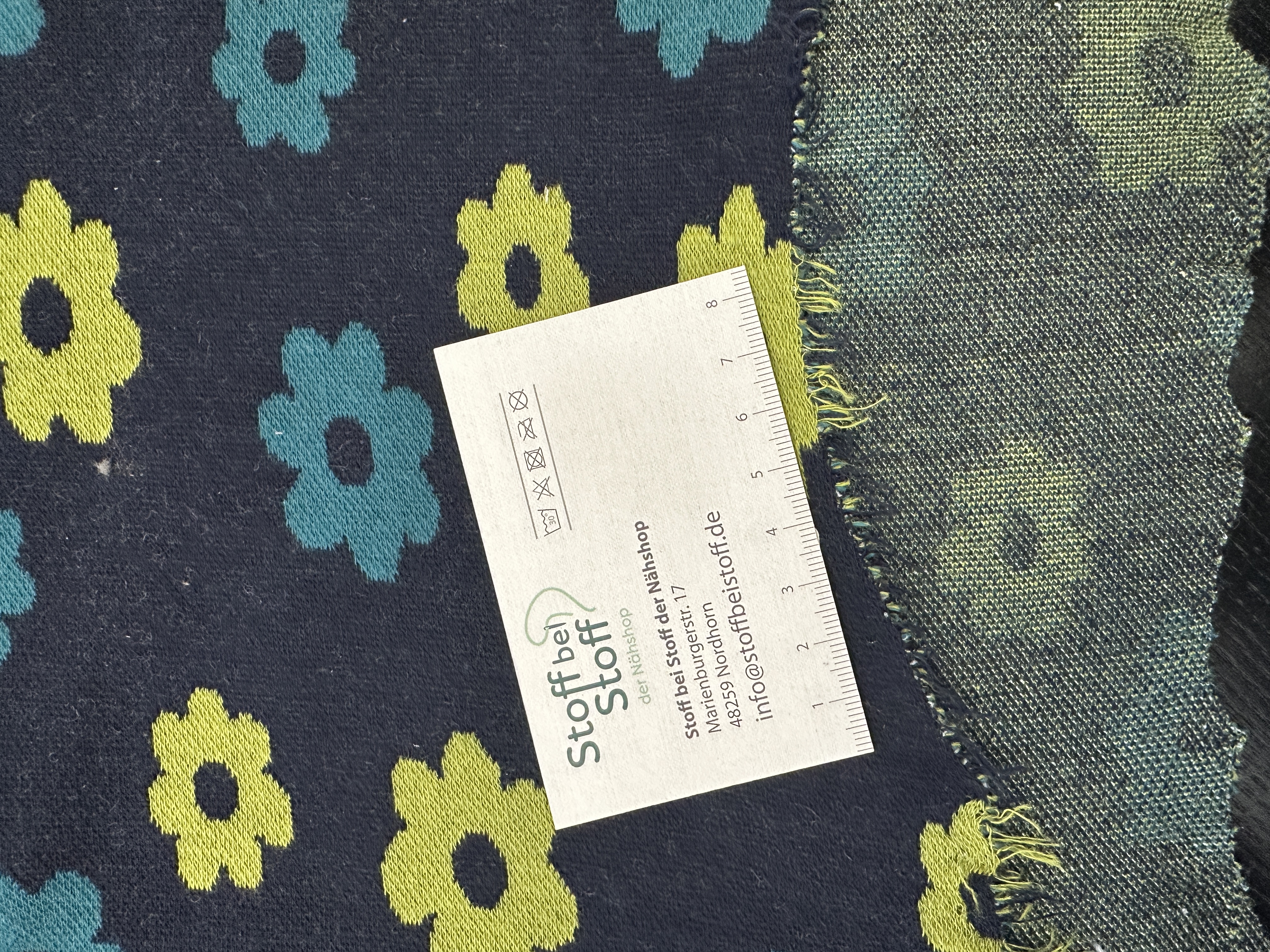 Dieser trendige Strick Jacquard bringt frische Farben in deine Nähprojekte! Mit seinem charmanten Blumenmuster in Türkisblau und Limettengrün auf dunkelblauem Hintergrund ist er ideal für individuelle Mode und Accessoires geeignet.