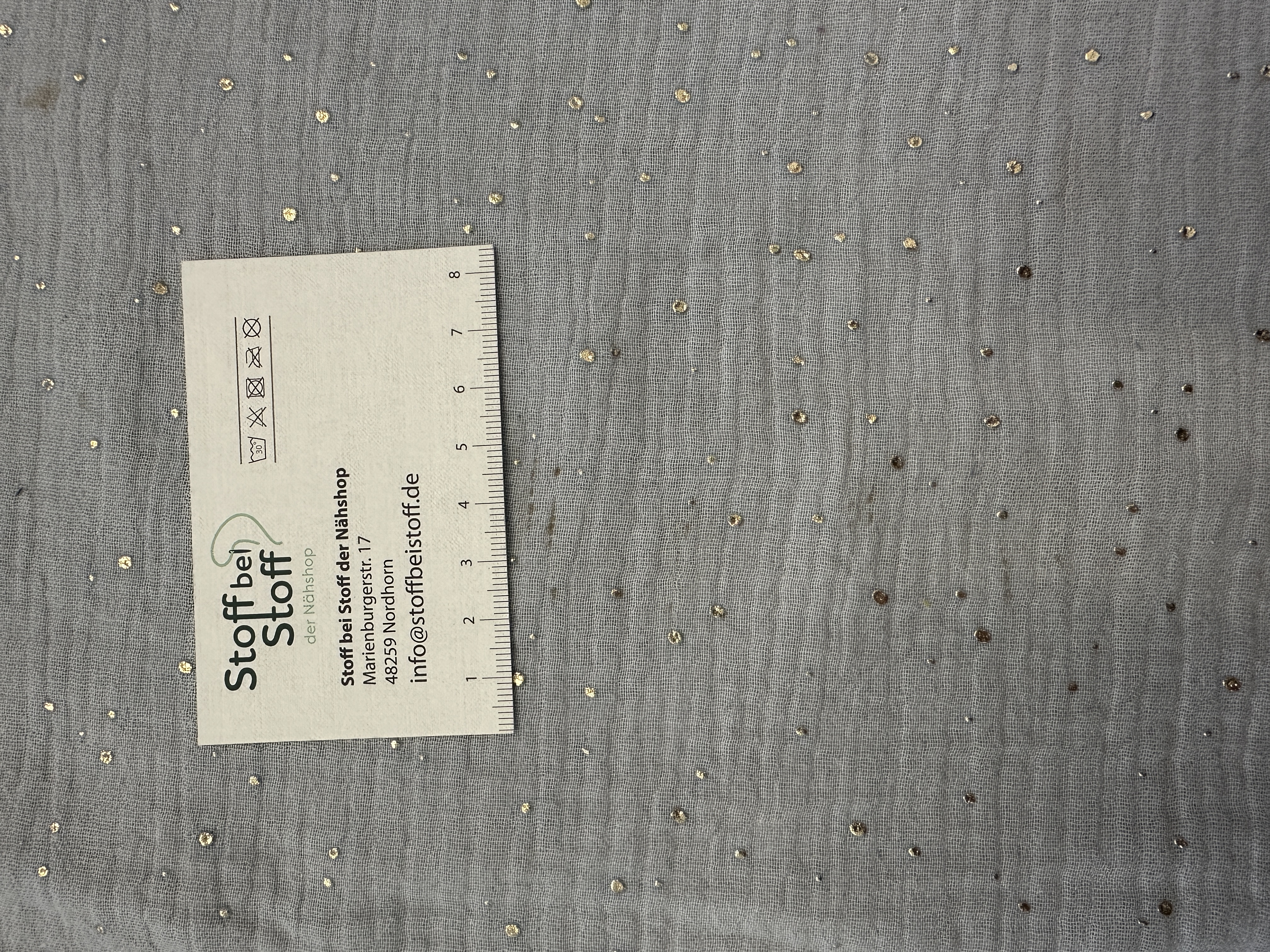 Musselin „Goldpunkte“ – luftiger Baumwollstoff mit edlem Glanz Dieser hochwertige Musselin aus 100 % Baumwolle begeistert mit seiner weich fallenden, leicht gekreppten Struktur und feinen goldfarbenen Punkten. Der dezente Glanz verleiht dem Stoff eine edle, moderne Note, ohne aufdringlich zu wirken. Dank seiner luftigen Qualität ist Musselin „Goldpunkte“ besonders angenehm auf der Haut und ideal für leichte, komfortable Nähprojekte – perfekt für Babys, Kinder und Erwachsene. Besonderheiten: weicher Musselin mit typischer Crinkle-Struktur feine goldene Punkte für einen eleganten Akzent luftig, leicht & atmungsaktiv hautfreundlich & angenehm zu tragen vielseitig kombinierbar 🧷 Material & Eigenschaften Material: 100 % Baumwolle Breite: ca. 150 cm Gewicht: ca. 135 g/m² Qualität: Musselin / Double Gauze Pflege: waschbar bei 30 °C (auf links, kein Trockner empfohlen)