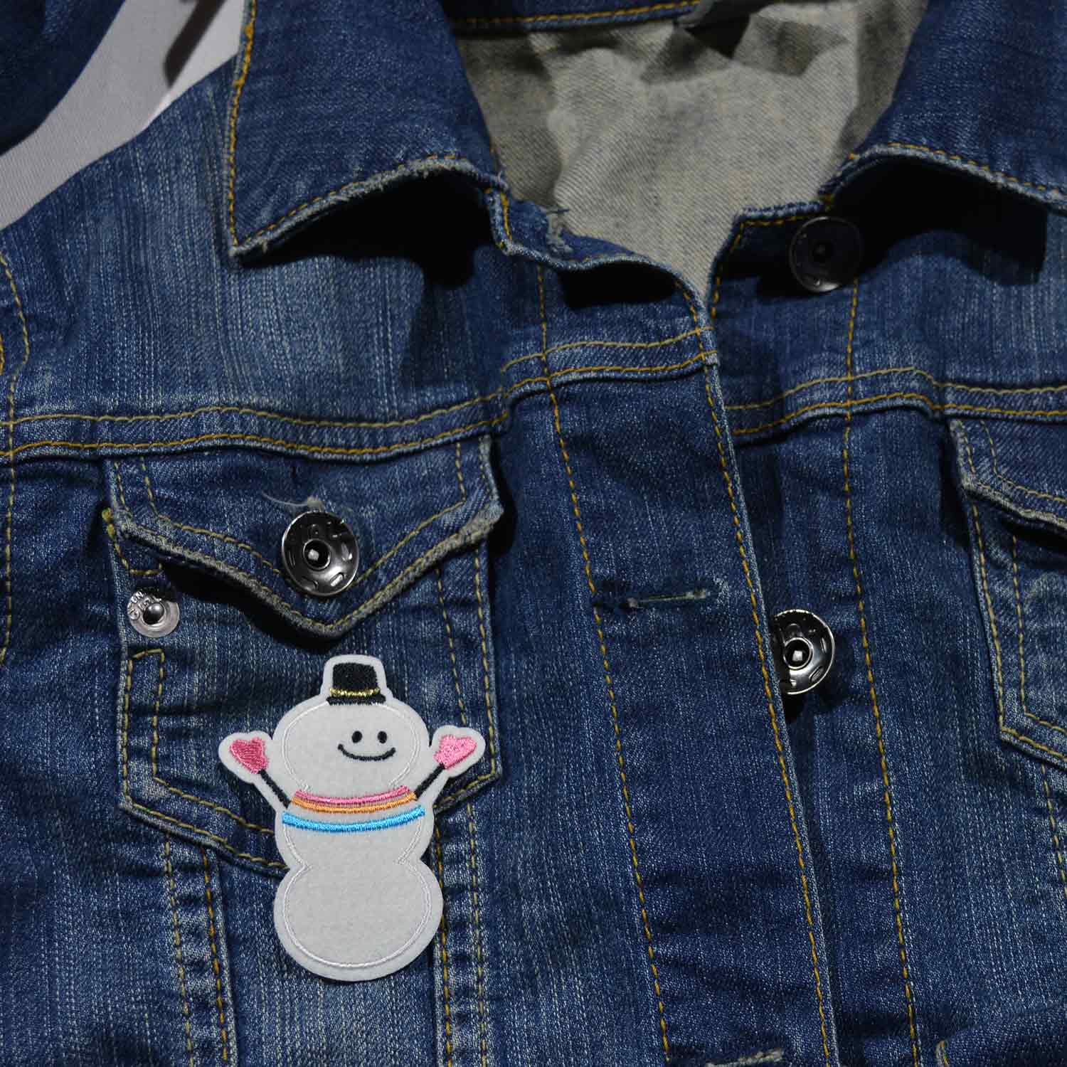 Der weiße Schneemann hat ein flottes, schwarzes Hütchen mit glitzerndem Goldband auf, trägt einen bunten Halsschmuck und hat die Ärmchen mit den rosa Handschuhen fröhlich gehoben.
