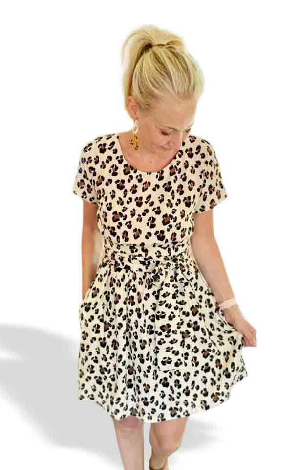 Durch ein Gummiband an der Teilungsnaht und einen optionalen Bindegürtel sitzt das Kleid figurnah.