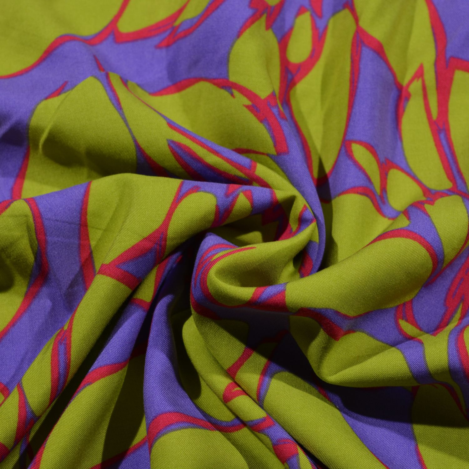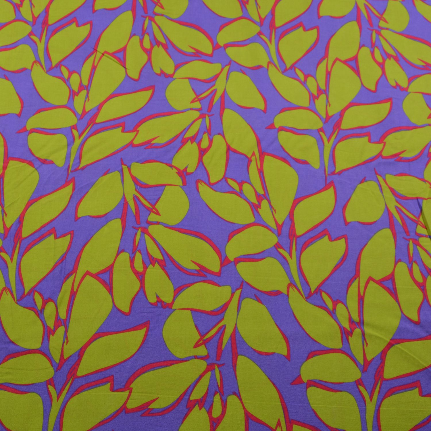 Der Bambus-Baumwollstoff „Tropical Leaves“ ist ein echter Blickfang mit seinem auffälligen Blattdesign in leuchtendem Grün auf intensivem Violett. Die kontrastreiche Farbgebung und das moderne Muster verleihen dem Stoff eine exotische, trendige Ausstrahlung.