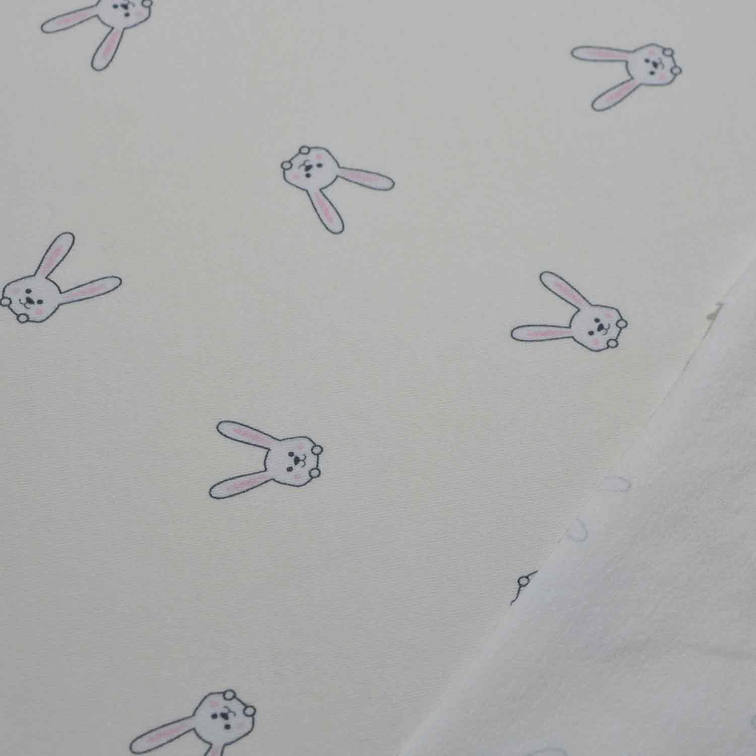 Entzückende Baumwoll-Jersey-Serie Dina aus dem Hause Glünz. Dieser kuschelige Jersey mit mintgrünem Untergrund ist mit kleinen, weißen Häschen mit langen Ohren bedruckt. Ein süßer Stoff mit fröhlicher Ausstrahlung.