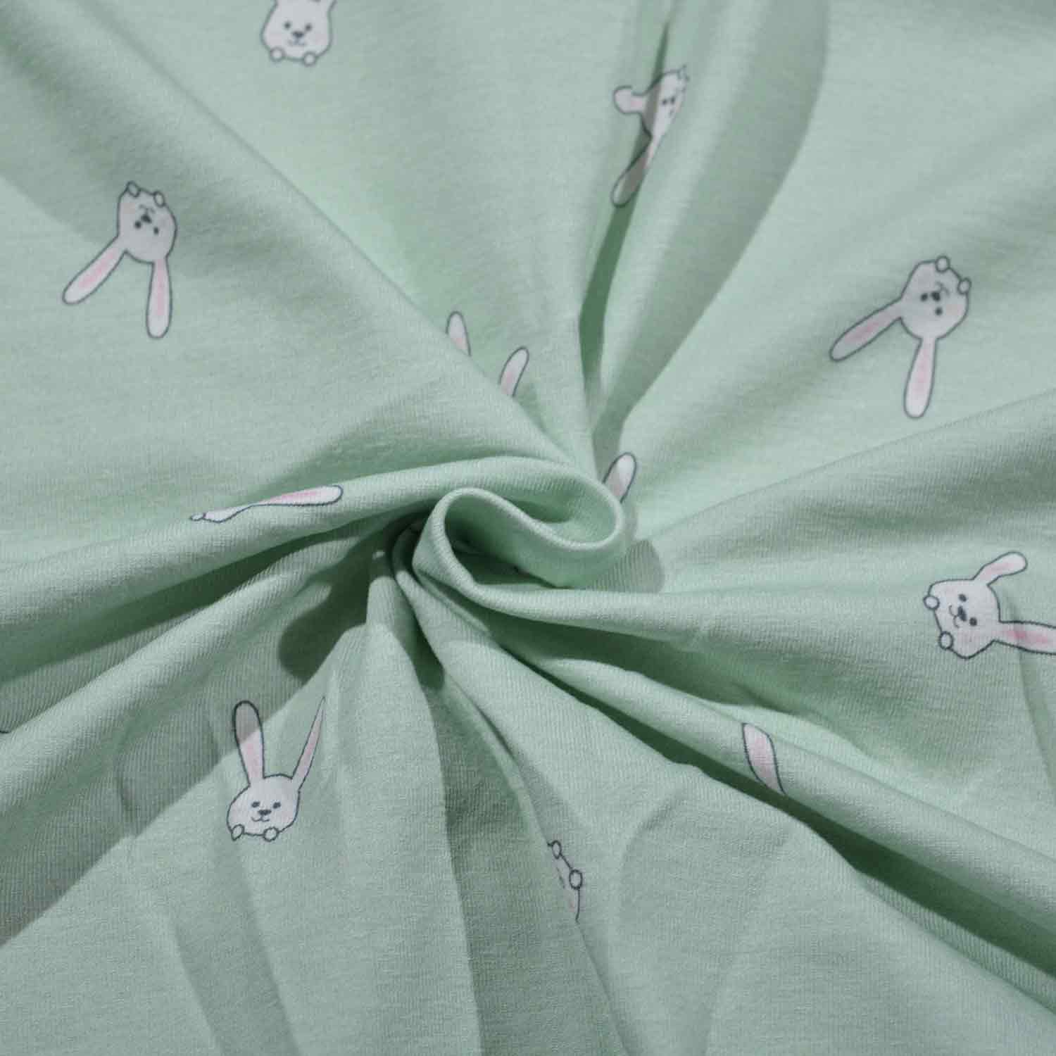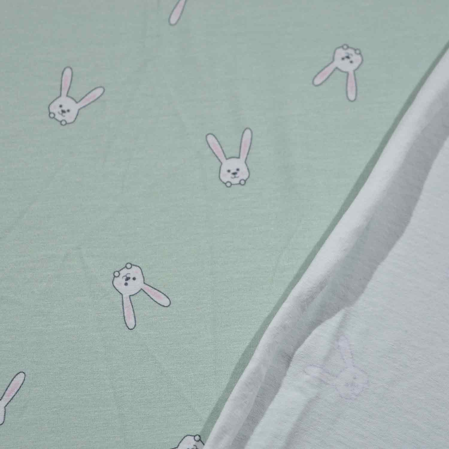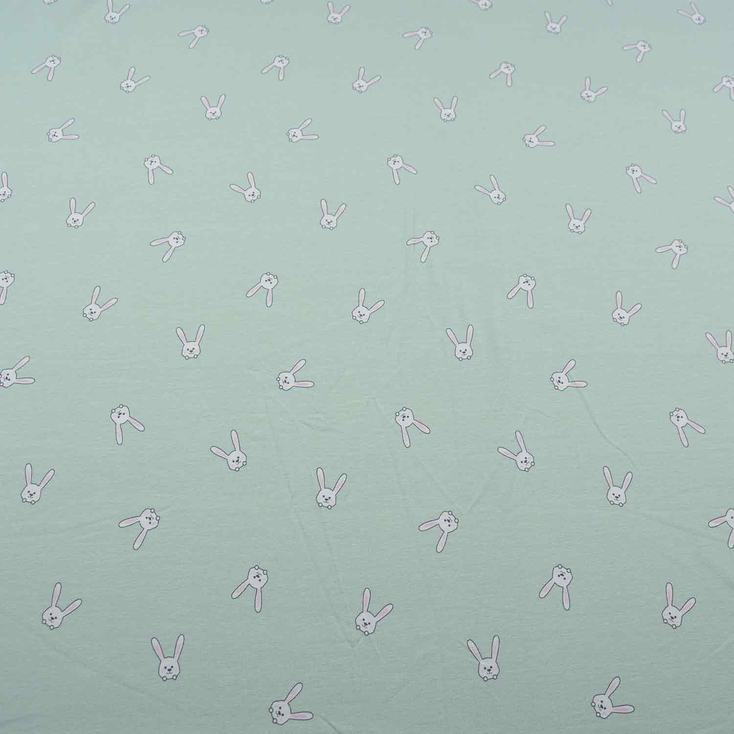 Entzückende Baumwoll-Jersey-Serie Dina aus dem Hause Glünz. Dieser kuschelige Jersey mit wollweißem Untergrund ist mit kleinen, weißen Häschen mit langen Ohren und niedlichen Pfötchen bedruckt. Ein süßer Stoff mit fröhlicher Ausstrahlung.