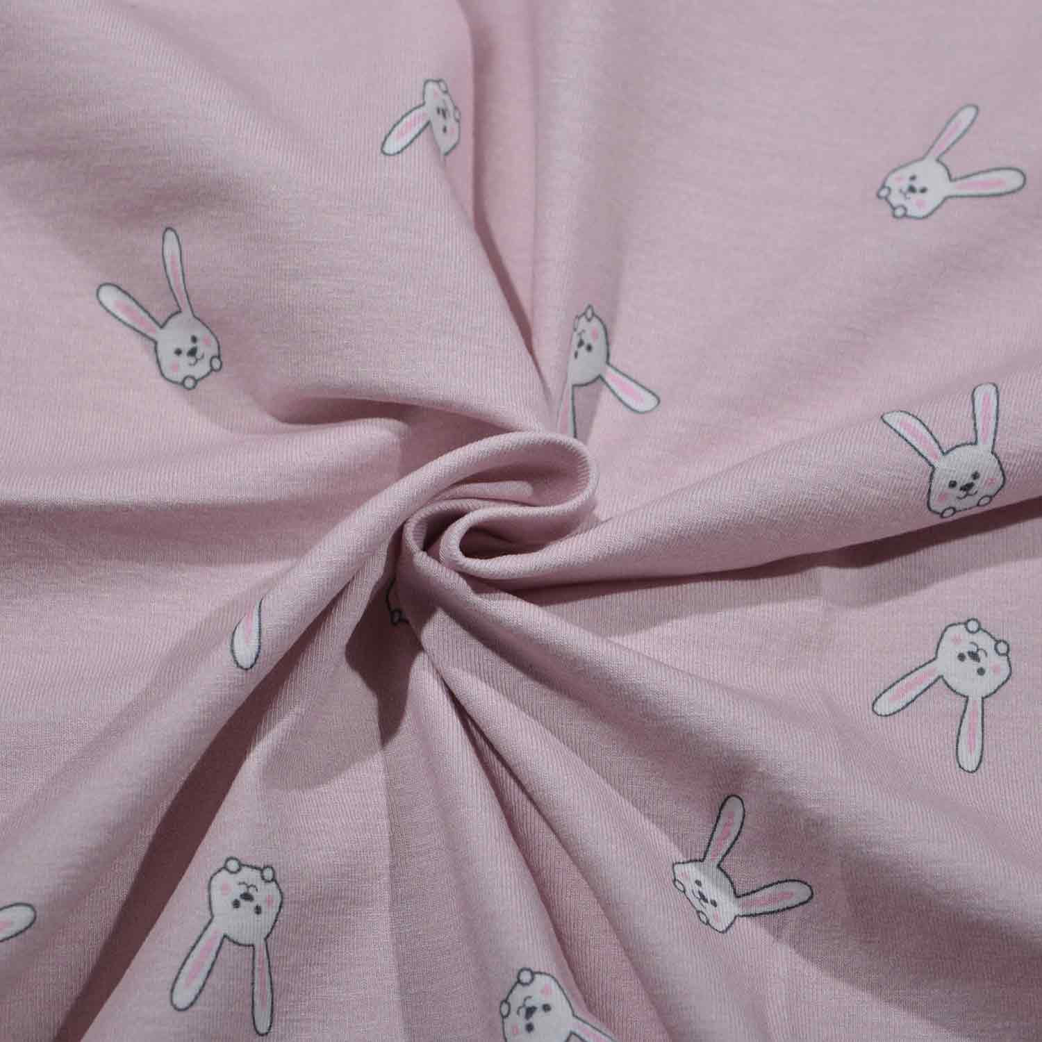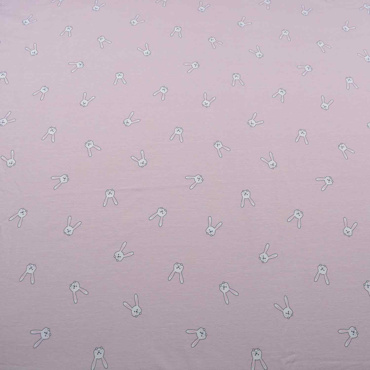 Entzückende Baumwoll-Jersey-Serie Dina aus dem Hause Glünz. Dieser kuschelige Jersey mit mintgrünem Untergrund ist mit kleinen, weißen Häschen mit langen Ohren bedruckt. Ein süßer Stoff mit fröhlicher Ausstrahlung.