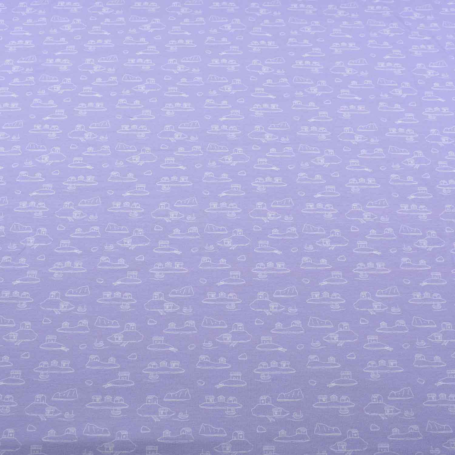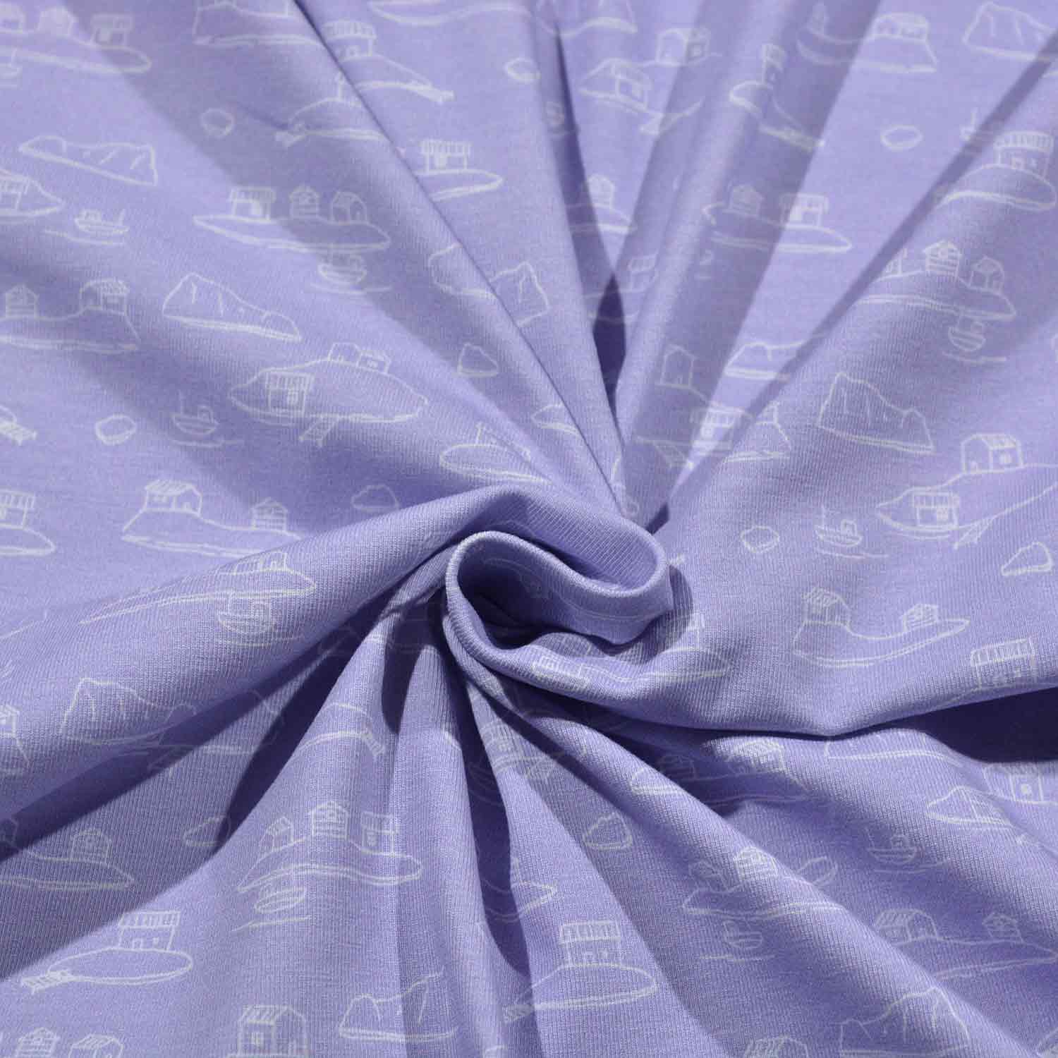 Wunderschöner, fliederfarbener Jersey mit zauberhaften, feinen Zeichnungen von kleinen Inselchen mit Holzhäuschen. Die weißen Zeichnungen erinnern an schwedische Schären.