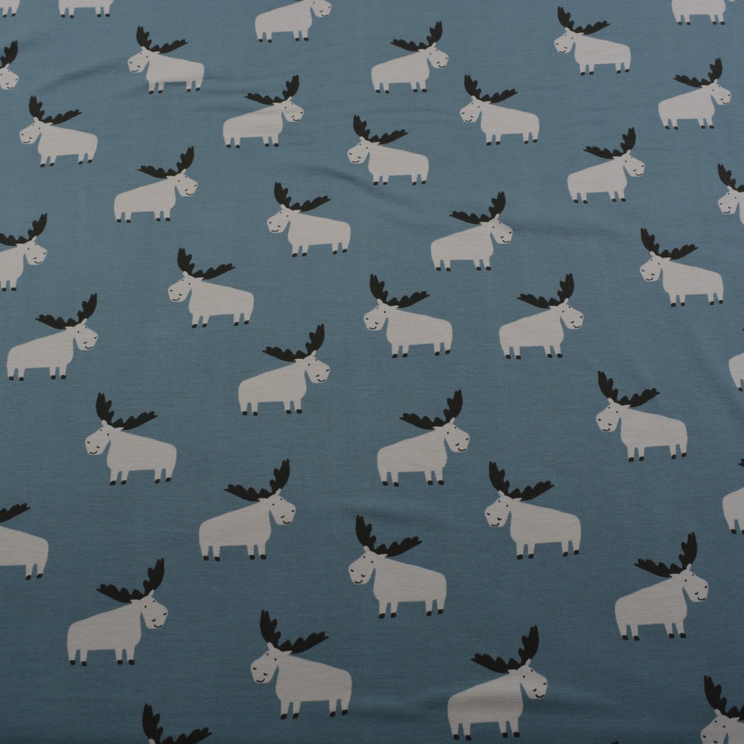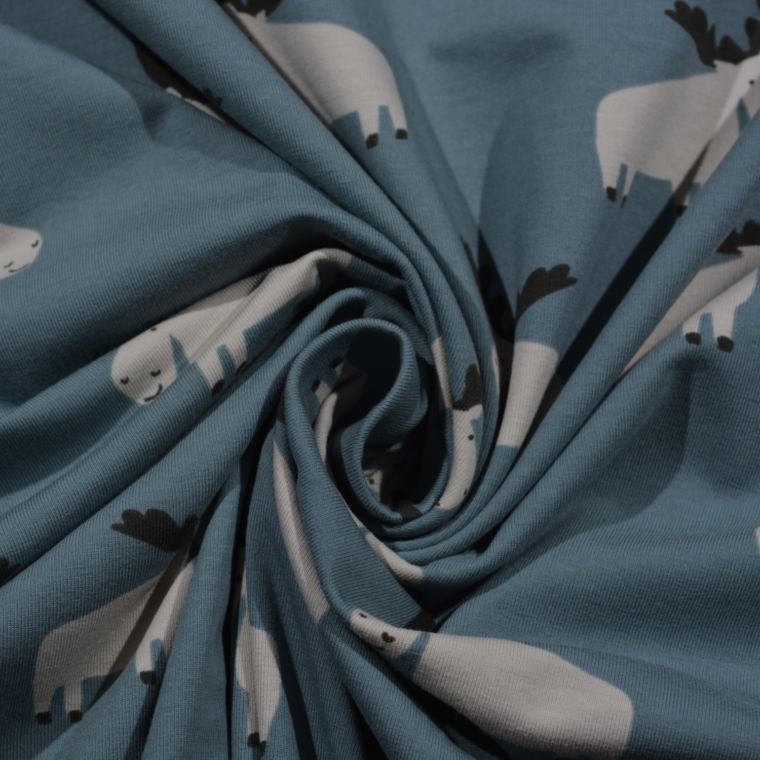 Dieser Baumwoll-Jersey bringt skandinavisches Flair in jedes Nähprojekt! Auf einem blauen Hintergrund tummeln sich weiße Elche mit markanten schwarzen Geweihen. Der weiche Jersey besteht aus 95% Baumwolle und 5% Elasthan – elastisch, angenehm zu tragen und vielseitig einsetzbar. Mit einer Breite von 150 cm und einem Gewicht von 200 g/m² ist er ideal für Shirts, Kinderbekleidung, Pumphosen oder Schlafanzüge.