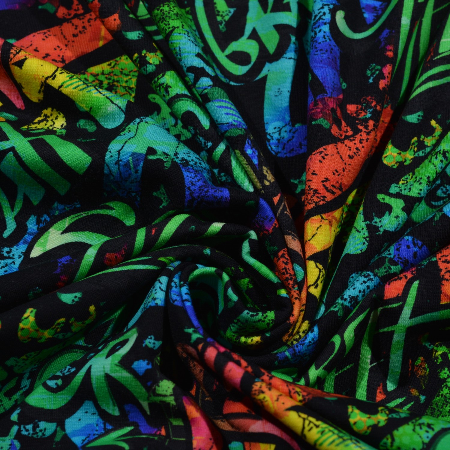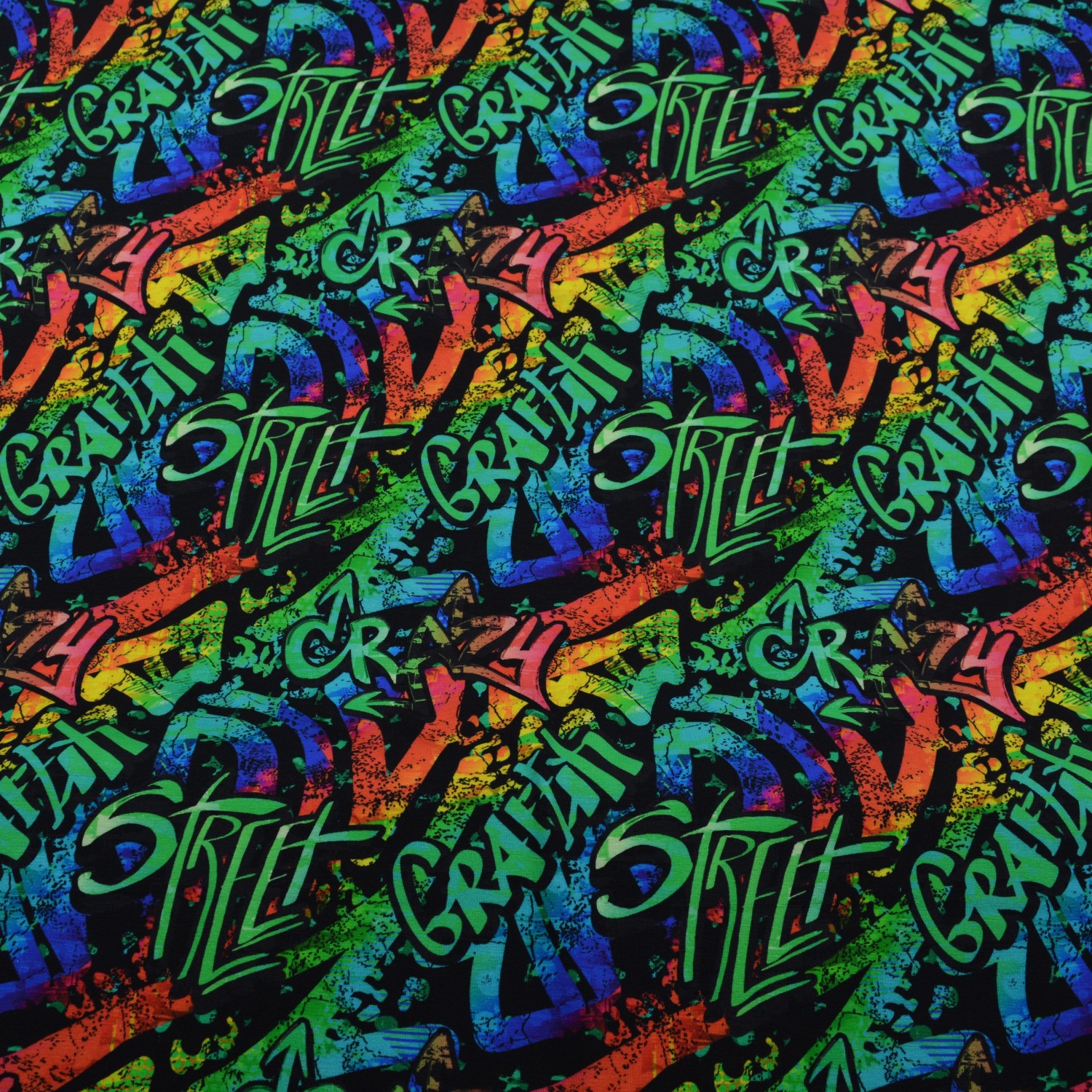Dieser auffällige Baumwoll-Jersey begeistert mit einem dynamischen Graffiti-Streetart-Design in kräftigen Neonfarben auf dunklem Untergrund – perfekt für coole, urbane Looks. Mit 95 % Baumwolle und 5 % Elasthan ist der Stoff angenehm weich, elastisch und ideal für bequeme Modeprojekte für Kinder, Teens und Erwachsene. Nutzbreite ca. 148 cm, Gewicht ca. 200 g/m² – ideal für Shirts, Hoodies, Leggings, Jogginghosen, Beanies oder sportliche Outfits.