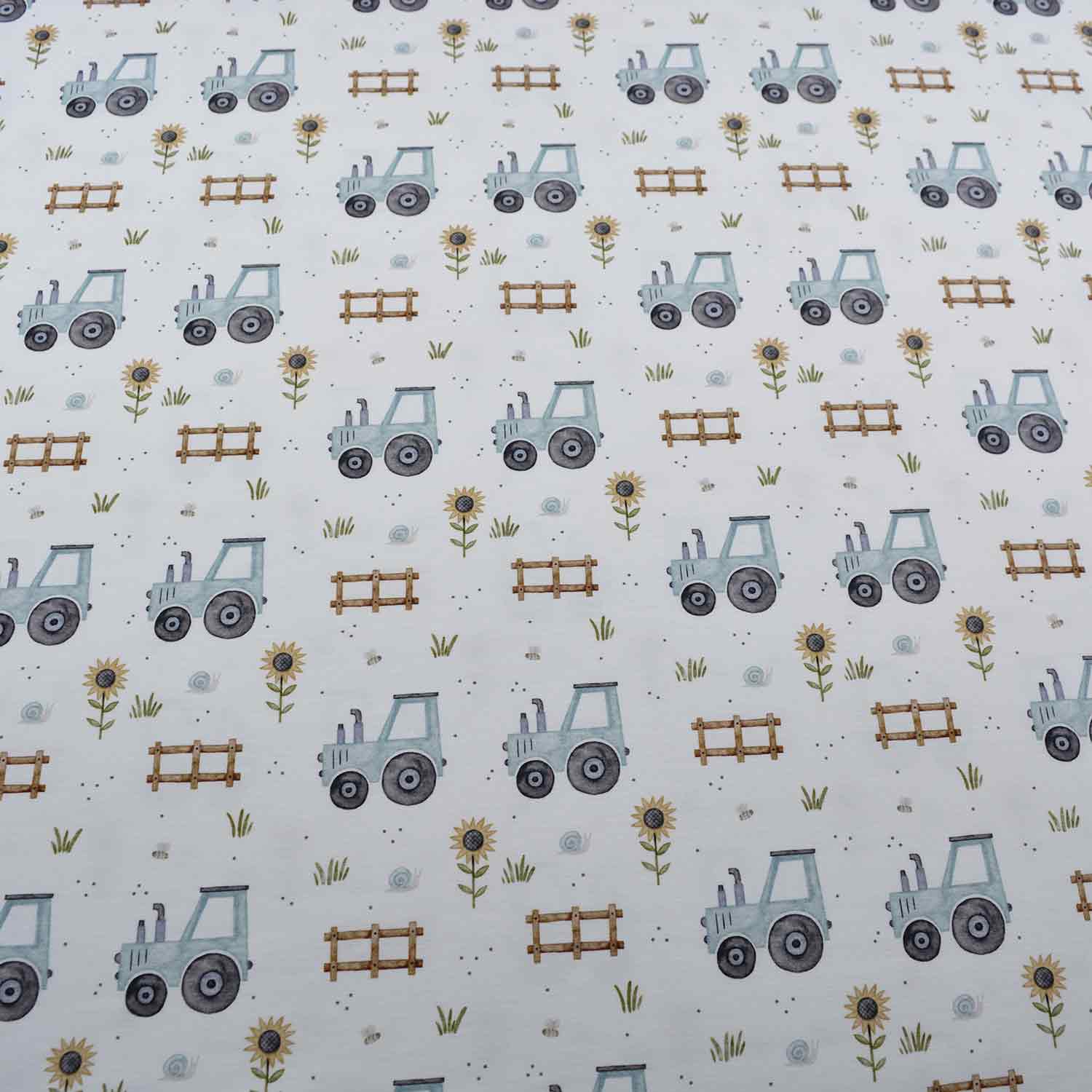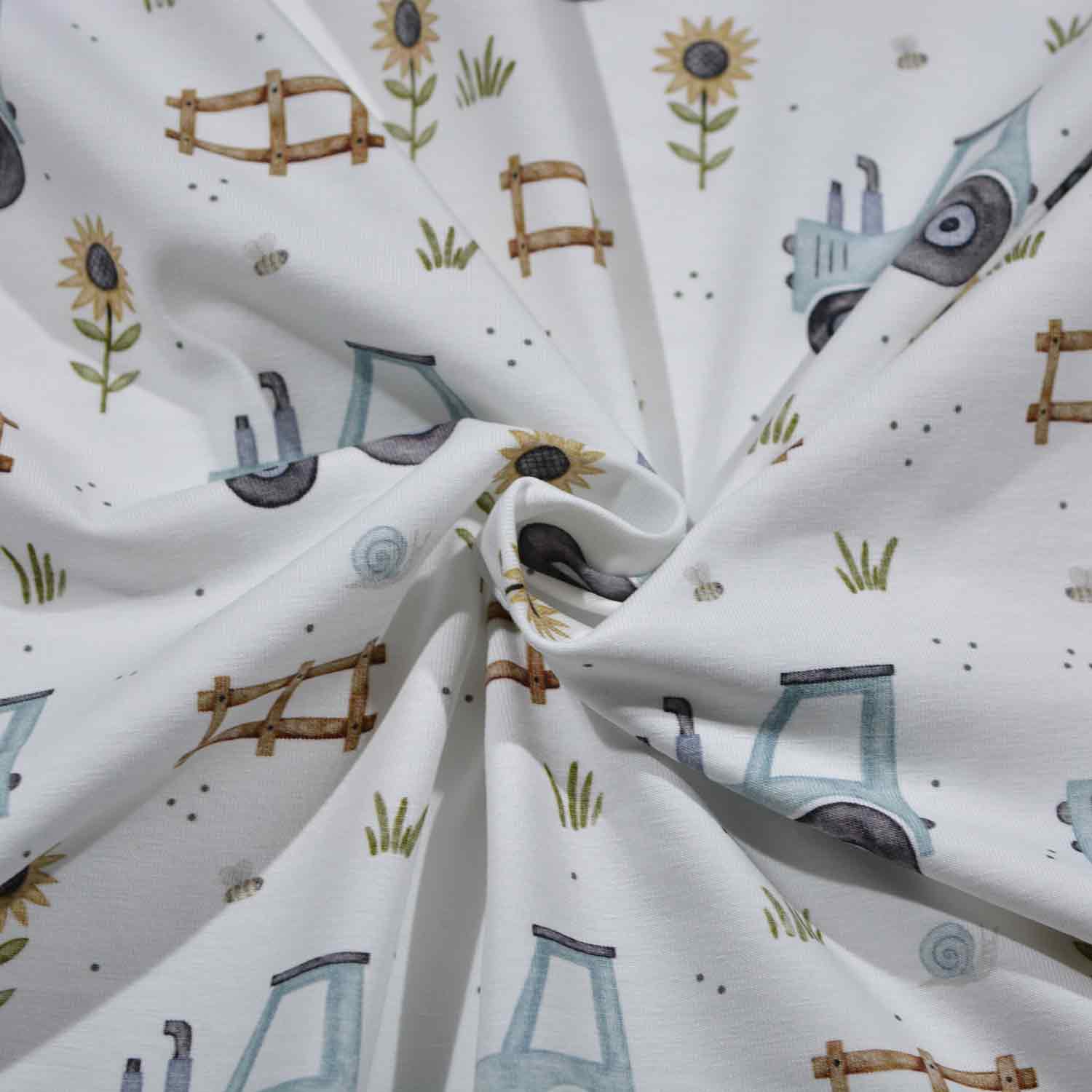 Entzückende Baumwoll-Jersey-Serie Dina aus dem Hause Glünz. Dieses entzückende Jersey-Panel hat einen wollweißem Untergrund und zeigt einen hübsch aquarellierten Trecker, der neben einer Sonnenblume auf einer Wiese steht. Das Panelmotiv hat ein Format von etwa 20x20cm. Die Kombi-Stoff-Seite ist ebenfalls mit dem Trecker bedruckt, der neben einer Sonnenblume und einem Stück Zaun, Hummeln und Schnecken steht. Ein sehr ähnlicher Stoff ist als "Kim" unter der Nummer SBS11116 zu finden.Ein wunderschönes Dessin mit frühlingshaftem Bauernhof-Flair.Als Panel wird dieser Artikel nicht als Meterware, sondern Stückweise verkauft. Ein Panel hat die Gesamtabmessung von 50cm x 150cm.