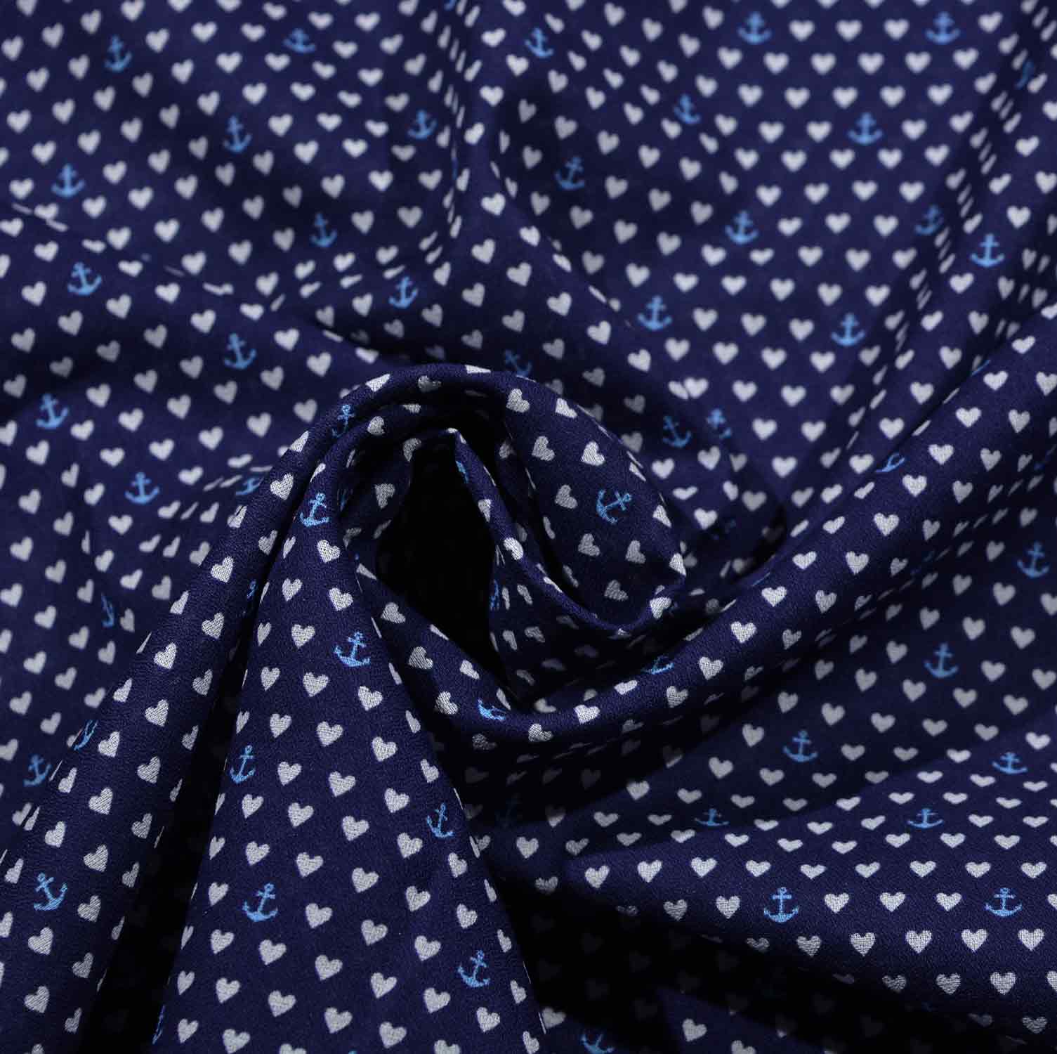 Federleichter Baumwoll-Krepp für sommerliche Mode.Der hauchzarte Stoff ist in klassischem Marineblau gefärbt und mit Herzen und Ankern bedruckt. In ordentlichen Reihen sind winzige, weiße Herzchen auf den Stoff gedruckt. In jeder zweiten Reihe ist jedes vierte Herz durch einen roten Anker ausgetauscht. Ein Hauch von Stoff für für leichte Schals, Tücher, Blusen, Tuniken und Kleider. Zauberhaft.
