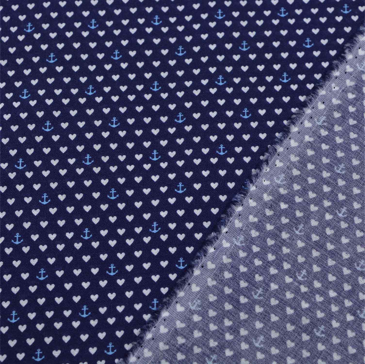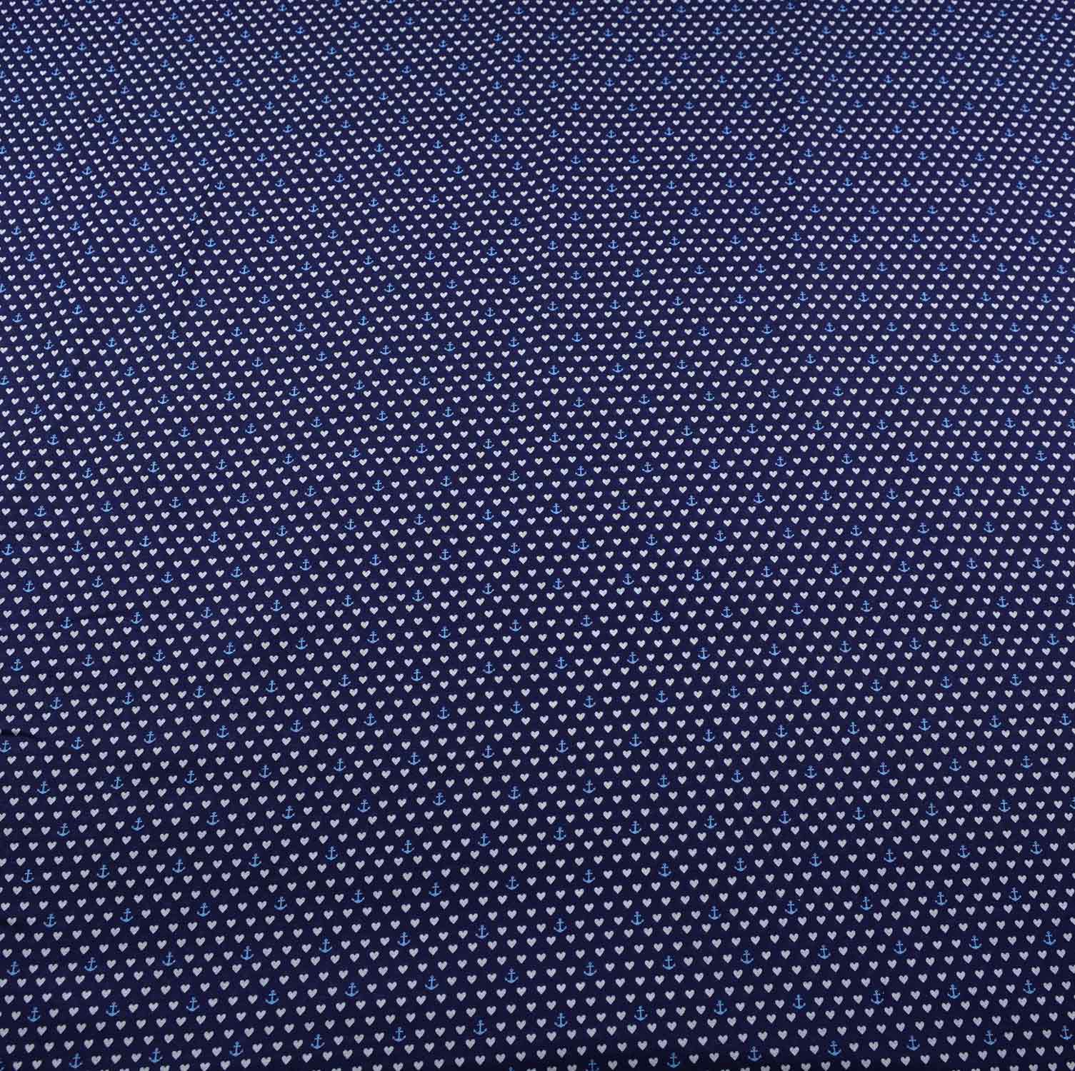 In ordentlichen Reihen sind winzige, weiße Herzchen auf den Stoff gedruckt. In jeder zweiten Reihe ist jedes vierte Herz durch einen blauen Anker ausgetauscht.