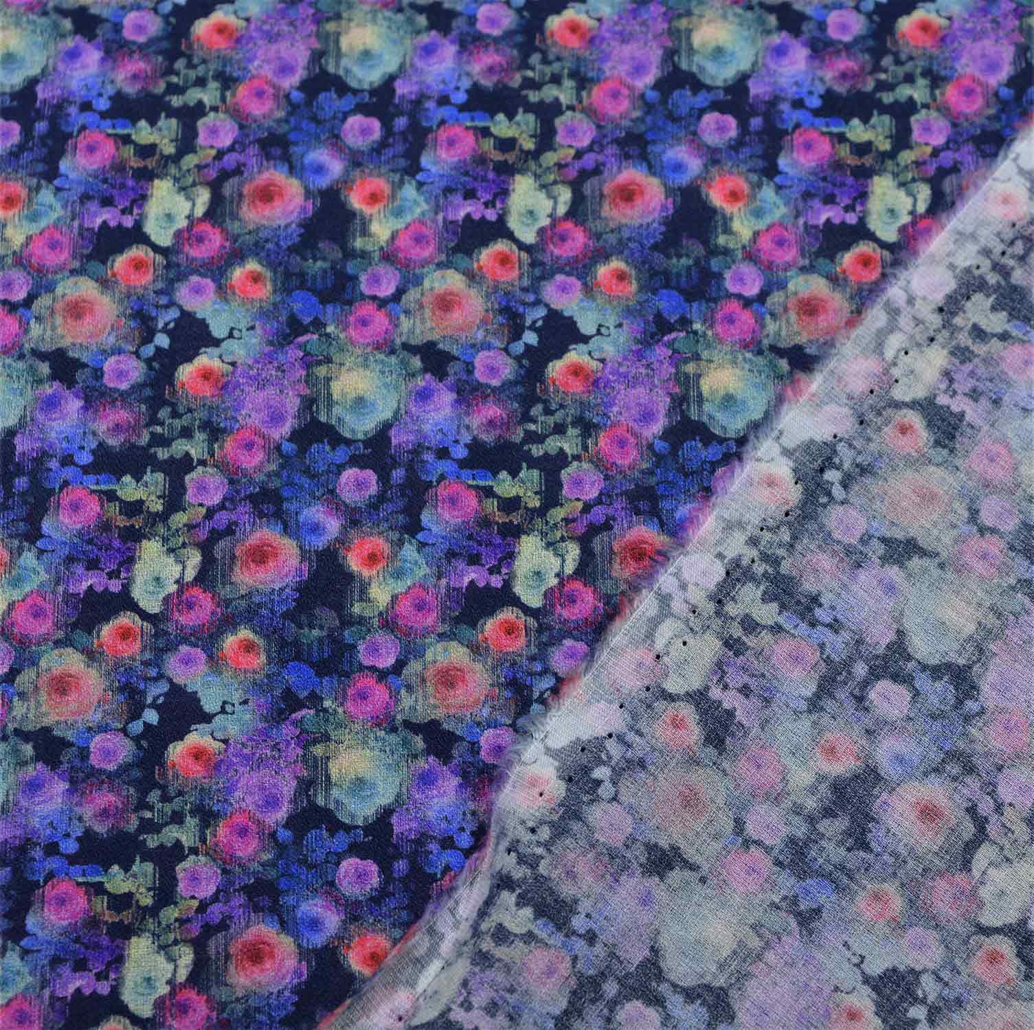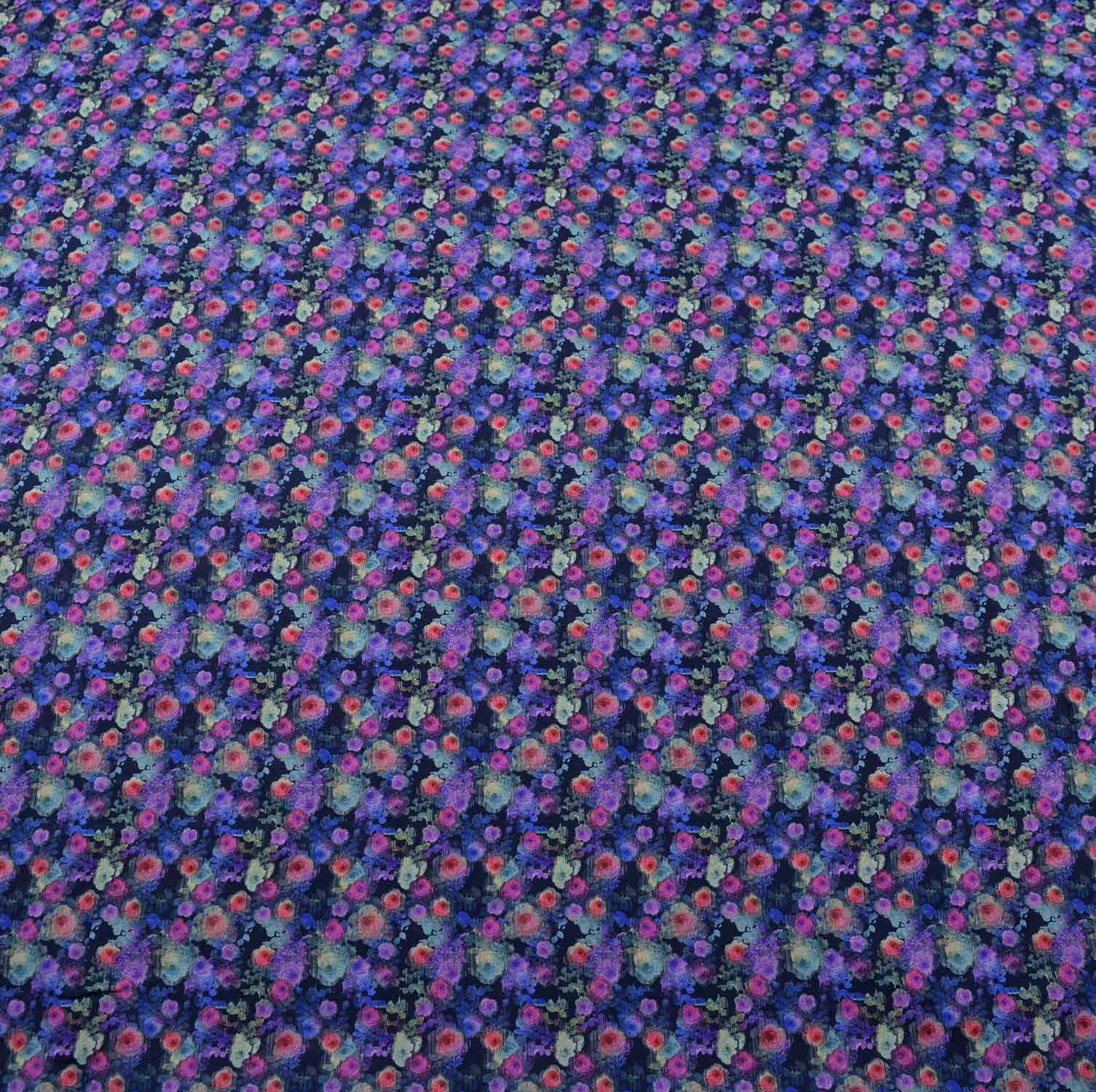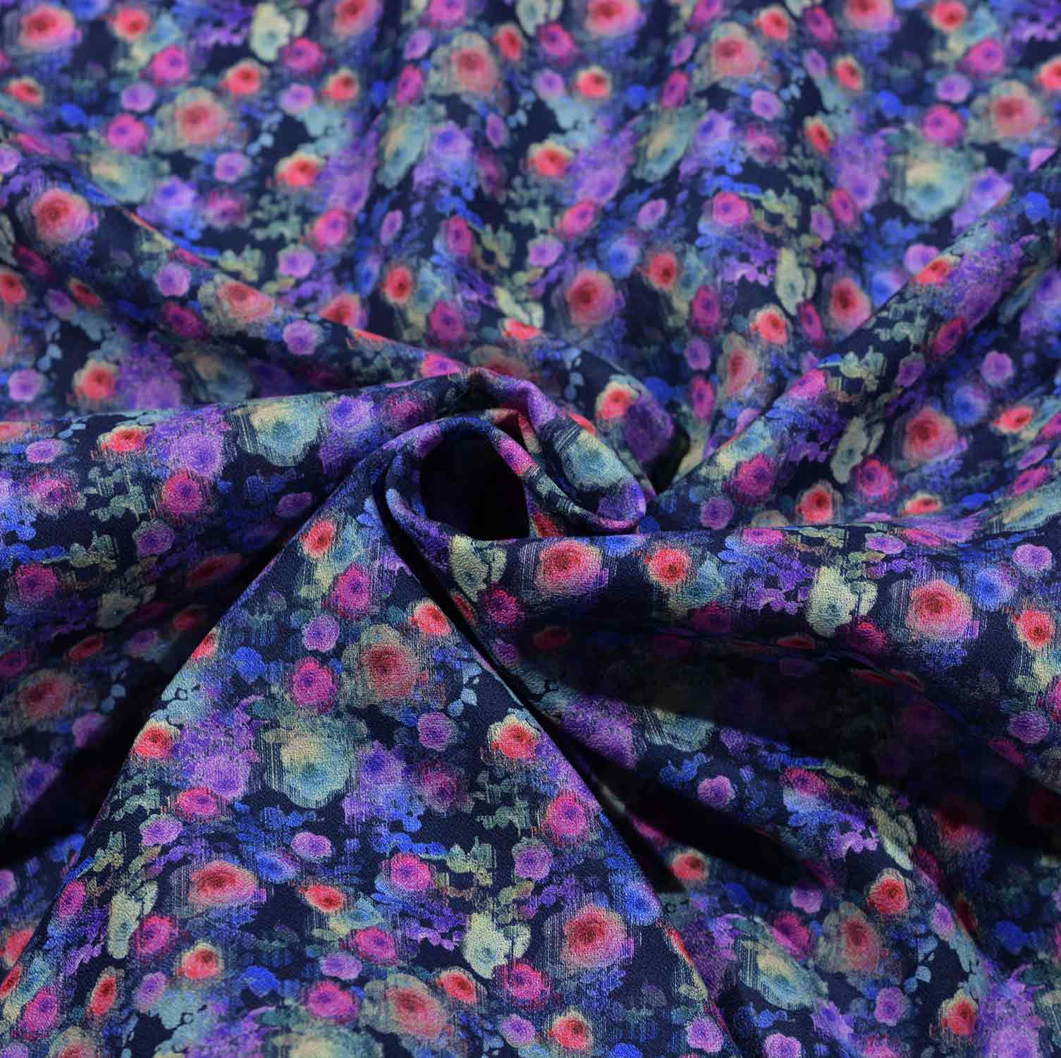 Der hauchzarte Stoff hat einen marineblauen Grund und ist mit einem duftigen, dichten Gewirr kleiner Rosenblüten bedruckt, die in einer herrlichen Farbexplosion aus leuchtenden Tönen bedruckt. Pink, Lila, Blau, Rot und Mint heben sich wunderschön vom dunklen Untergrund ab.