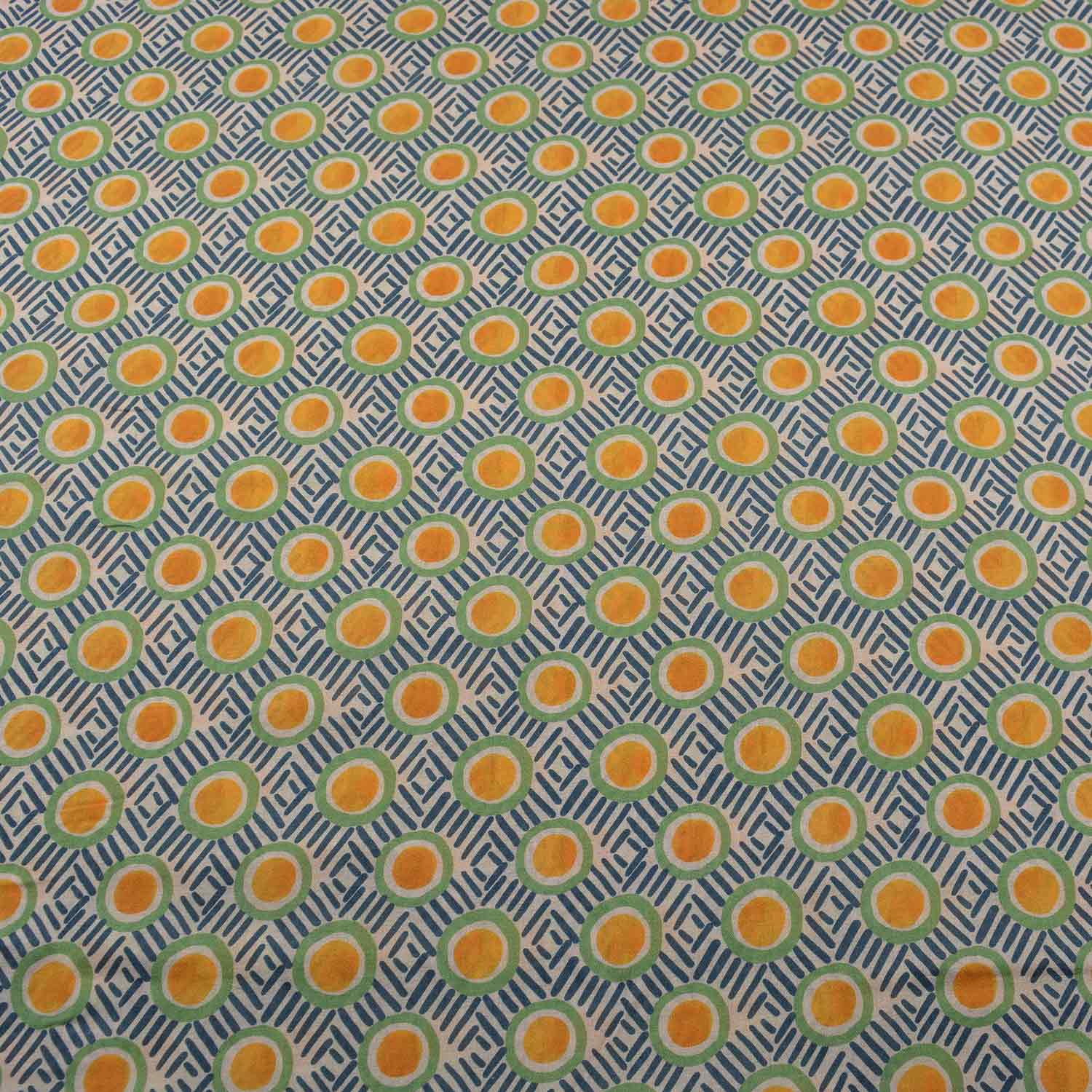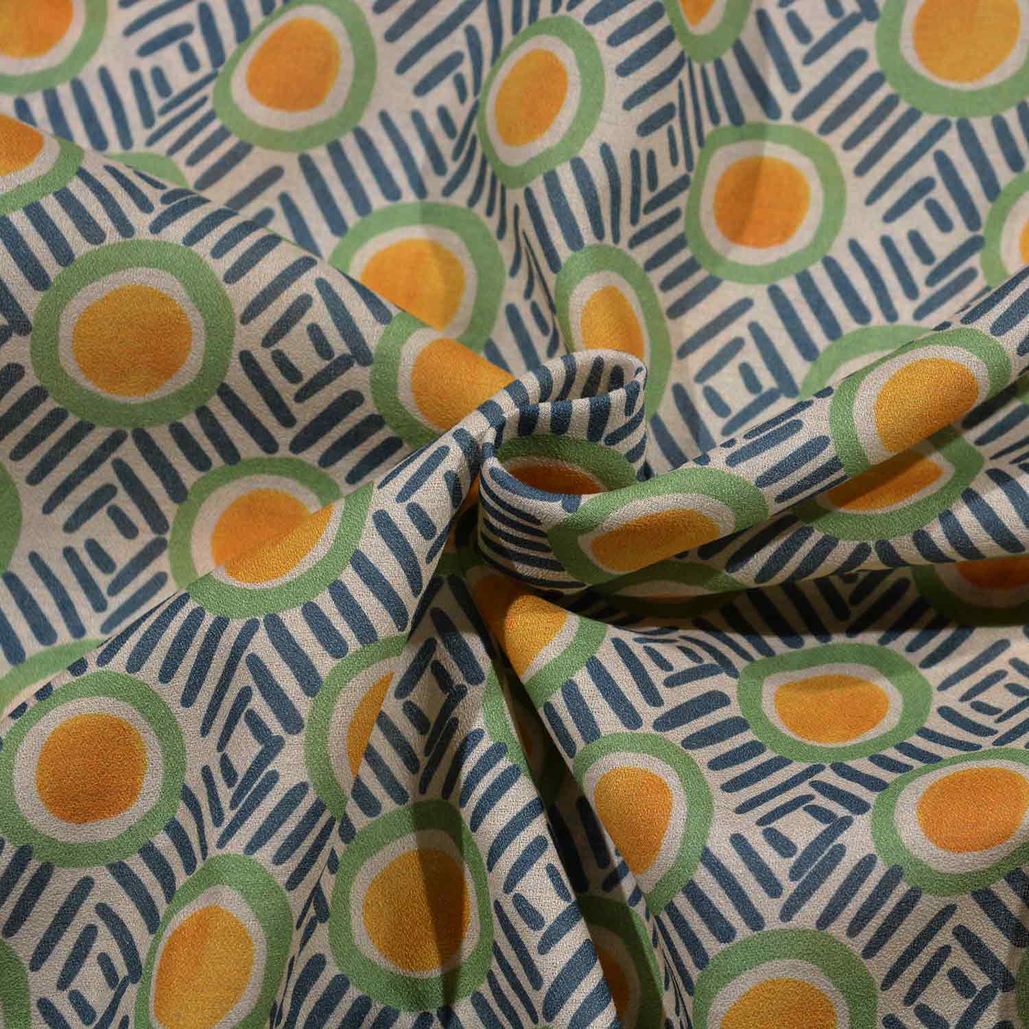 Der hauchzarte Stoff ist in einem Puder-Ton gefärbt und mit Reihen von Kreisen in salbeigrün bedruckt. Die grünen Kreise enthalten einen gelb-orangen Klecks.