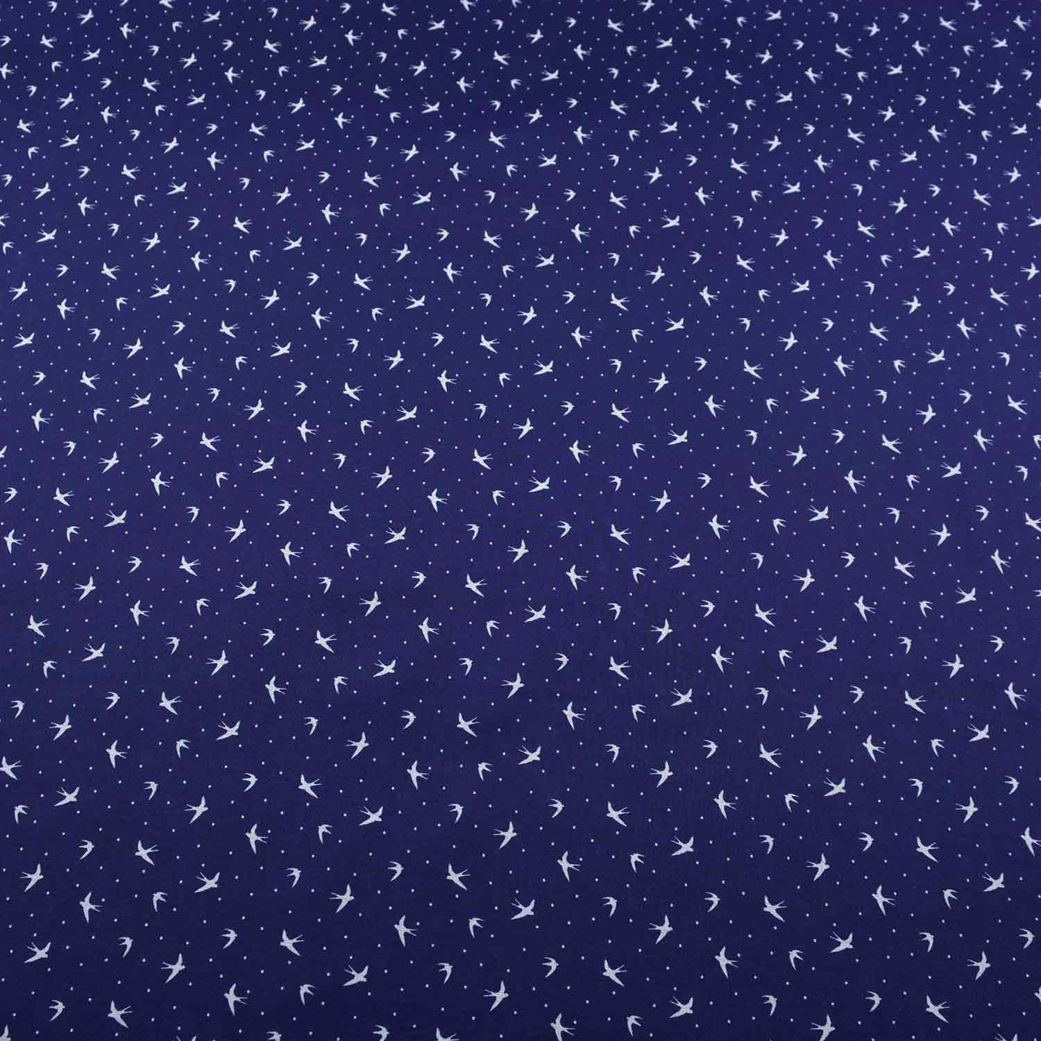 Im Zick Zack schwirren die kleinen weißen Vögel in der klassischen Manier der Schwalben kreuz und quer über den Stoff. Zwischen den Schwalben sind winzige, weiße Pünktchen zu finden.