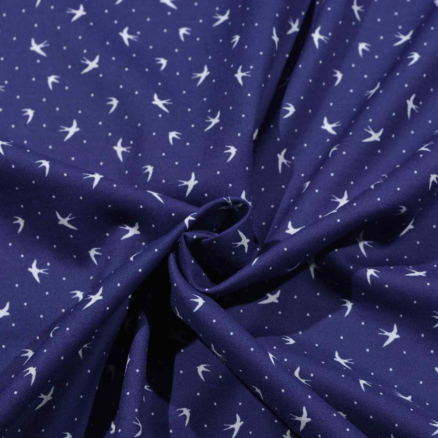 Der hauchzarte Stoff ist in klassischem Marine ist mit weißen Schwalben bedruckt.