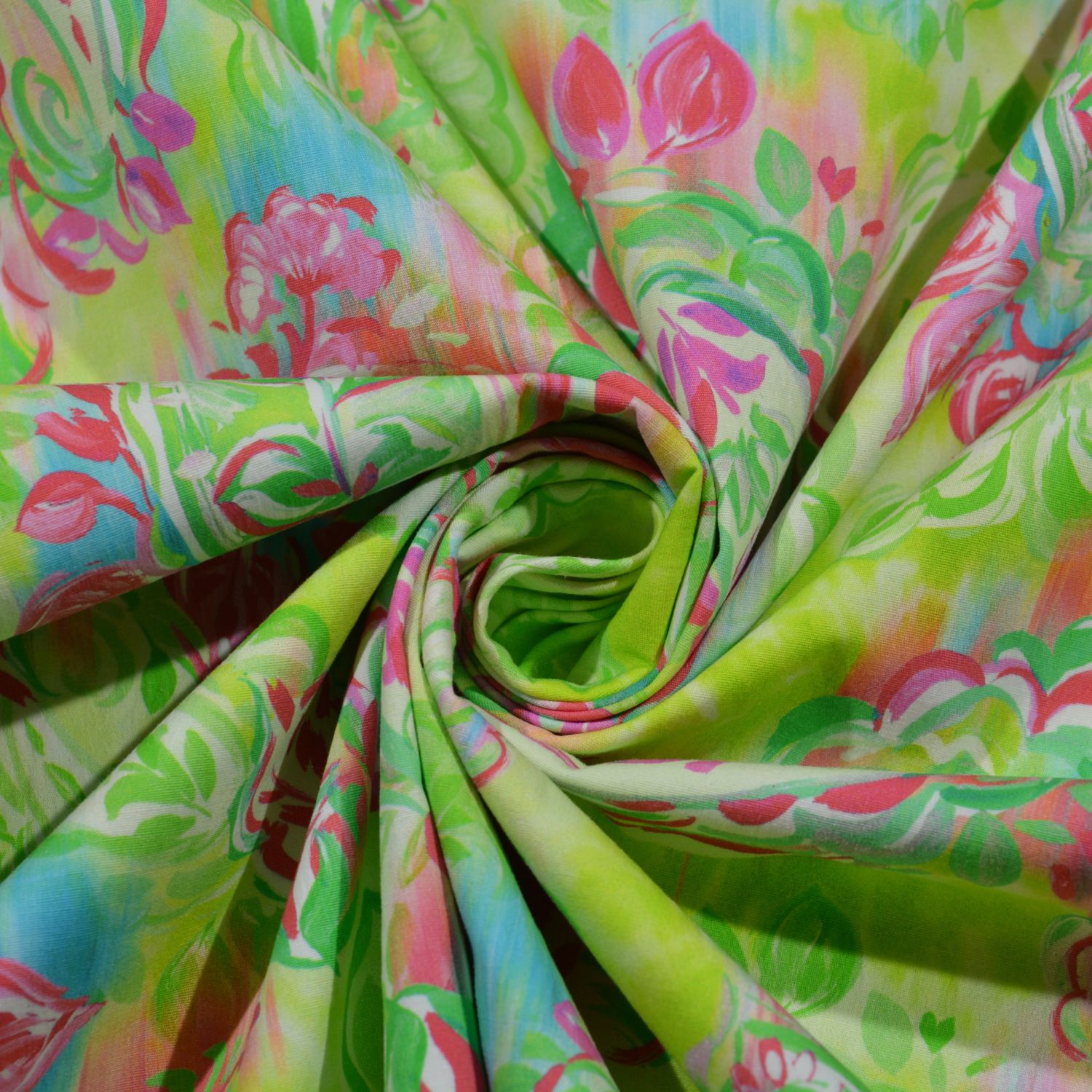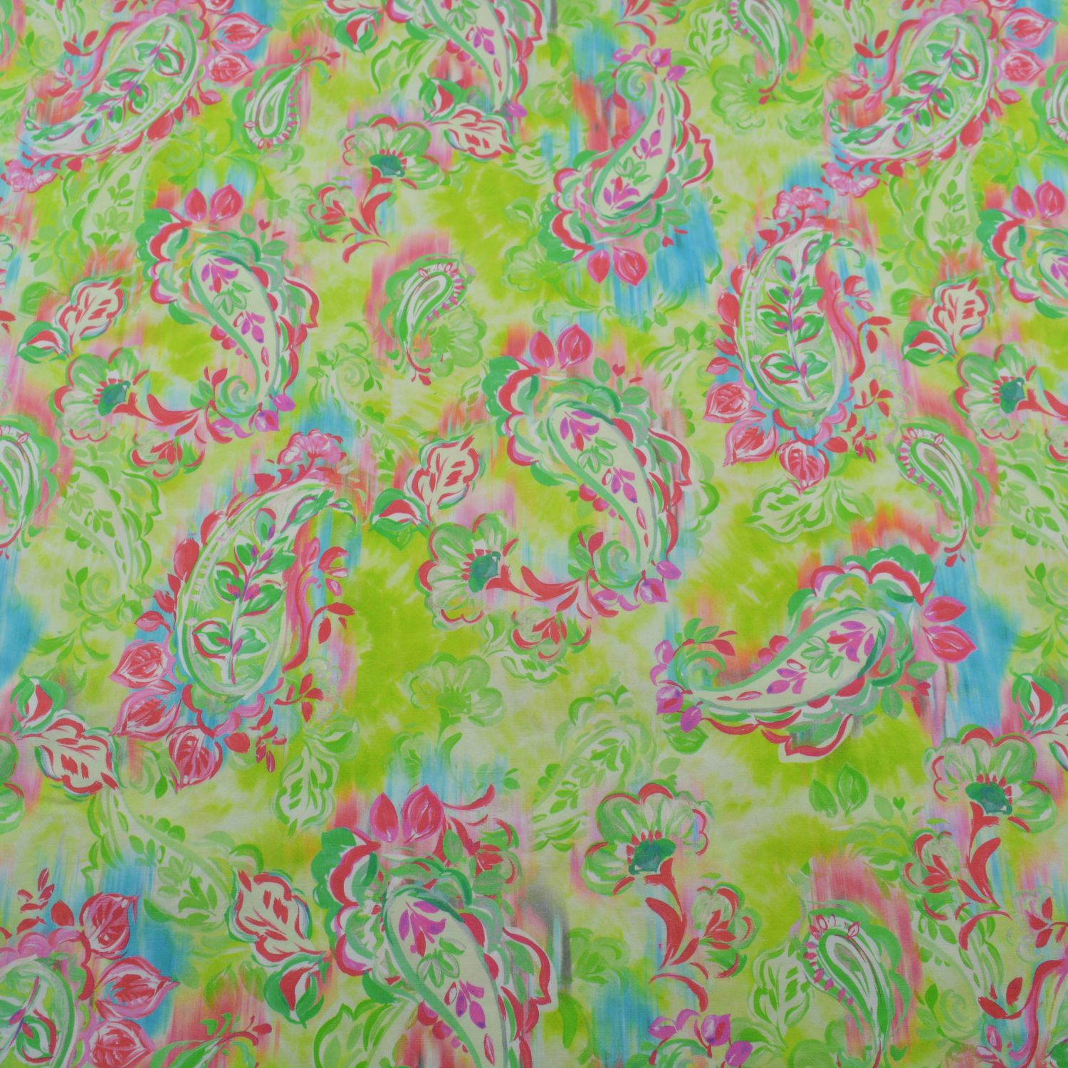 Das Design überzeugt mit einem lebendigen Paisley-Muster in frischen Neonfarben. Leuchtendes Grün bildet die Basis und wird durch pinke, rote und türkise Elemente ergänzt. Die floralen Ornamente und geschwungenen Formen wirken verspielt und gleichzeitig trendbewusst. Der leicht verlaufende Hintergrund erinnert an einen Aquarell- oder Batik-Effekt und sorgt für eine besonders moderne Optik – perfekt für sommerliche Mode und auffällige Einzelstücke.