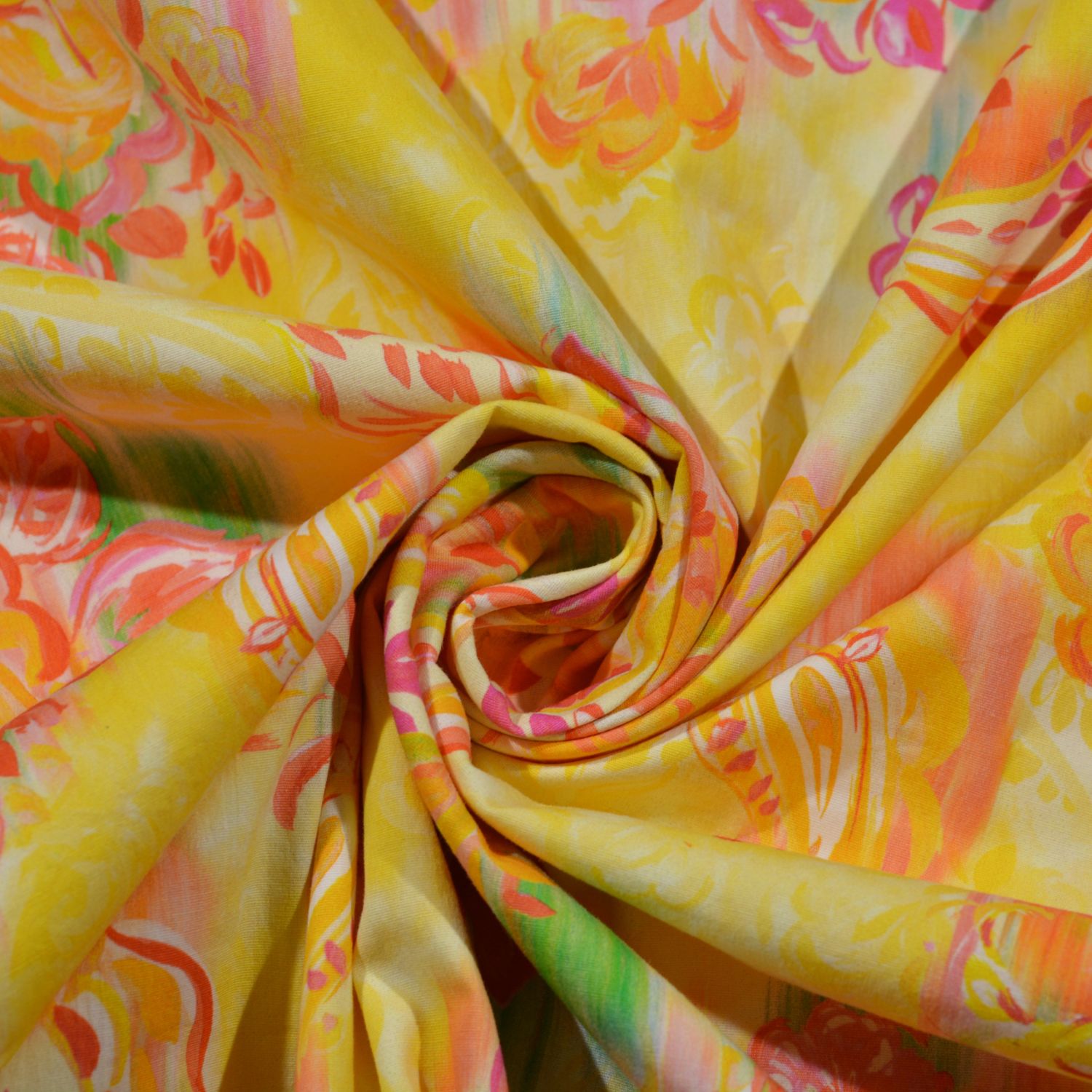 Das Design zeigt ein lebendiges Paisley-Muster in warmen Gelb-, Orange- und Pinktönen. Die floralen Ornamente wirken verspielt und harmonisch, während der Hintergrund mit sanften Farbverläufen und leichtem Batik-Effekt für Tiefe und Modernität sorgt. Die Kombination aus sonnigen Farben und klassischen Paisley-Elementen macht diesen Stoff zu einem echten Hingucker – ideal für auffällige Sommermode.