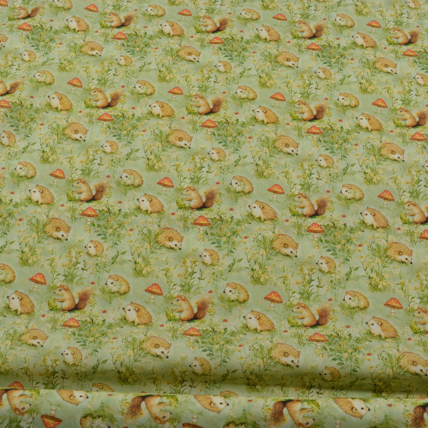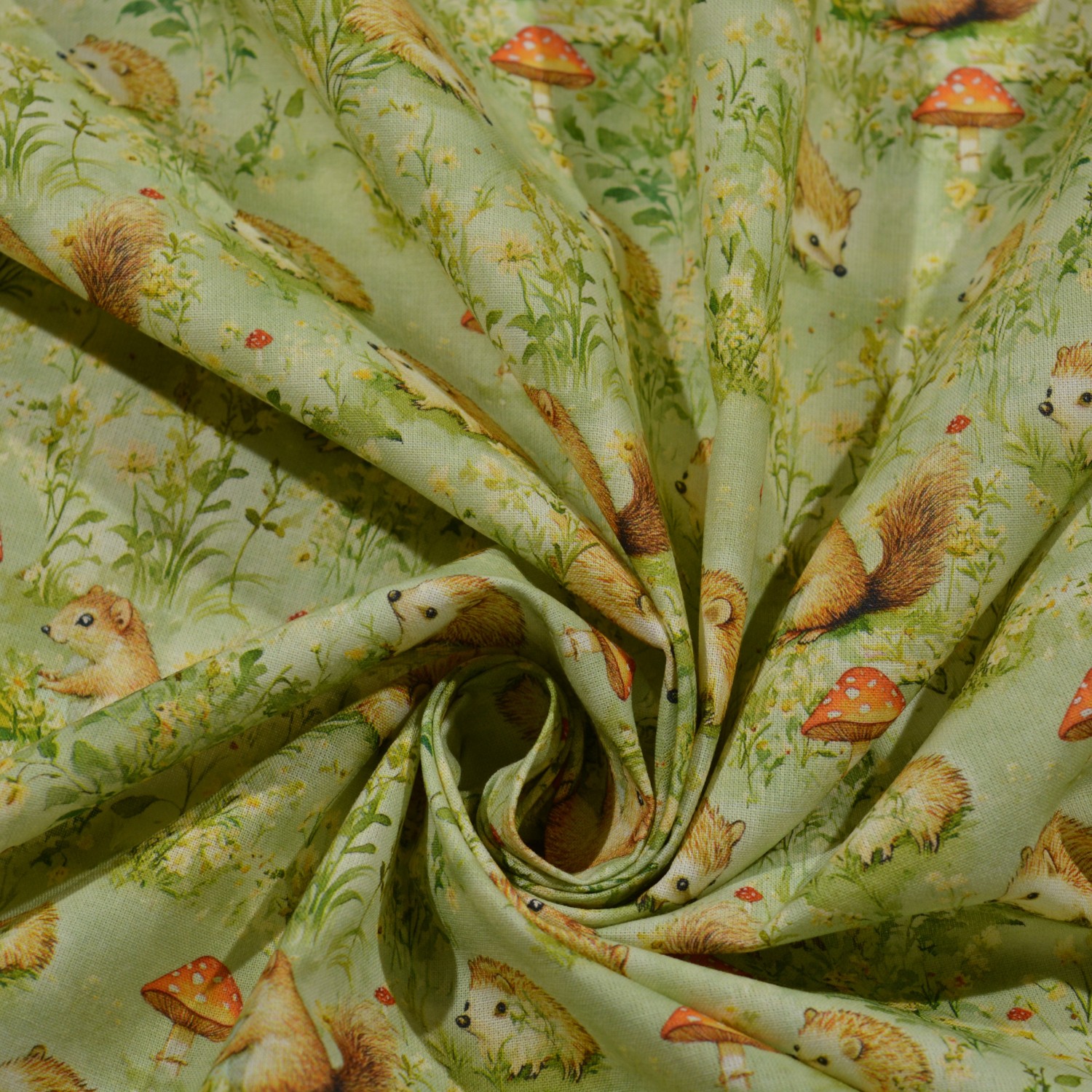 Unser Baumwollstoff „Alhambra“ präsentiert ein liebevoll illustriertes Waldmotiv mit Igeln, Eichhörnchen, Pilzen und zarten Wiesenpflanzen auf sanft grünem Hintergrund. Der hochwertige Digitaldruck überzeugt mit feinen, natürlichen Farben und außergewöhnlicher Detailtreue – perfekt für kreative Nähideen mit Charme.