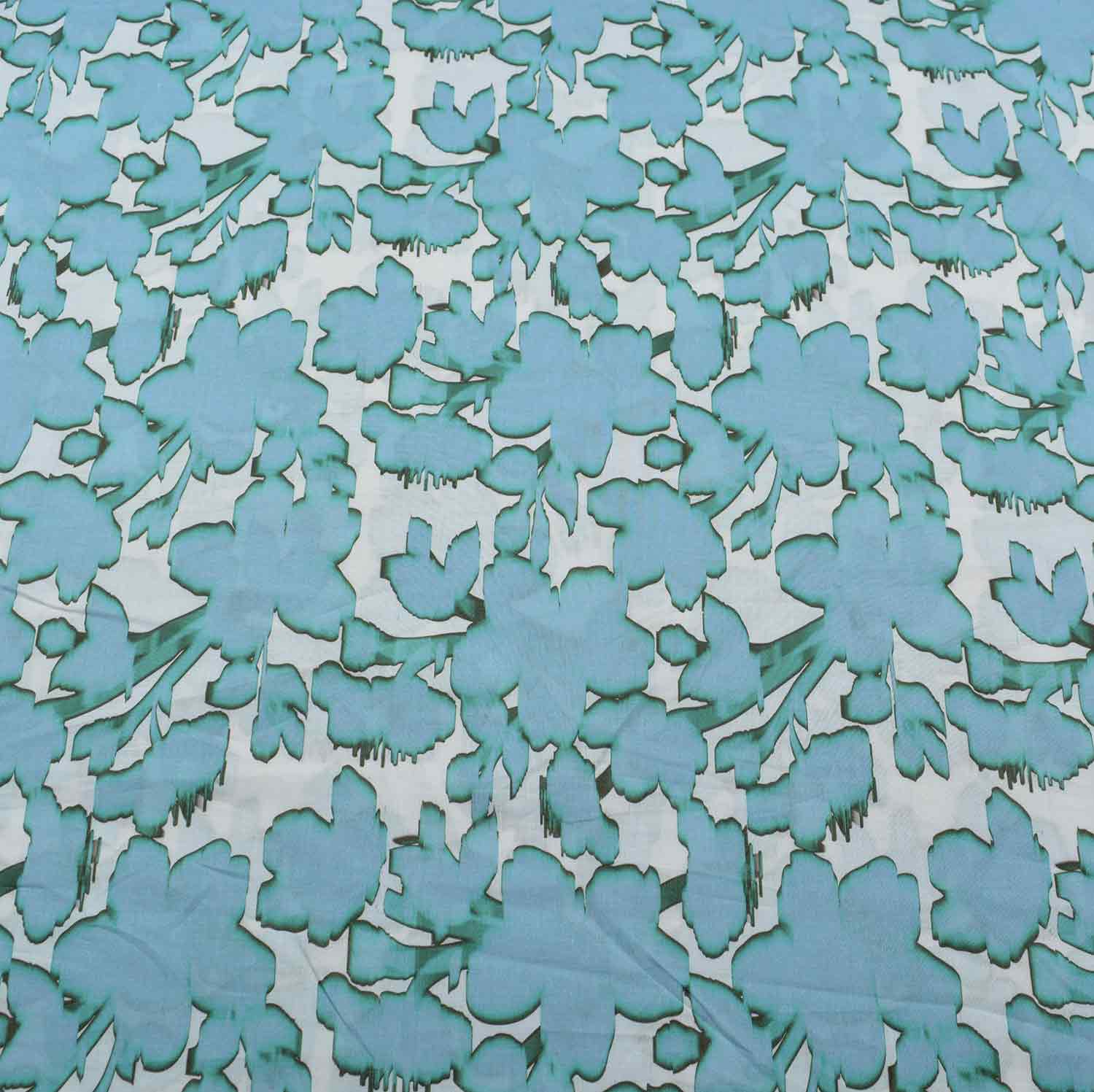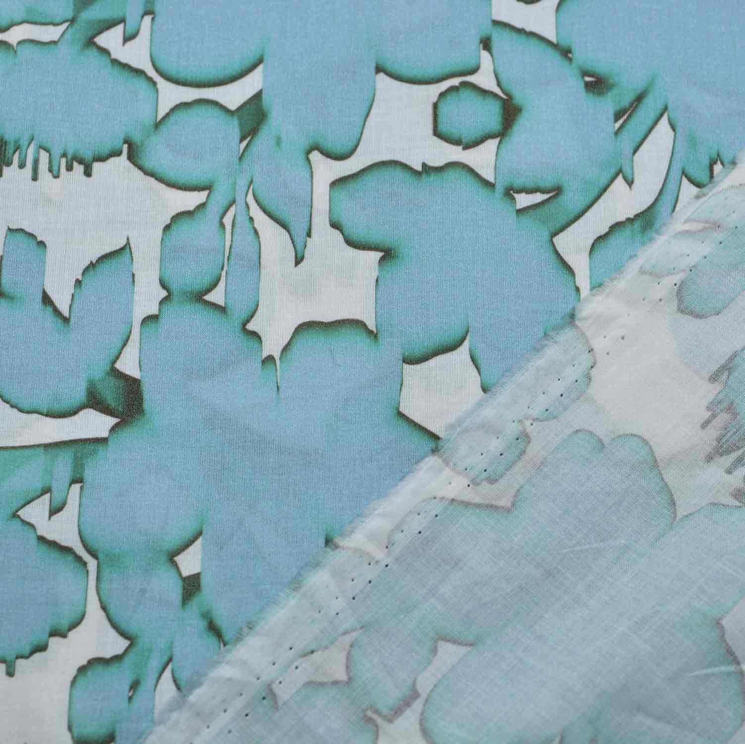 Der weiße Untergrund ist mit großen, stahlblauen Blumen bedruckt, die aussehen, als wären Sie mit Wasserfarben getuscht. Zum äußeren Rand hin laufen die Konturen in eine Farbkante aus, die über Türkis zu einem dunklen Grau wird, als würden sich die Farbpigmente außen anlagern.