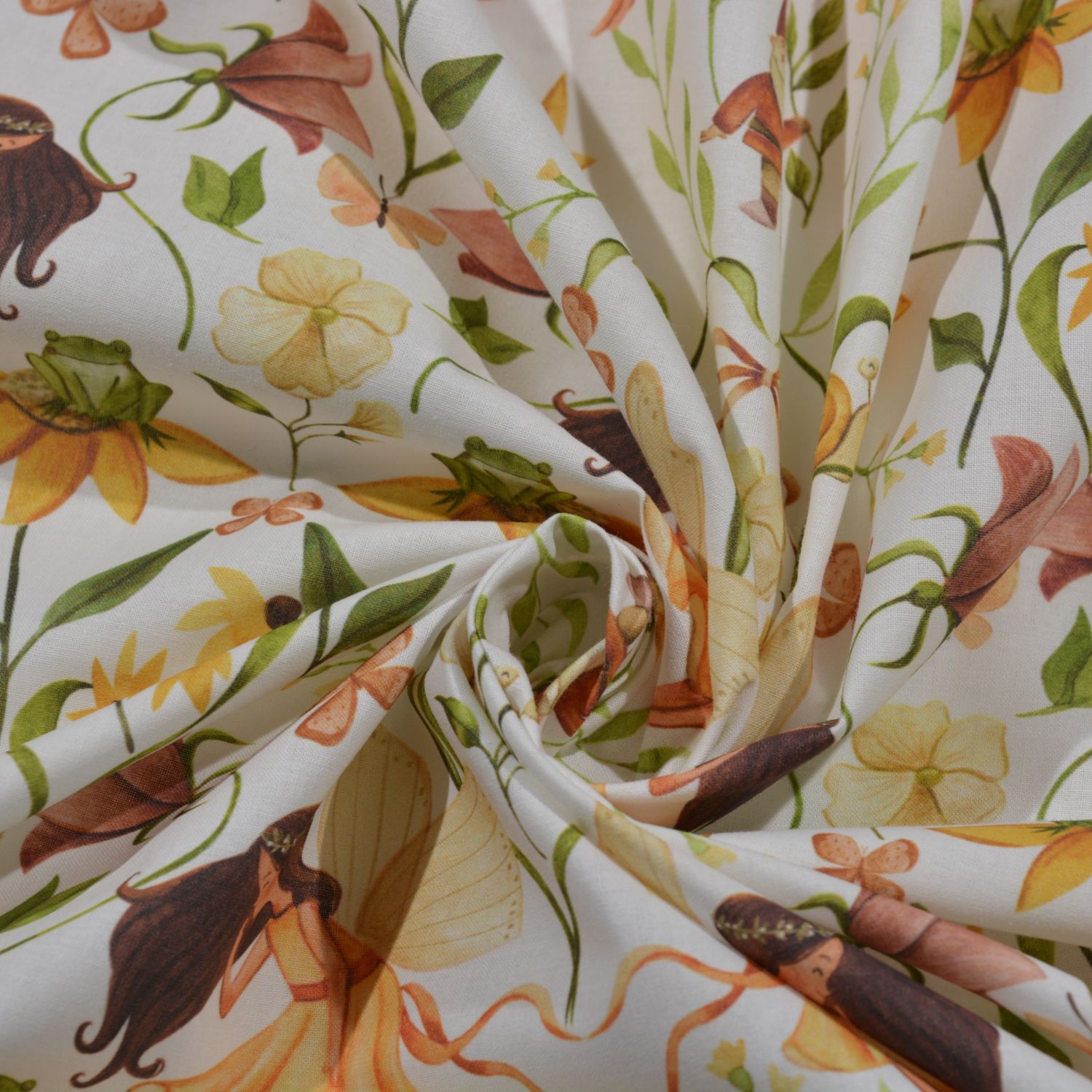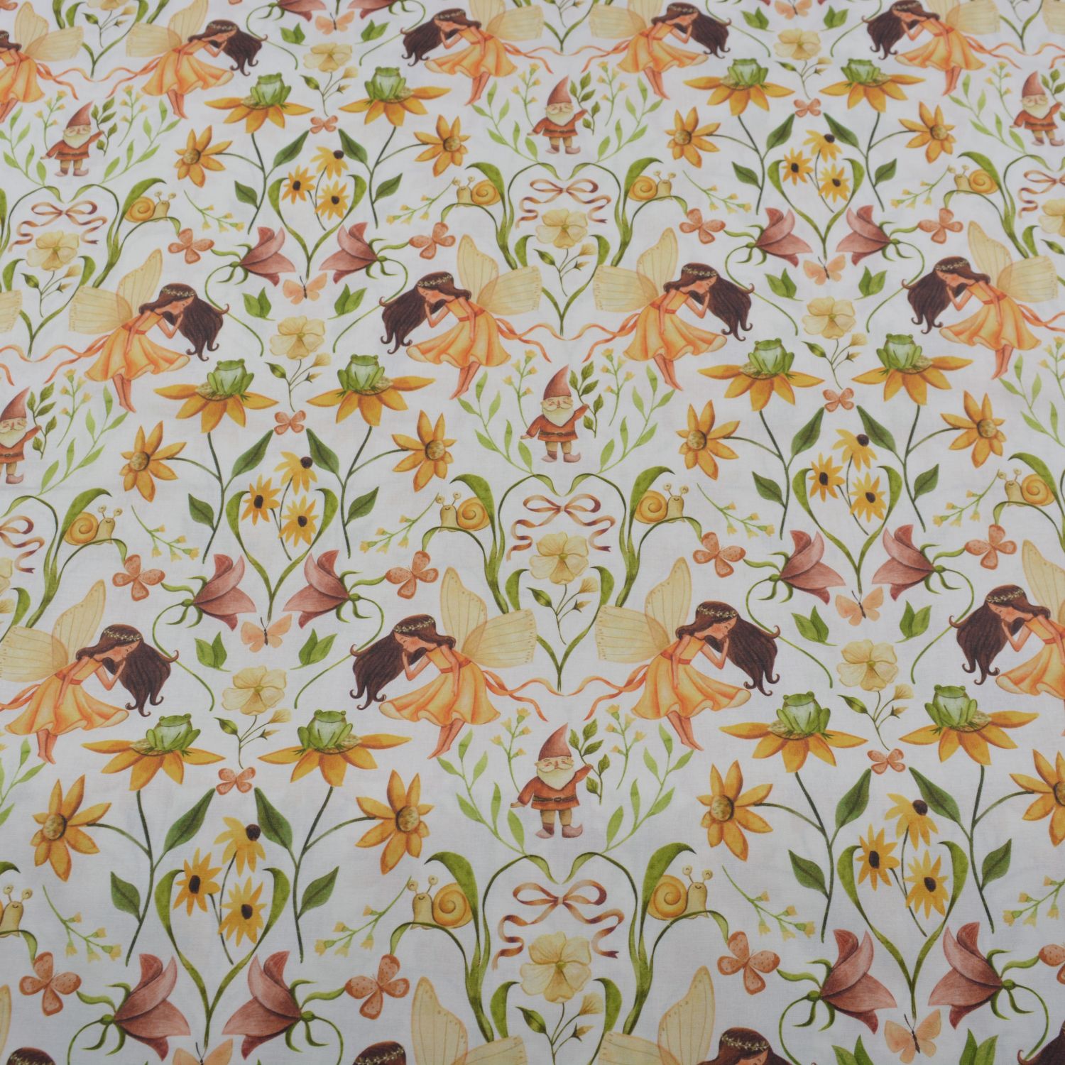 Dieser bezaubernde Baumwollstoff zeigt ein detailreiches Märchenmotiv mit zarten Blumenfeen, kleinen Zwergen, Schnecken und floralen Elementen. Die warmen Naturfarben mit Gelb-, Grün- und Apricottönen verleihen dem Stoff eine harmonische und verspielte Ausstrahlung. Die liebevoll gestalteten Blumen, Blätter und kleinen Waldbewohner schaffen eine märchenhafte Atmosphäre auf dem hellen Hintergrund.