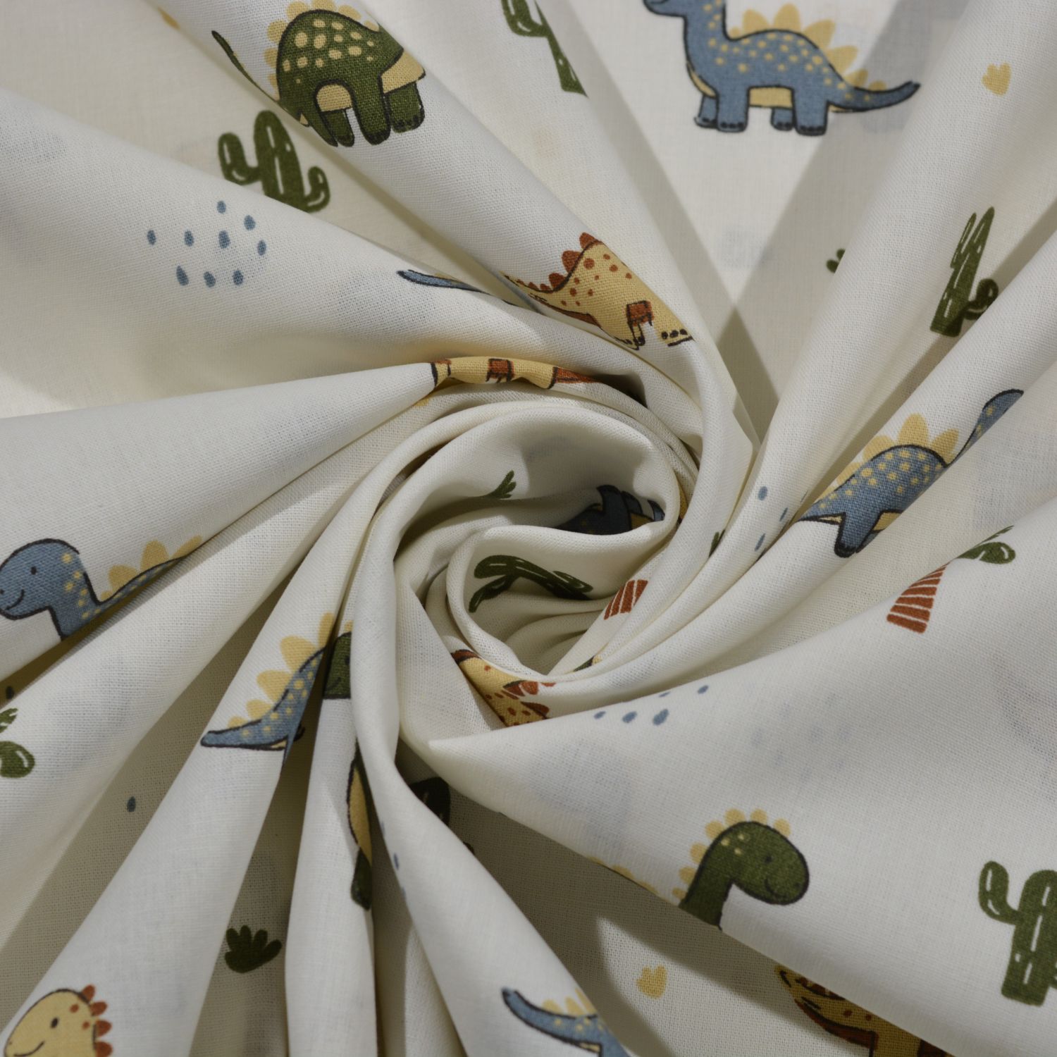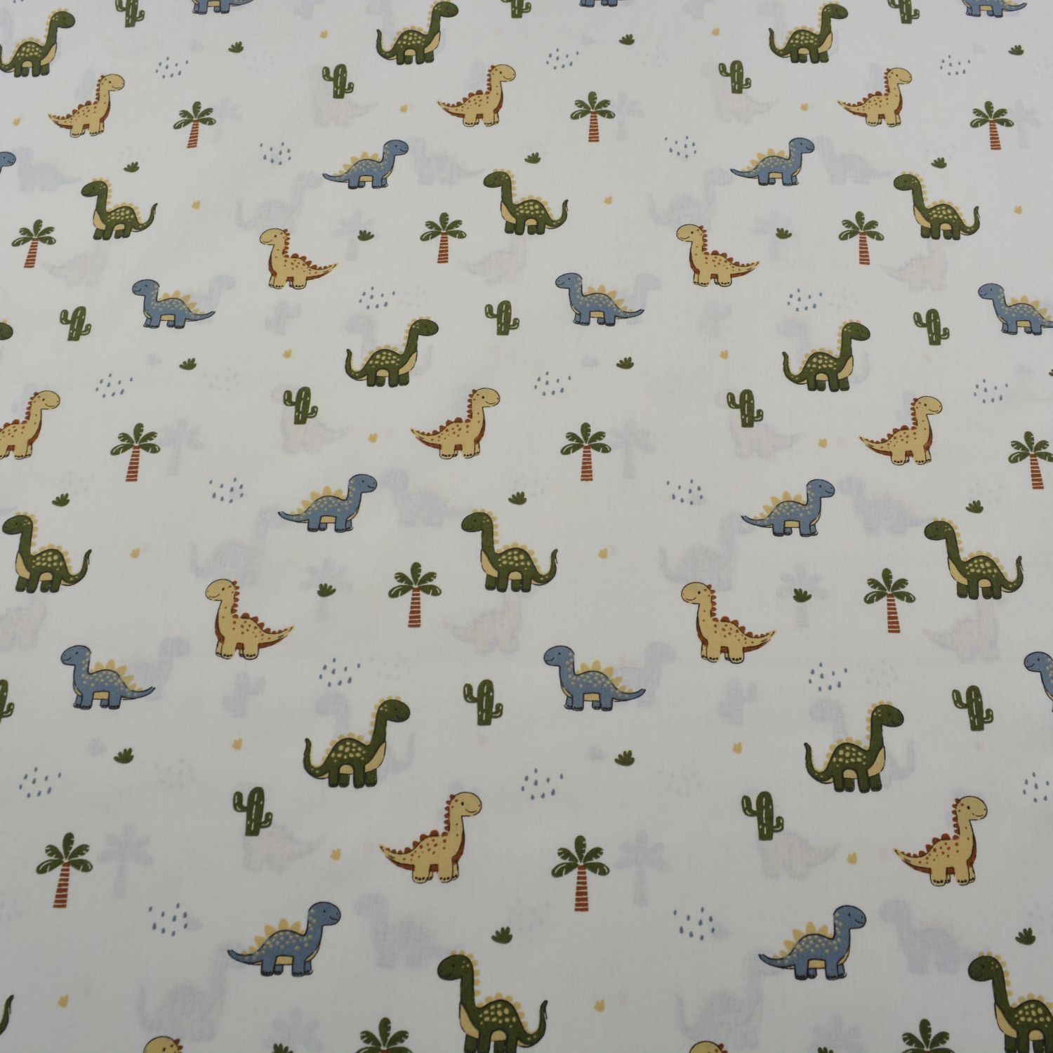 Dieser hochwertige Baumwollstoff begeistert mit einem liebevollen Dinosaurier-Motiv auf hellem Hintergrund. Kleine Dinos in verschiedenen Farben, kombiniert mit Palmen, Kakteen und kleinen Details, verleihen dem Stoff eine verspielte und kindgerechte Optik.