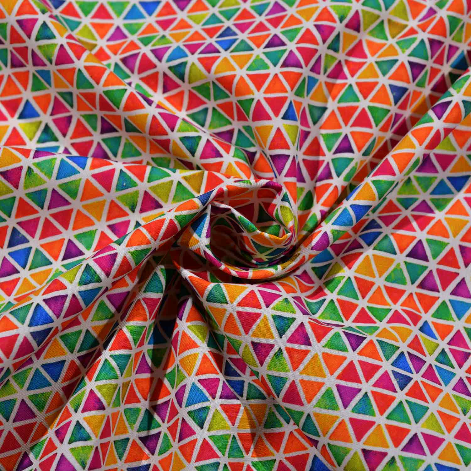 Dieser feine, weiße Baumwollstoff ist mit einem nahtlosen Netz von Dreiecken bedruckt.