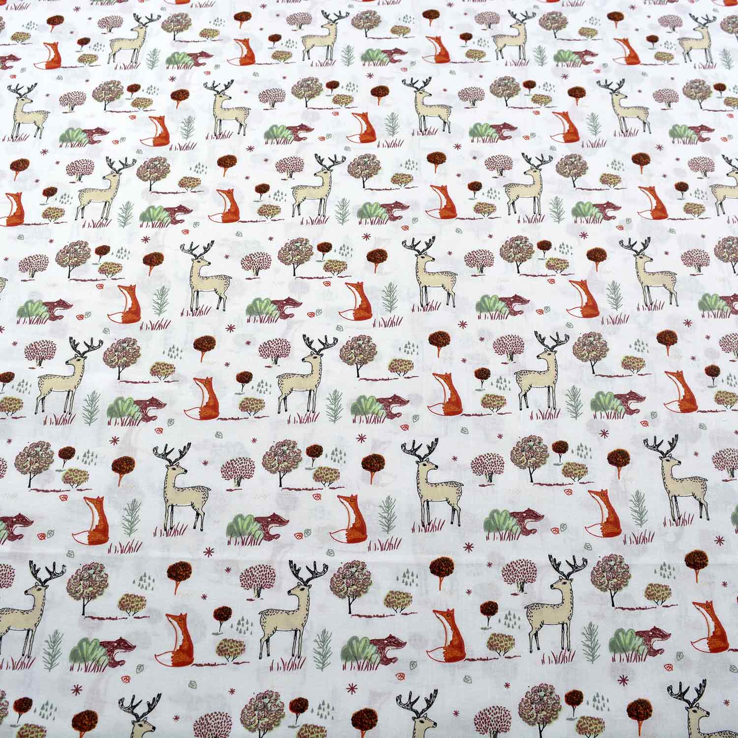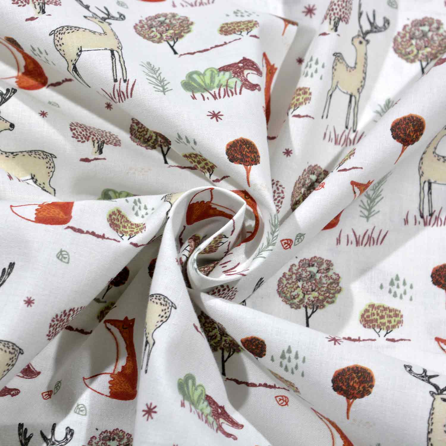 Dieser entzückende Kinderstoff zeigt Sträucher, Bäume und Blätter in Braun und Grün-Tönen. Ein stolzer Hirsch steht neben einem süßen Fuchs, während ein Dachs sich hinter einem Busch versteckt.