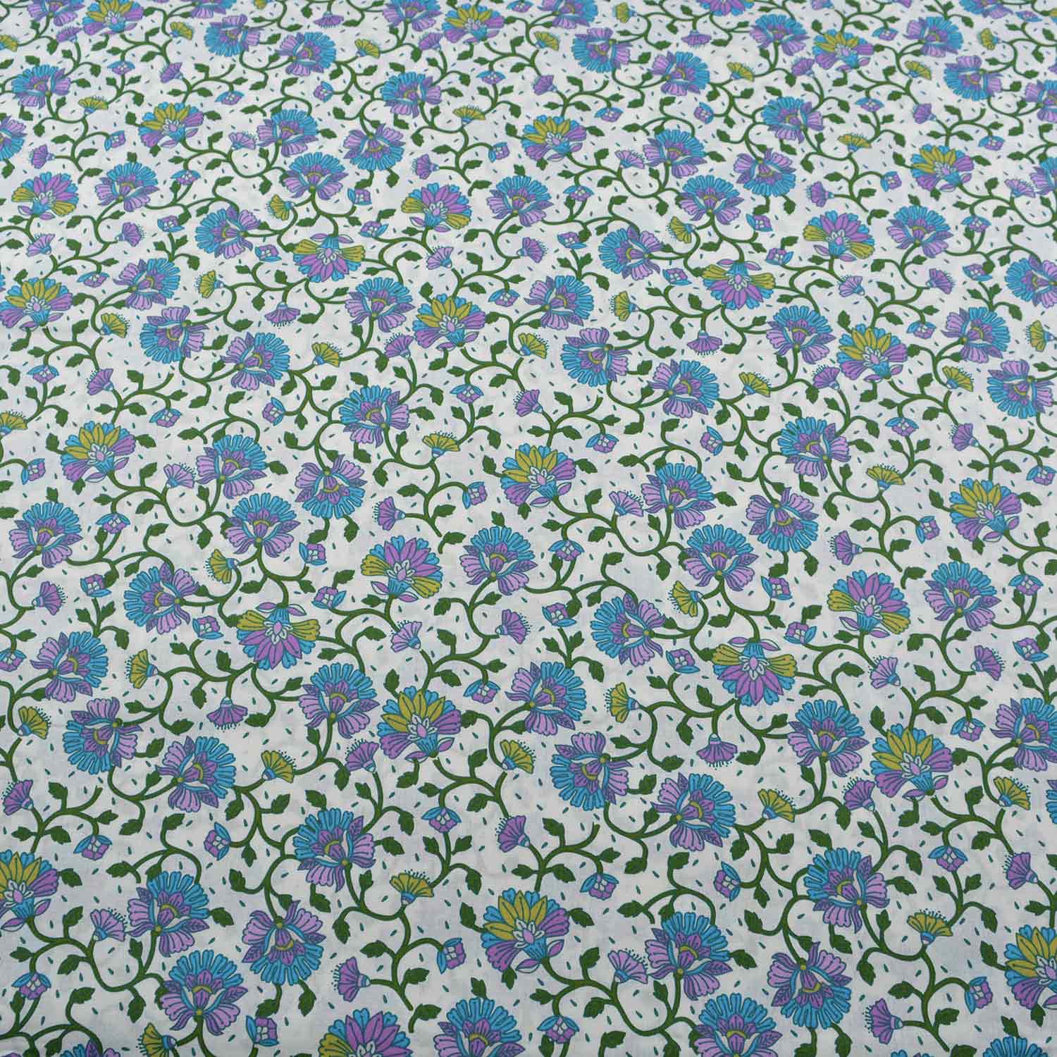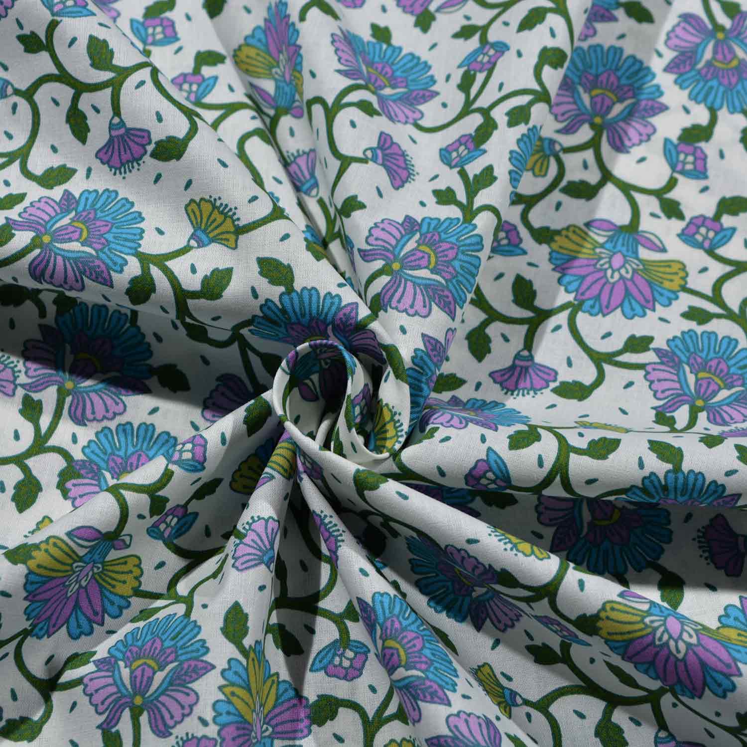 Dieser feminine Baumwollstoff ist mit einem wunderbaren Blumen-Motiv bedruckt. Der wollweiße Untergrund ist mit dunkelgrünen Ranken bedeckt, von denen kleine Blätter abgehen und üppige Blüten mit Blütenblättern in Petrol, Flieder und Rosa. Dazu gibt es Blütenakzente in gelbgrün.