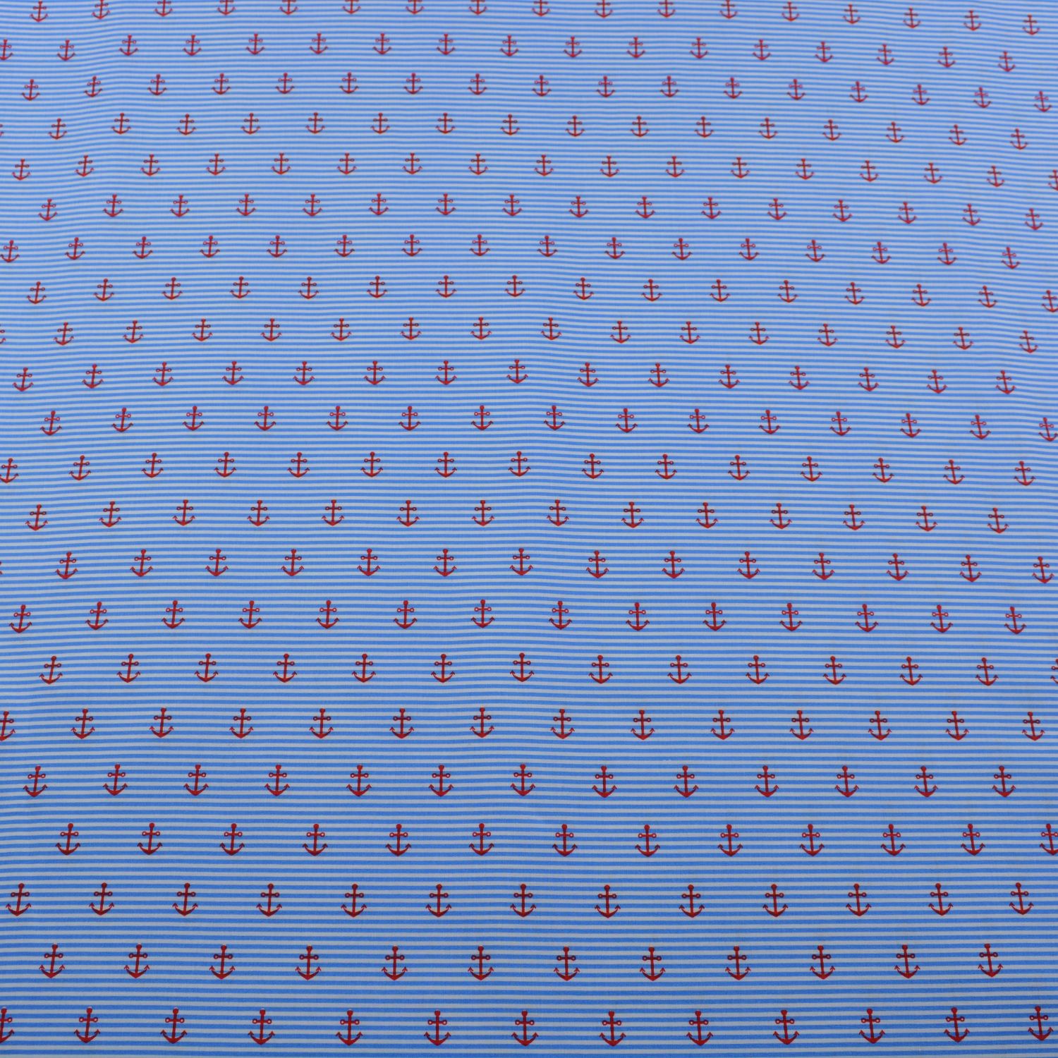 Dieser hochwertige Baumwollstoff „Mario“ begeistert mit einem klassischen maritimen Design. Auf einem hellblauen, fein gestreiften Hintergrund verteilen sich kleine rote Anker gleichmäßig als Allover-Muster. Die Kombination aus Streifen und Ankern sorgt für einen zeitlosen, frischen Look, der besonders gut zu maritimen Nähprojekten passt.