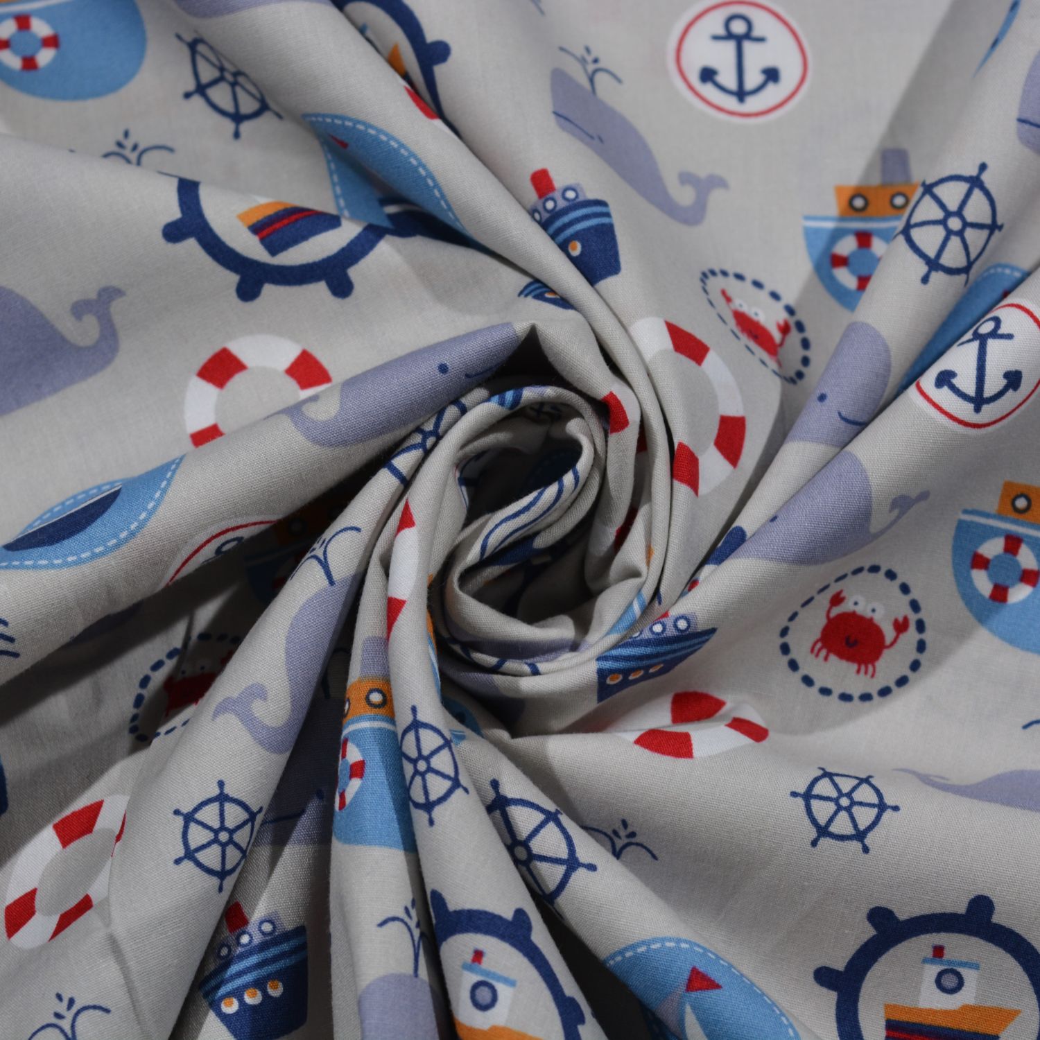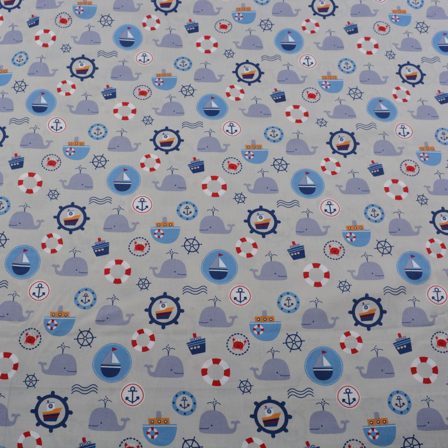 Dieser bedruckte Baumwollstoff begeistert mit einem liebevoll gestalteten maritimen Allover-Print aus Schiffen, Ankern, Rettungsringen, Walen und nautischen Symbolen. Die harmonische Farbgebung in Blau, Rot und Weiß macht den Stoff besonders vielseitig und zeitlos.