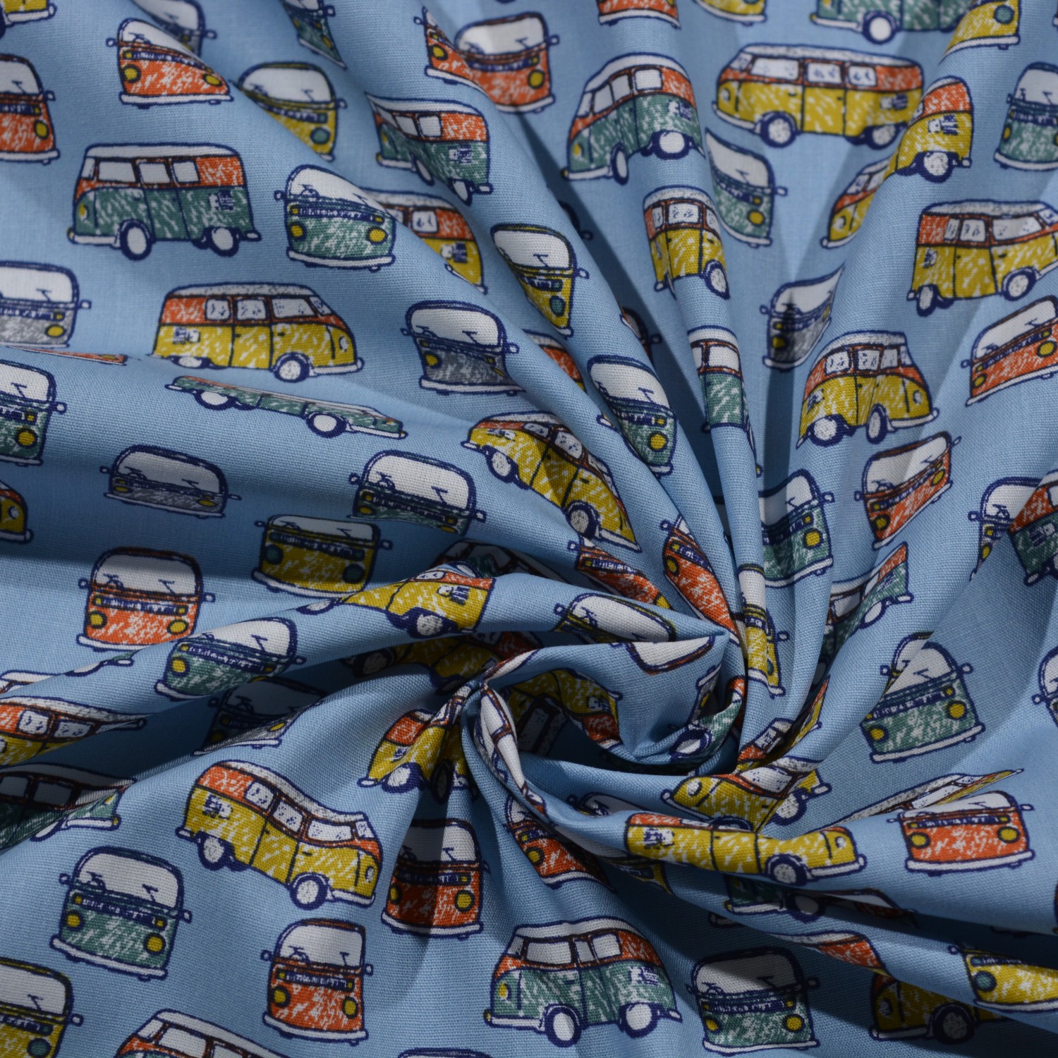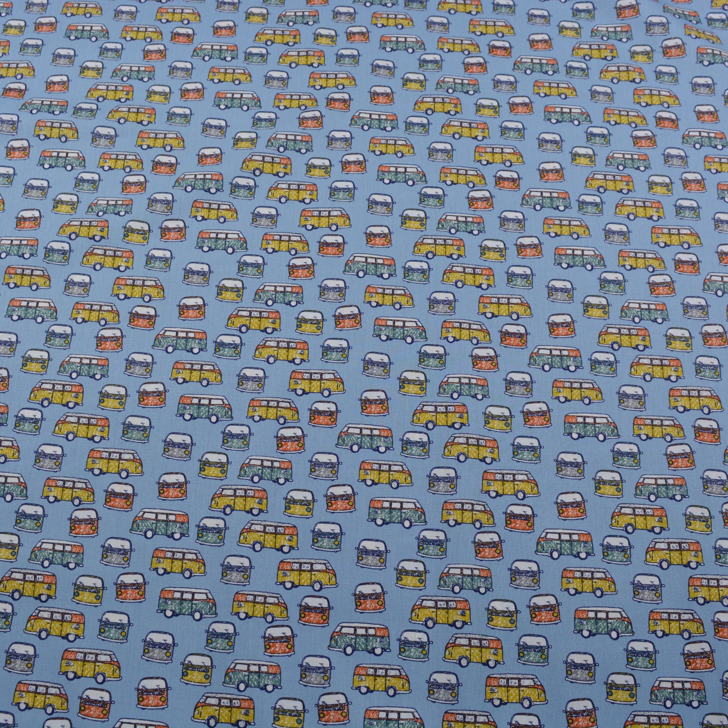 Baumwollstoff – Bunte Retro-Bullis auf Hellblau