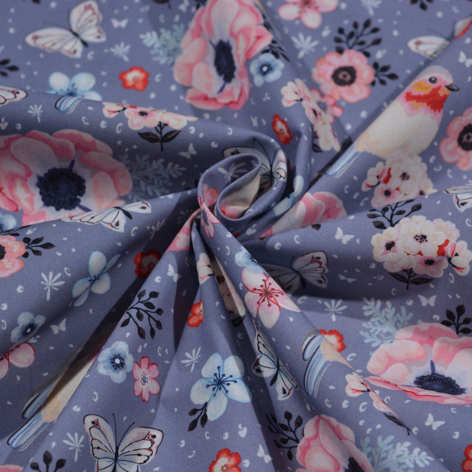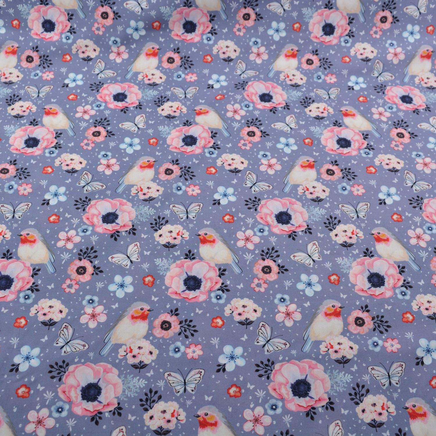 Willkommen in der verzauberten Welt der Baumwollwebware mit einem blaufarbenen Hintergrund und zauberhaften Rotkehlchen, Blüten, Schmetterlingen und Blumen! Dieser hochwertige Stoff entführt Sie in eine traumhafte Umgebung, in der die Natur in voller Blüte steht und die Schönheit des Lebens zum Ausdruck kommt.Der blaufarbene Hintergrund verleiht dem Stoff eine beruhigende und gleichzeitig erfrischende Atmosphäre, während die leuchtenden Farben der Rotkehlchen, Blüten, Schmetterlinge und Blumen mit einem rosa Touch eine romantische und verspielte Note setzen.Die Baumwollwebware ist nicht nur optisch ansprechend, sondern auch angenehm im Griff. Sie eignet sich perfekt für die Herstellung von Kleidung, Heimtextilien, Accessoires und vielen anderen Nähprojekten. Mit diesem Stoff können Sie einzigartige und liebevolle Kreationen gestalten, die die Schönheit der Natur und die Zerbrechlichkeit des Lebens zum Ausdruck bringen.Lassen Sie sich von der Baumwollwebware in blau mit den zauberhaften Naturmotiven verzaubern und kreieren Sie einzigartige Nähprojekte, die die Schönheit der Natur einfangen. Egal ob für Kleidung, Dekorationen oder Geschenke - dieser Stoff wird Ihre Kreationen mit Romantik und verspielter Eleganz bereichern. Bringen Sie die Schönheit der Natur in Ihre Nähkreationen und lassen Sie Ihre Projekte erblühen!