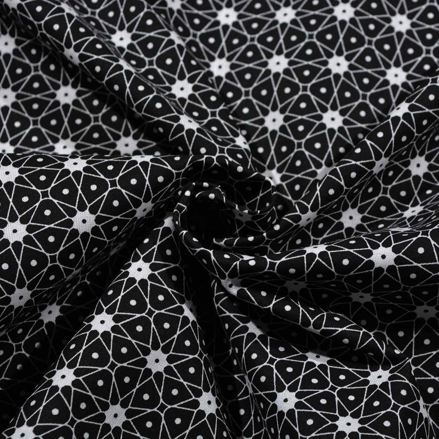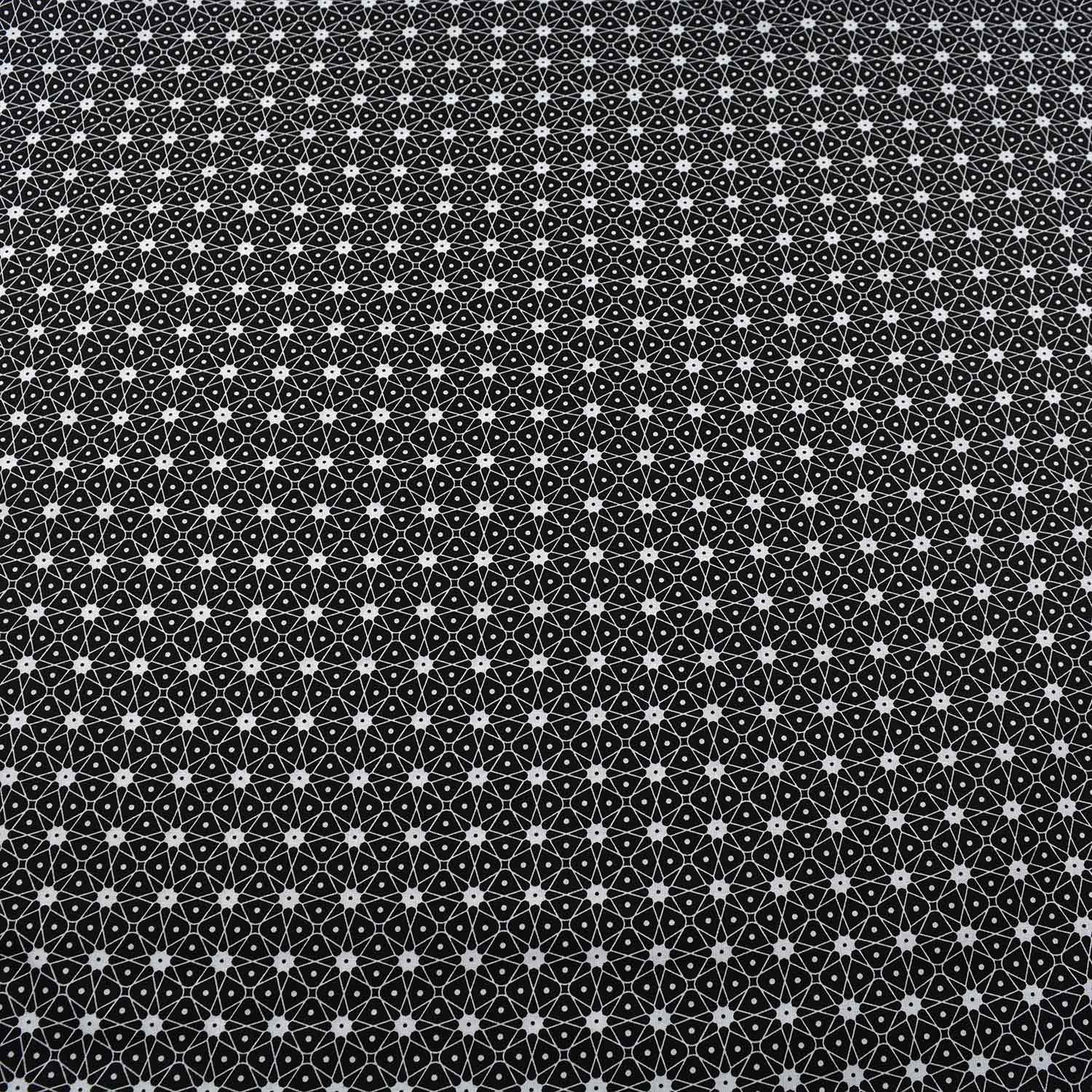 Zauberhafte Baumwoll-Serie mit grafischem Dessin. Auf dem dunkelgrünen Untergrund ist ein weißes Linienmuster aufgebracht, das von weißen Blumen oder Sternen ausgeht und ein Muster erzeugt, dass eben an Blumen oder Sterne erinnert. Je nachdem, wie man das interpretiert. Ein interessantes, regelmäßiges Dessin, das sich toll für Patchwork-Arbeiten und Deko-Ideen eignet, aber auch für Kleidung geeignet ist.