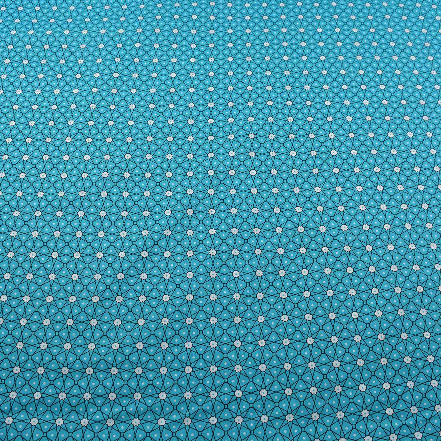 Zauberhafte Baumwoll-Serie mit grafischem Dessin. Auf dem dunkelgrünen Untergrund ist ein weißes Linienmuster aufgebracht, das von weißen Blumen oder Sternen ausgeht und ein Muster erzeugt, dass eben an Blumen oder Sterne erinnert. Je nachdem, wie man das interpretiert. Ein interessantes, regelmäßiges Dessin, das sich toll für Patchwork-Arbeiten und Deko-Ideen eignet, aber auch für Kleidung geeignet ist.
