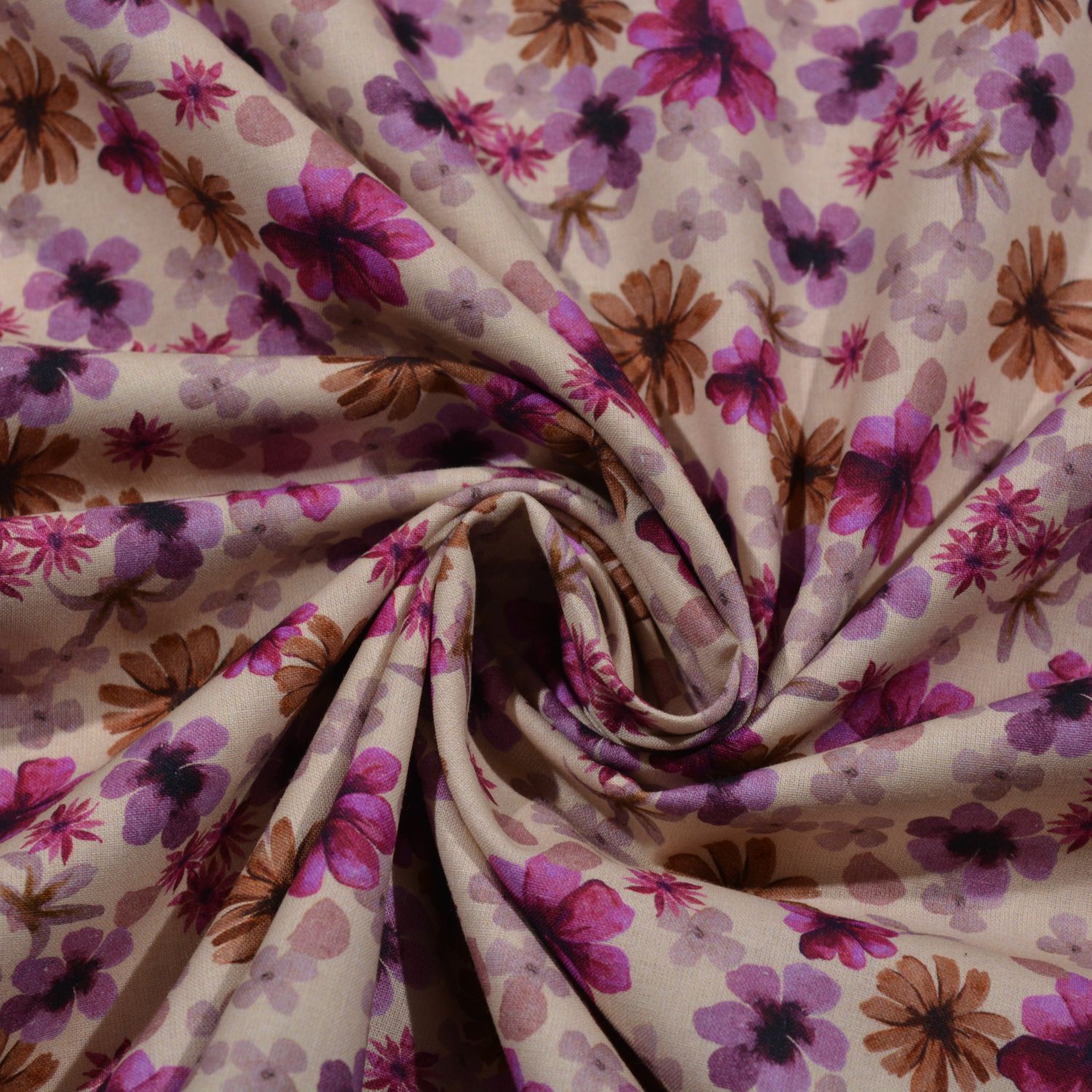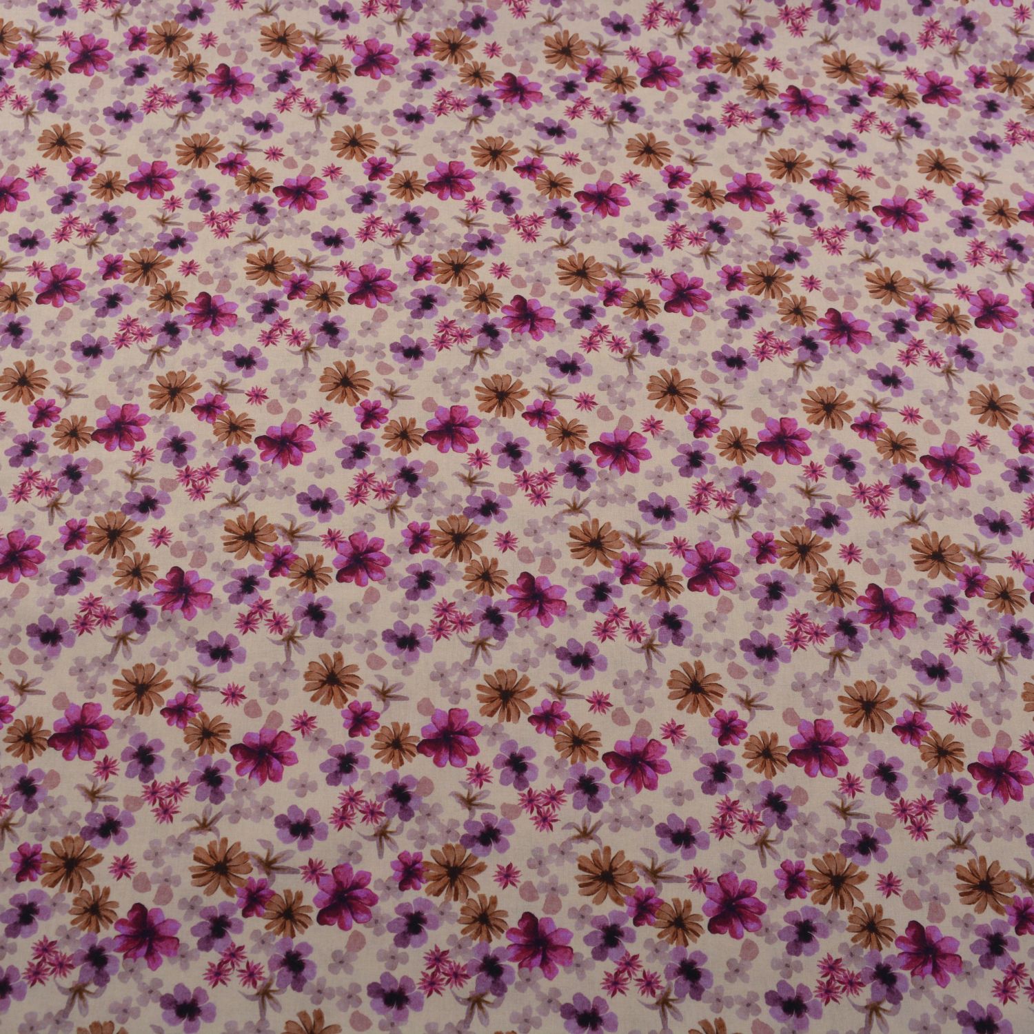 Dieser hochwertige Baumwollstoff begeistert mit einem lebendigen Allover-Muster aus zahlreichen kleinen Blüten. Die Kombination aus Beerentönen, warmem Braun und zarten Rosé-Nuancen auf hellem Grund sorgt für eine frische und gleichzeitig elegante Optik.