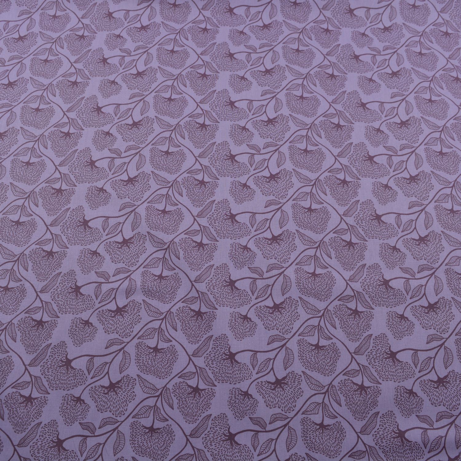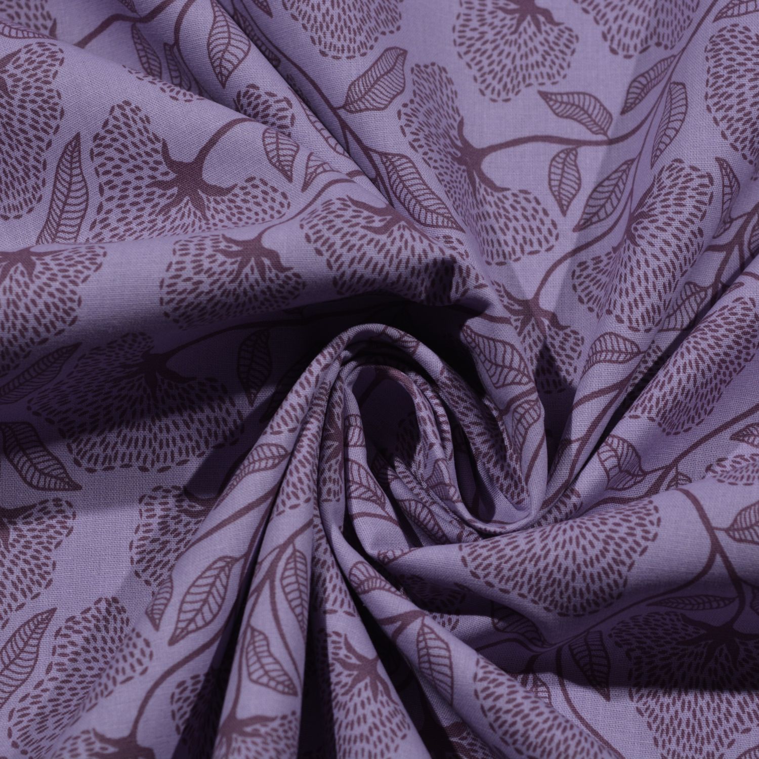 Dieser hochwertige Baumwollstoff überzeugt mit einem dekorativen Allover-Muster aus stilisierten Blüten und feinen Zweigen. Der zarte Flieder-Grundton wird durch das filigrane Muster in dunkleren Beerentönen ergänzt und verleiht dem Stoff eine elegante, leicht romantische Ausstrahlung.