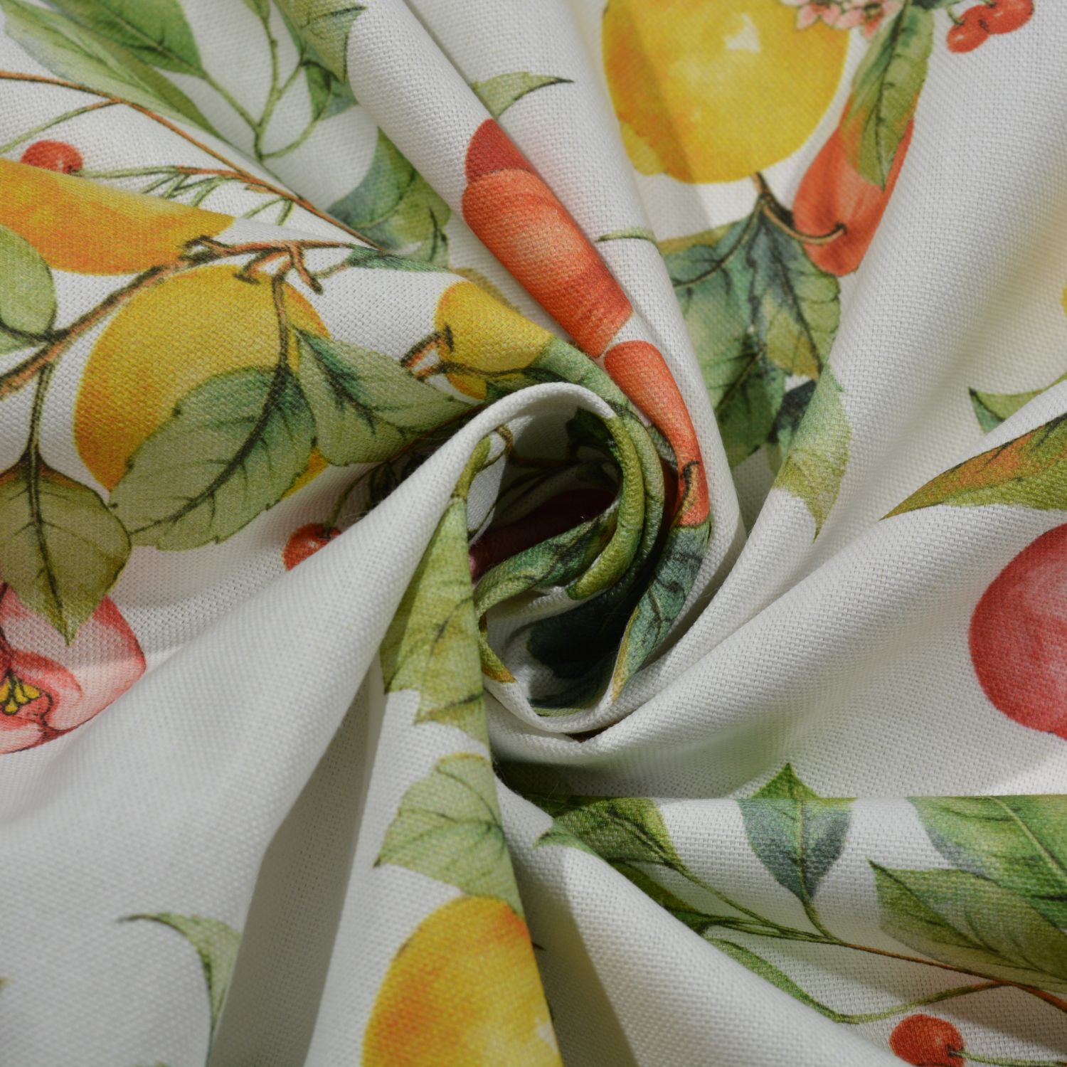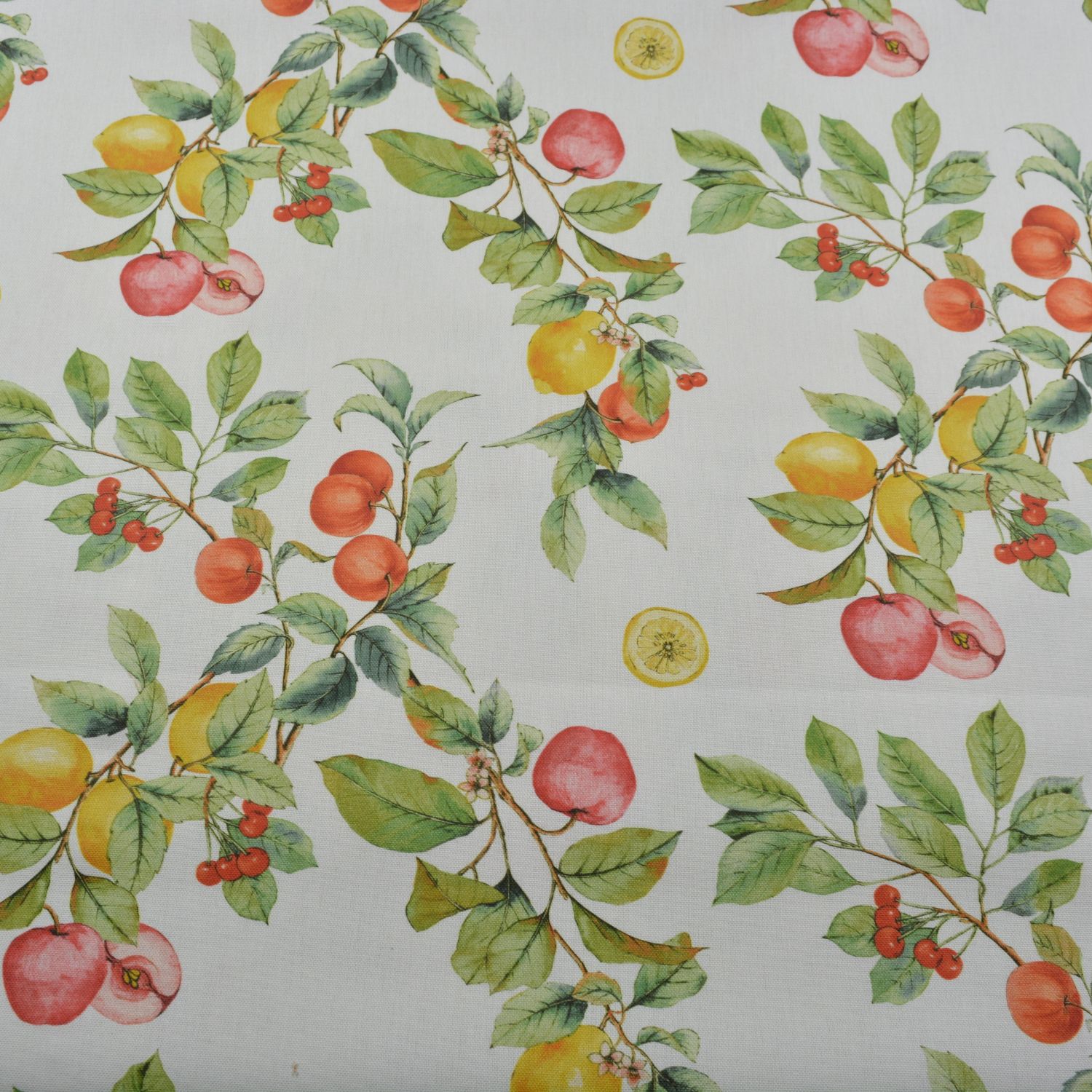 Dieser hochwertige Dekostoff begeistert mit einem liebevoll gestalteten Motiv aus Äpfeln, Zitronen, Blättern und kleinen Beeren auf hellem Grund. Die detailreiche Illustration in natürlichen Farben verleiht dem Stoff eine frische, wohnliche Ausstrahlung und passt perfekt zu Küchen-, Wohn- und Dekoprojekten im Landhaus- oder Vintage-Stil.