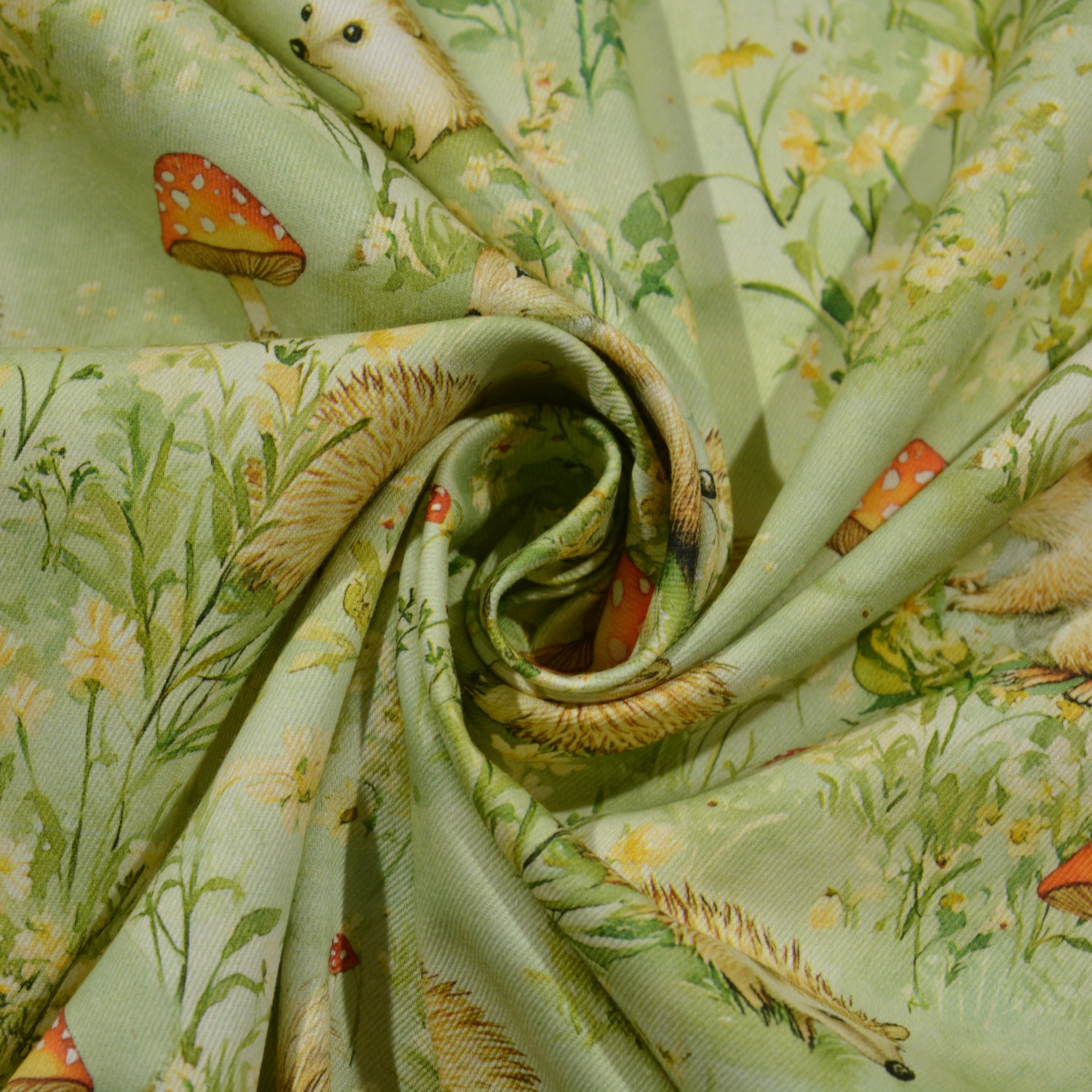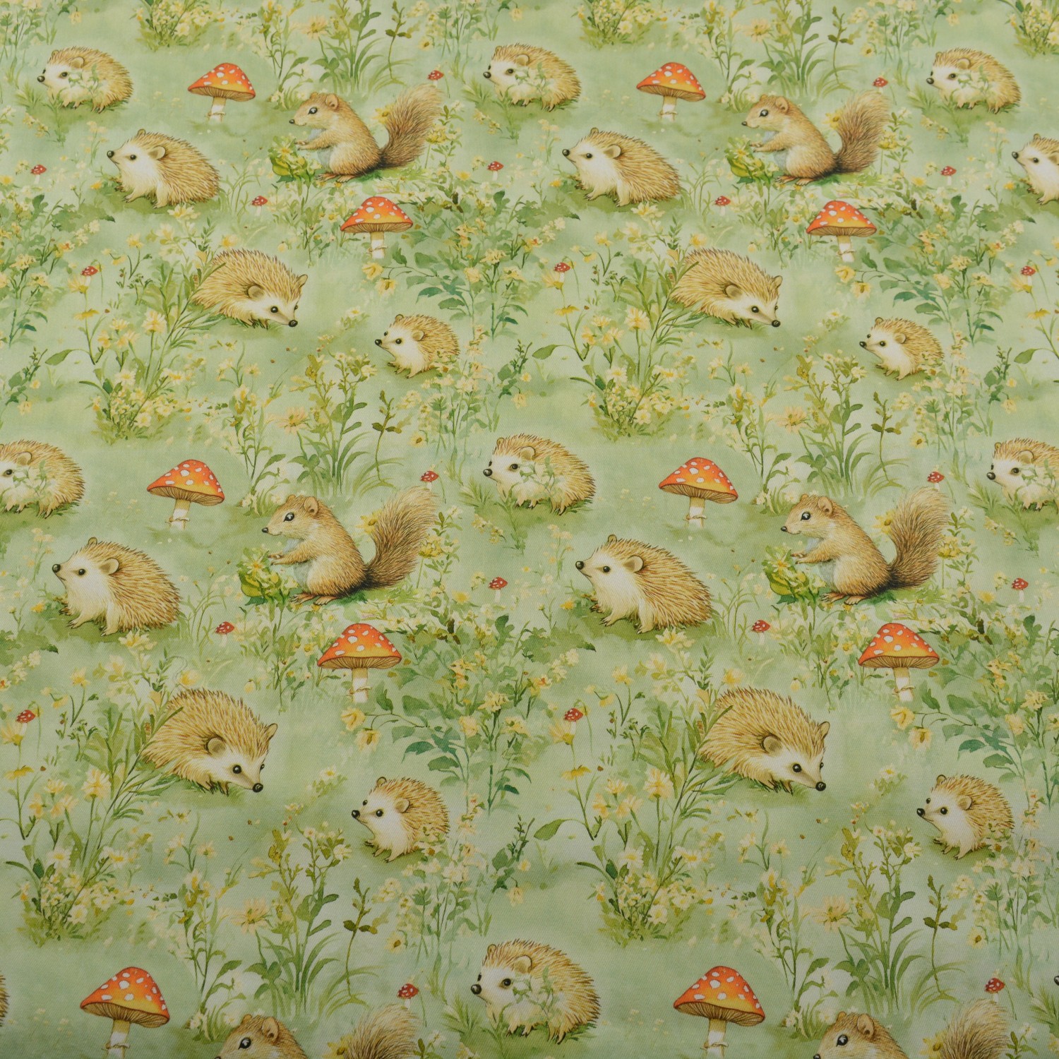Dieser hochwertig digital bedruckte Baumwoll-Dekostoff begeistert mit einem liebevoll illustrierten Waldmotiv: Igel, kleine Eichhörnchen, Pilze und zarte Wiesenblumen auf zartgrünem Hintergrund – naturverbunden, verspielt und dennoch stilvoll harmonisch. Mit ca. 200 g/m² ist dieser Stoff deutlich fester als klassische Patchwork-Baumwolle und somit ideal für Wohntextilien, Accessoires und dekorative Projekte.