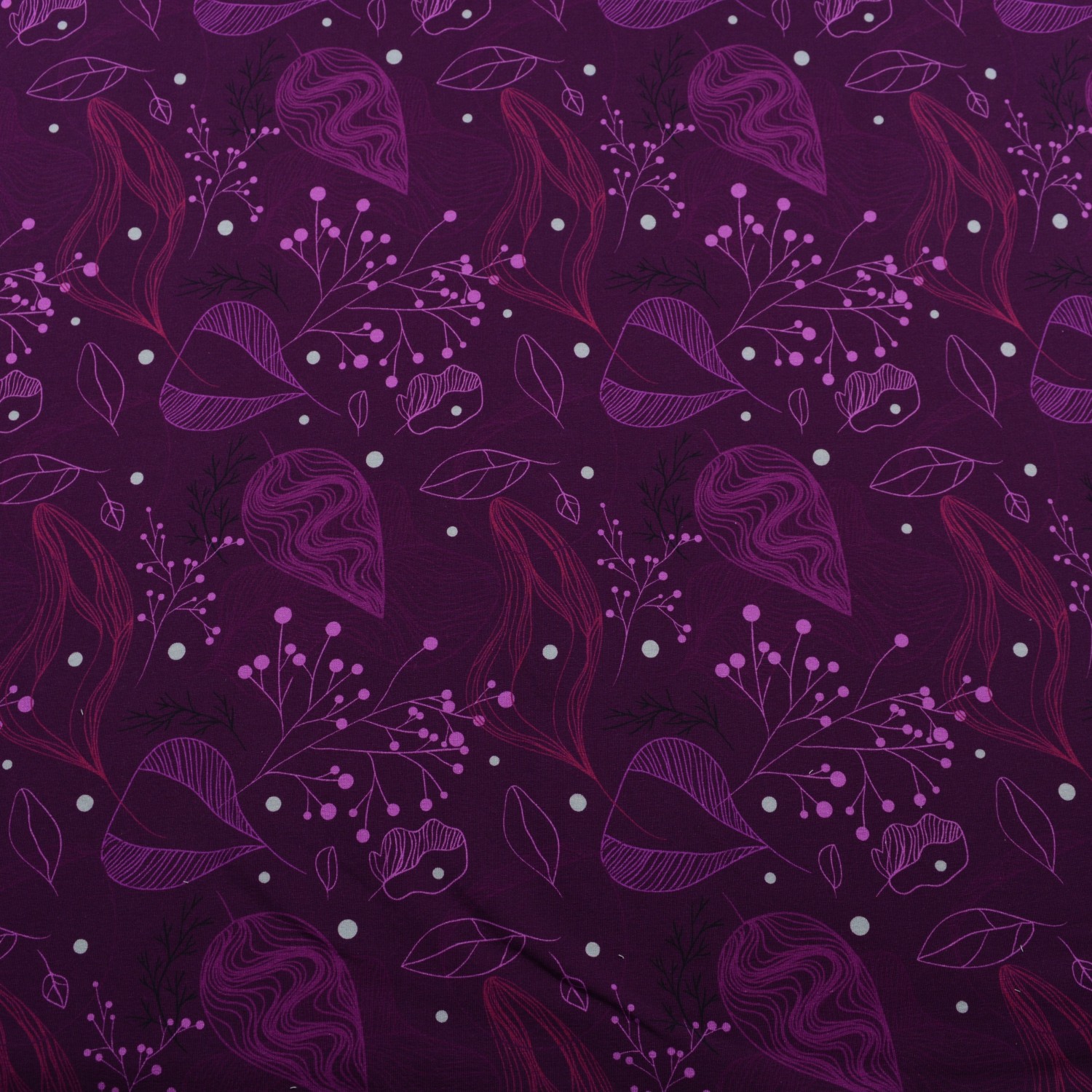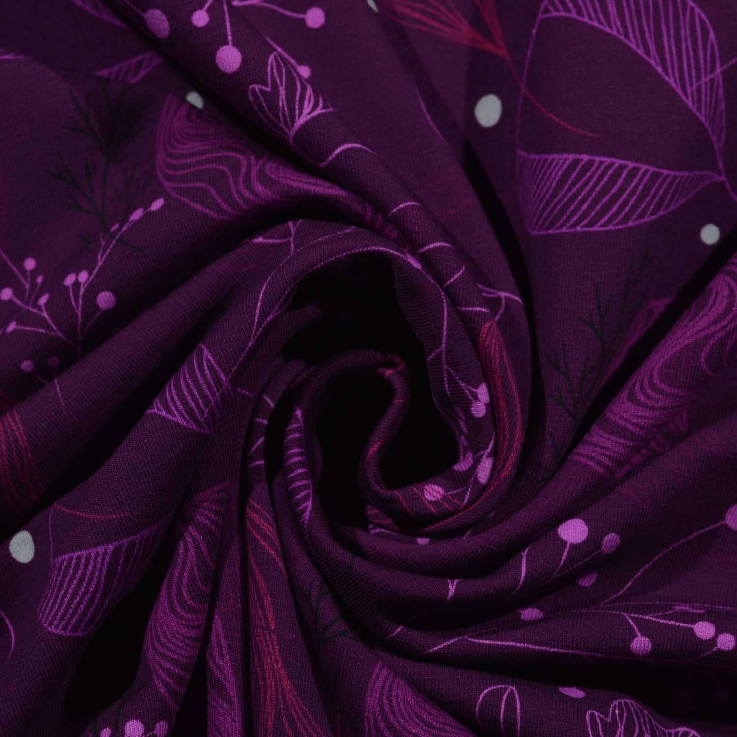 Unser French Terry „Anke“ in einem intensiven Lila mit filigranen pinken Blätter- und Naturmotiven ist ein echter Hingucker für kreative Nähprojekte. Der hochwertige French Terry überzeugt durch seinen weichen Griff, den angenehmen Fall und die typische Schlingenware auf der Innenseite – perfekt für Bekleidung, die Komfort und Stil vereint.