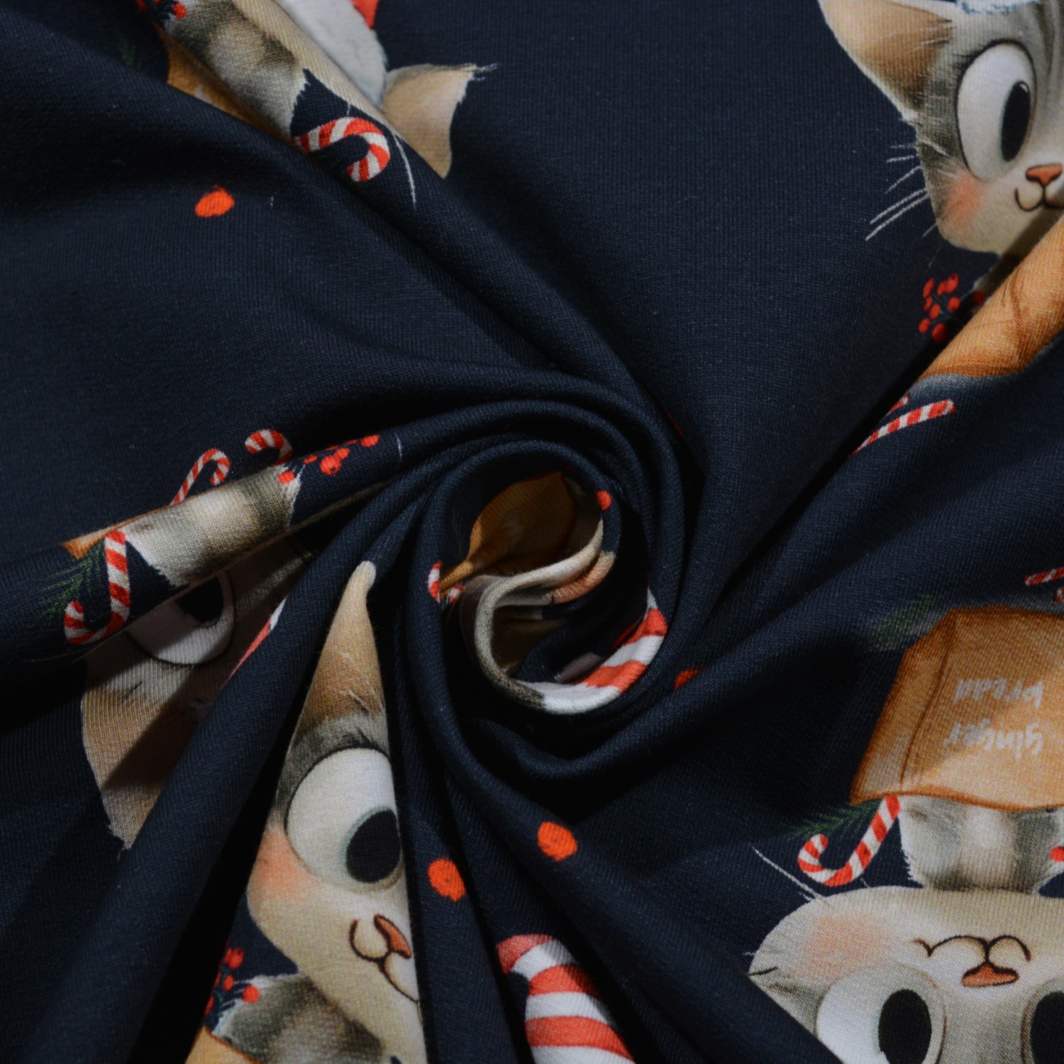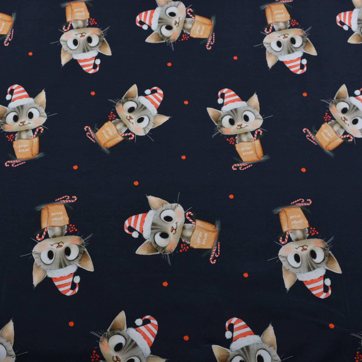 French Terry „Christmas Cat“ – verspielter Digitaldruck mit süßen Weihnachtskatzen auf Dunkelblau