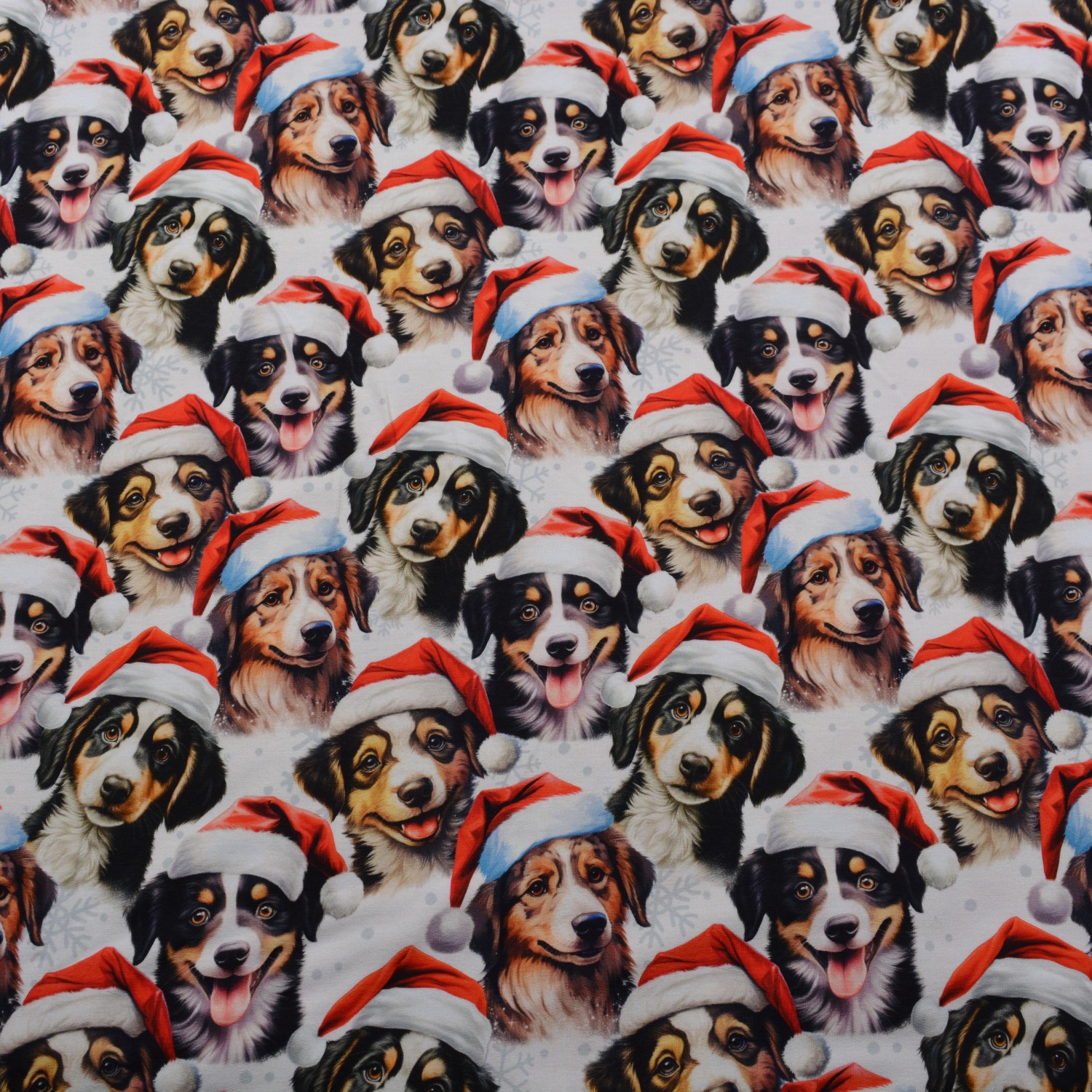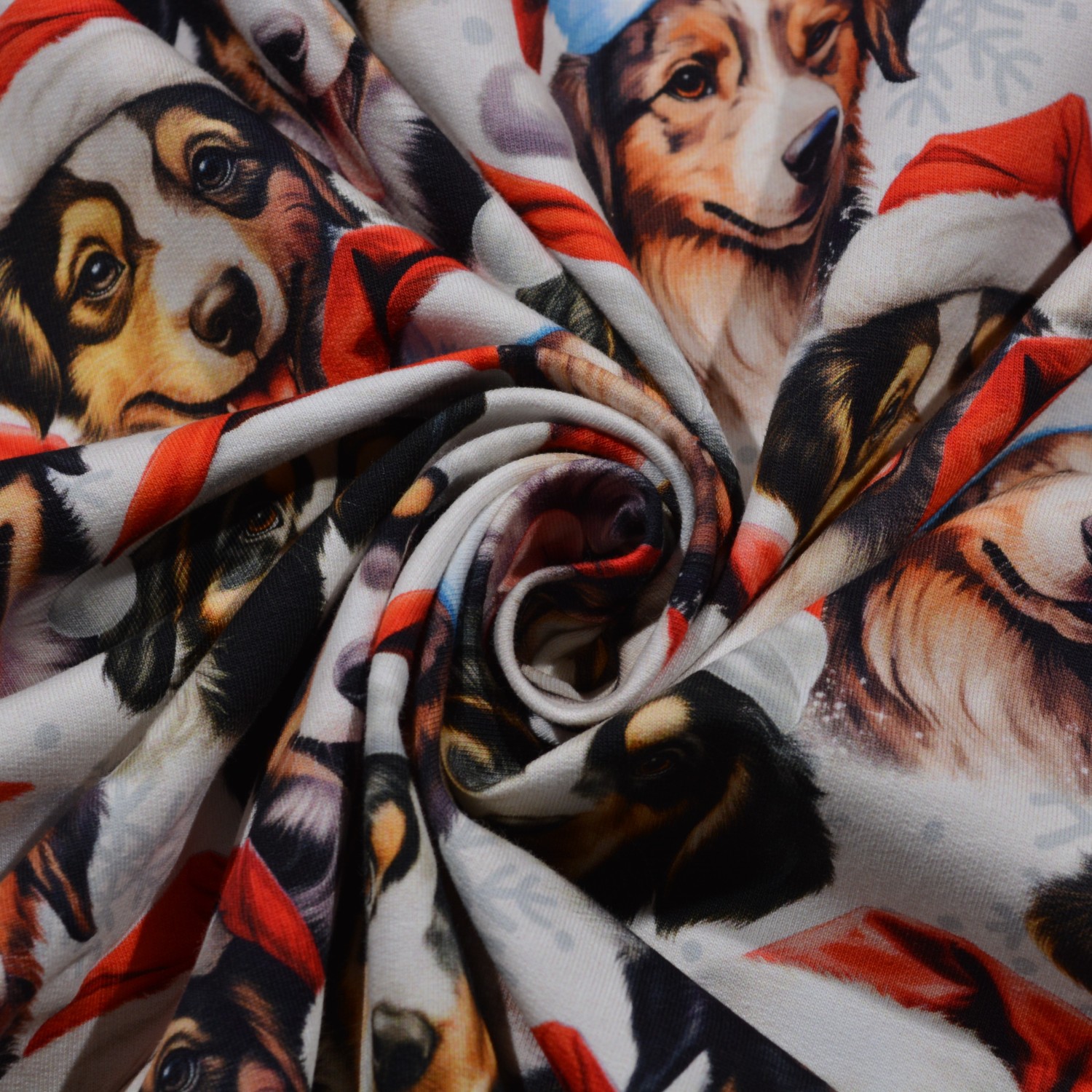 French Terry „Christmas Dogs“ – Weihnachtsstoff mit süßen Hunden im Santa-Look