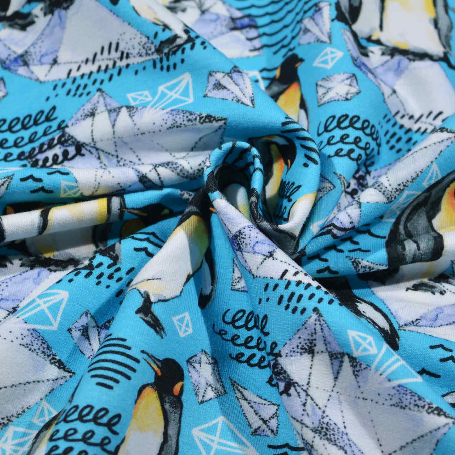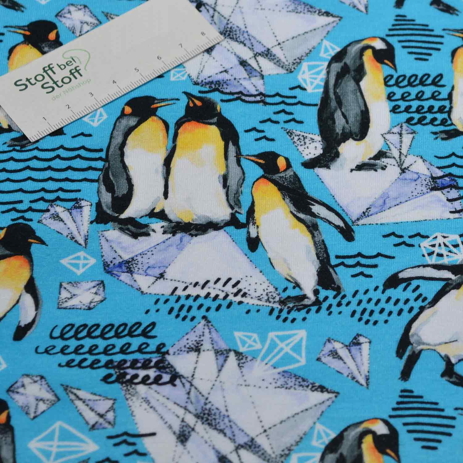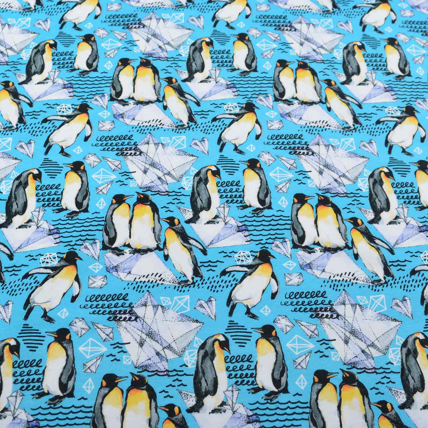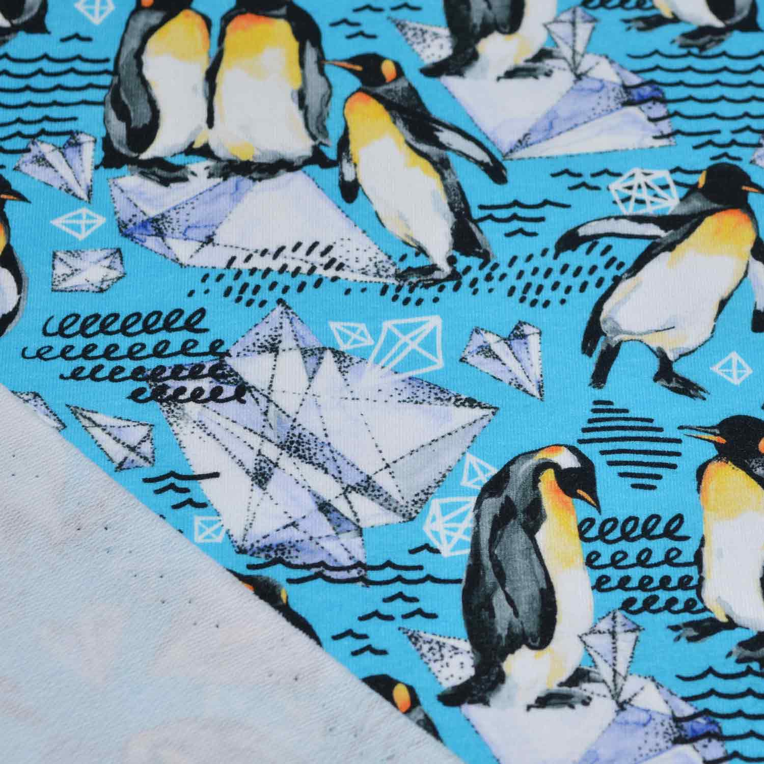 Da ist was los auf den Eisschollen! Auf diesem French Terry in kühlem Türkisblau tummeln sich mal einzeln, mal paarweise Pinguine auf einzelnen Eisflächen. Cool!