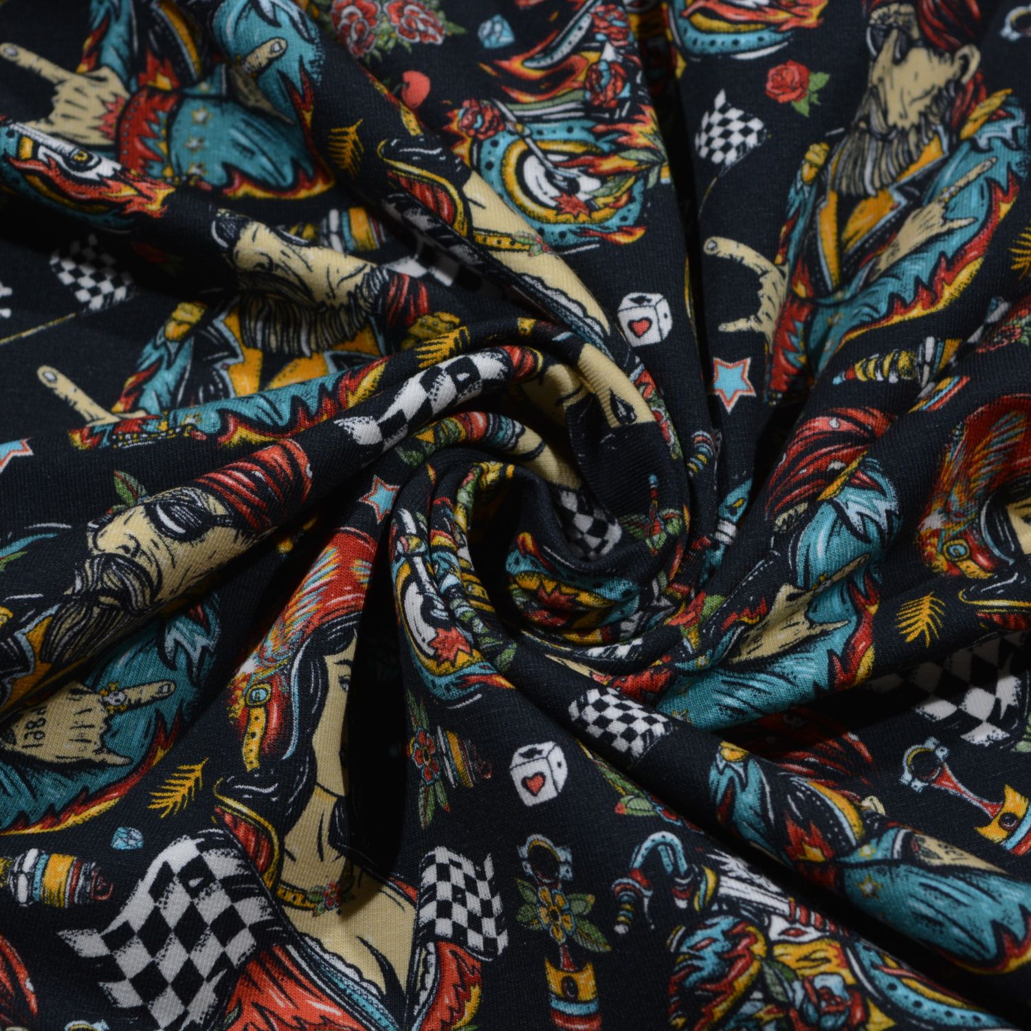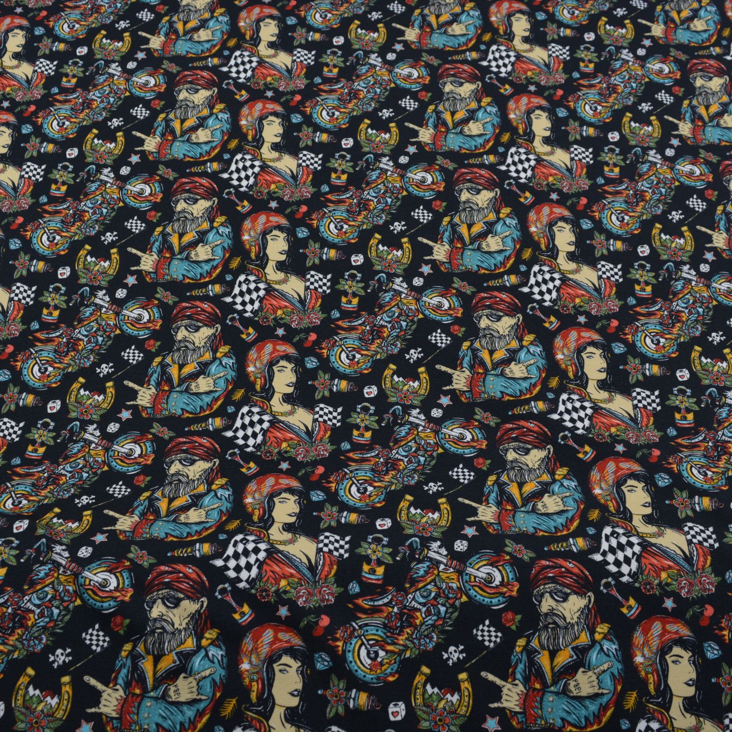 Dieser auffällige French Terry überzeugt mit einem ausdrucksstarken Allover-Design im Tattoo- und Rockabilly-Stil. Illustrationen wie Biker, Pin-up-Figuren, Totenköpfe, Motoren, Würfel und Rennflaggen sorgen für einen markanten Look mit viel Charakter. Der schwarze Grund bringt die intensiven Farben besonders gut zur Geltung und macht diesen Stoff zu einem echten Statement für individuelle Nähprojekte.