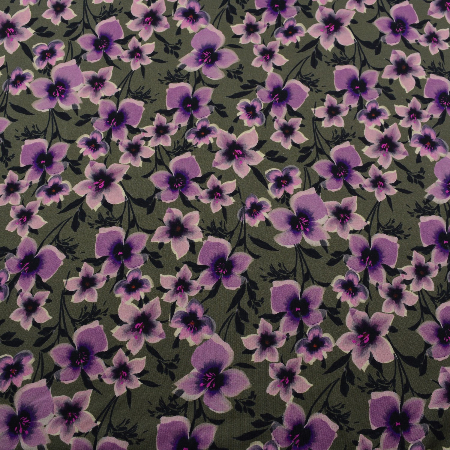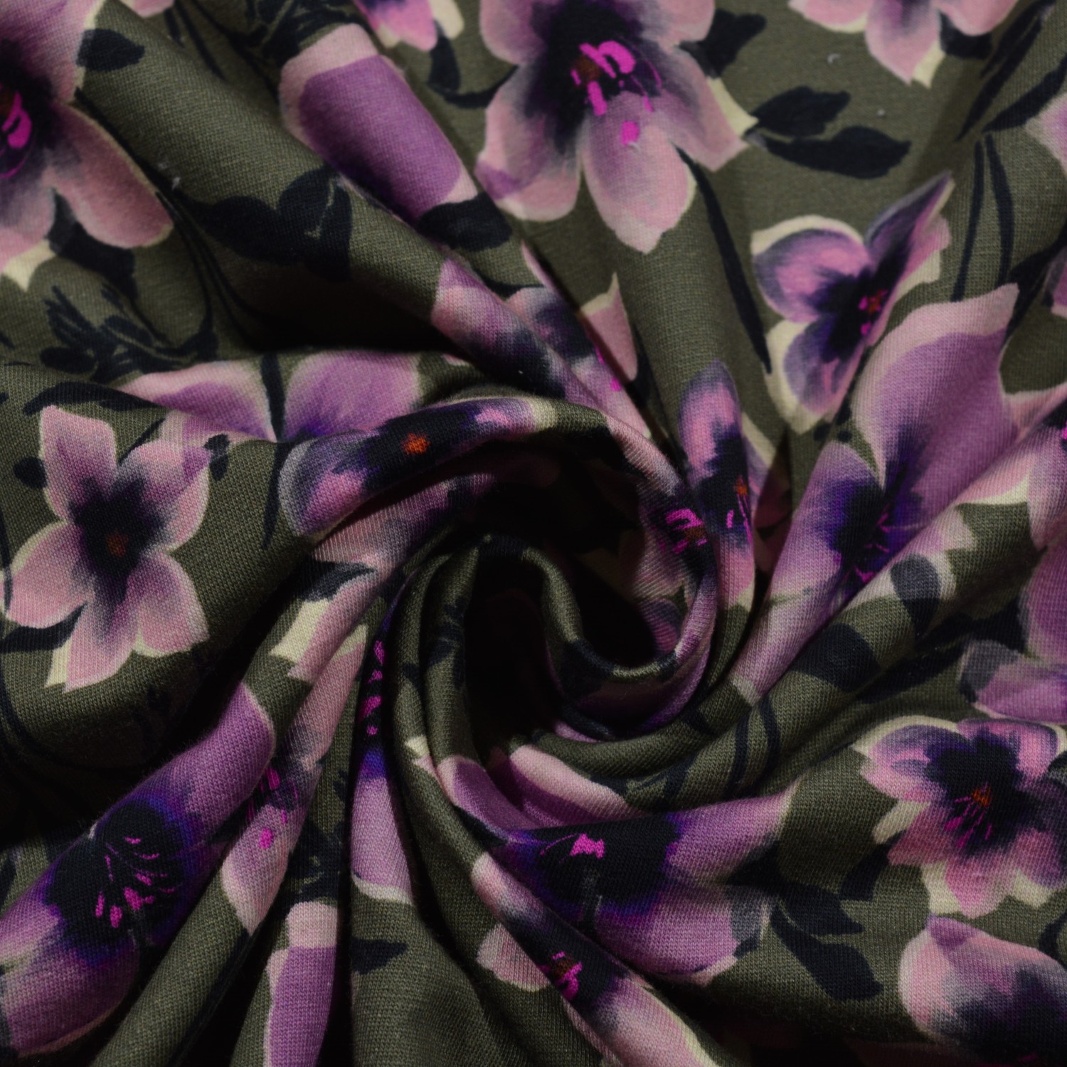 Der French Terry „Viola“ begeistert mit einem romantischen Blütendesign in Lila- und Violetttönen auf olivgrünem Hintergrund. Der angenehme Baumwoll-Elasthan-Mix macht den Stoff weich, dehnbar und besonders hautfreundlich. Perfekt geeignet für Sweater, Kleider, Röcke, Leggings oder gemütliche Homewear.