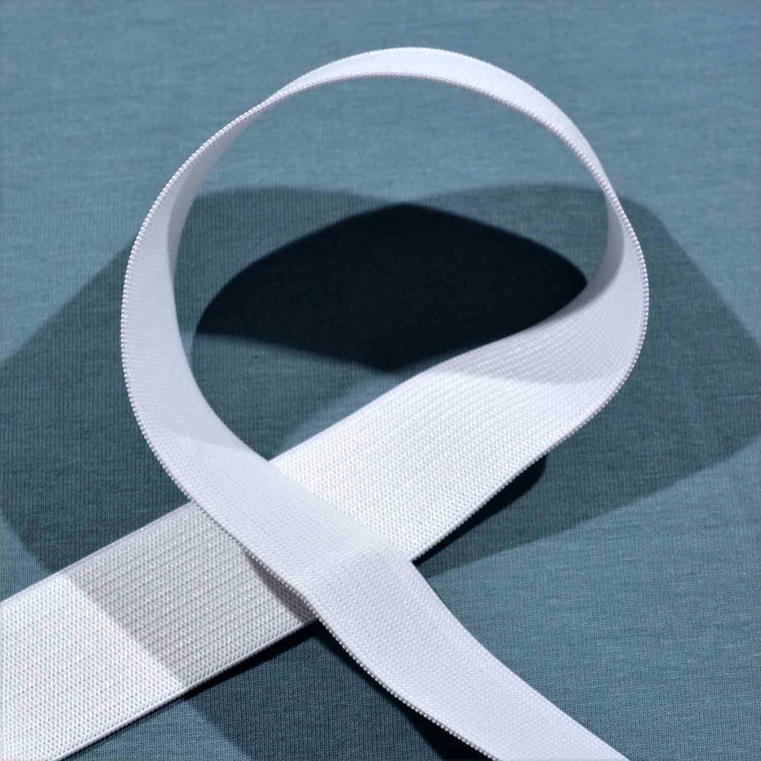 Einfaches Gummiband in weiß von 2cm Breite. Klassische, weiche, strapazierfähige Gummilitze zum Einziehen in Bündchen und ähnliche Verwendungszwecke.