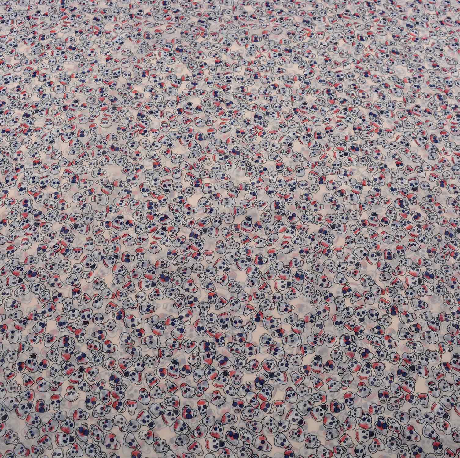Der in pudrigem Nude getönte Untergrund ist mit originellen kleinen Totenköpfchen bedruckt, die wild durcheinander über den Stoff purzeln.