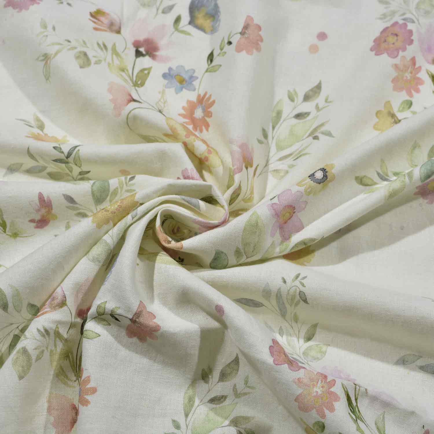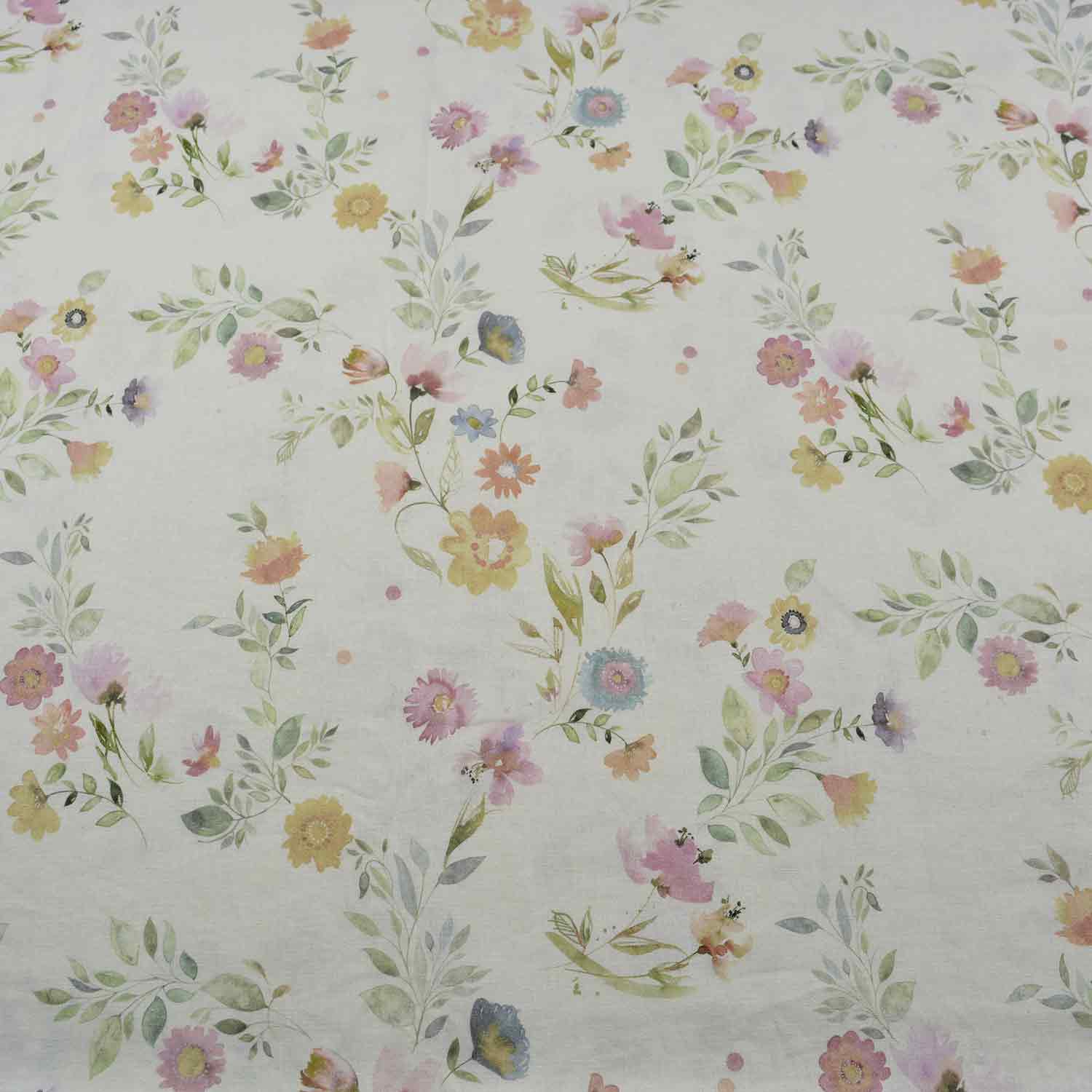 Der wollweiße Untergrund dieses Dessin ist mit wunderschön gemalten Blumen in zarten Pastell-Tönen bedruckt. Feine Rispen und Blätter zusammen mit den sanften Blüten ergeben ein wunderbares Frühlings-Dessin.