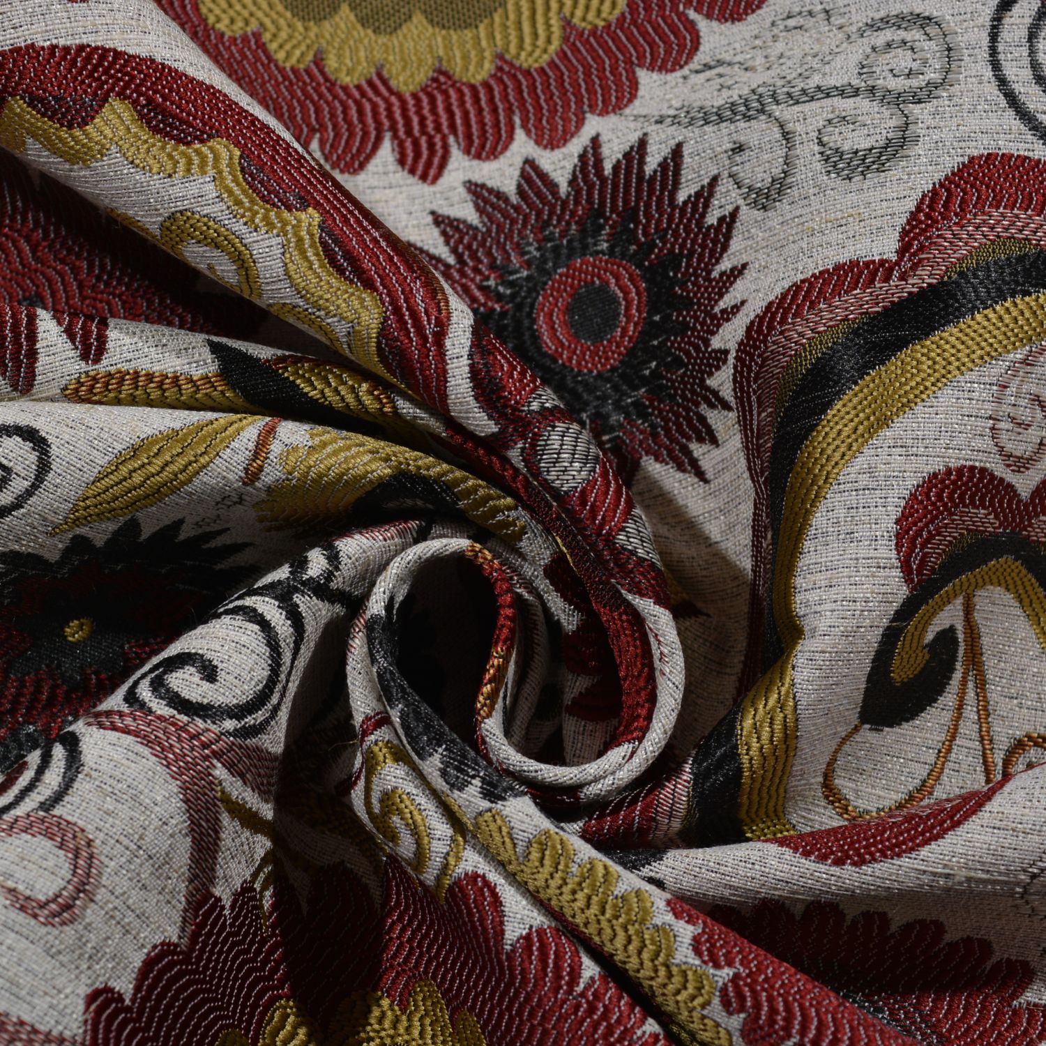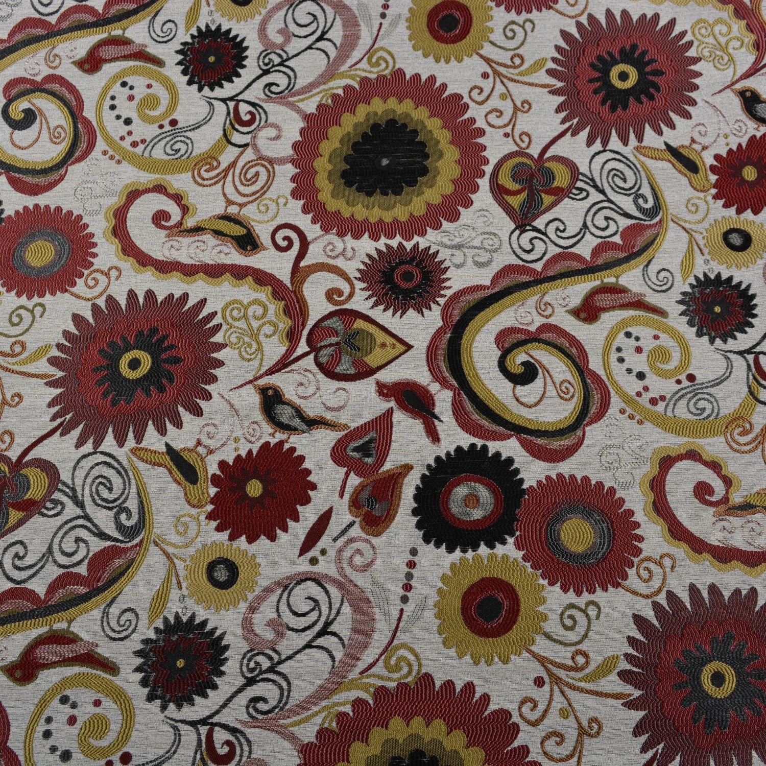 Dieser hochwertige Jacquard-Möbelstoff überzeugt mit einem detailreichen floralen Muster in harmonisch abgestimmten Rot-, Gold- und Schwarztönen auf hellem Untergrund. Die eingewebten Ornamente, Blüten und geschwungenen Elemente verleihen dem Stoff eine edle, klassische Ausstrahlung.
