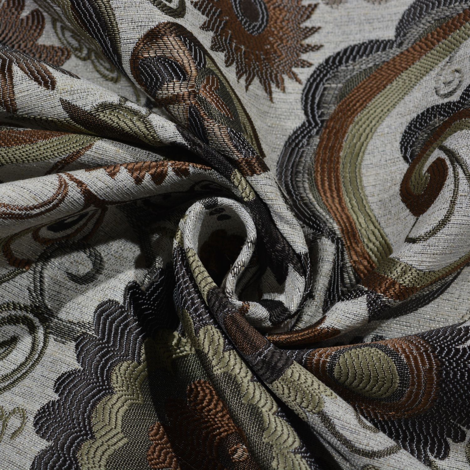 Dieser hochwertige Jacquard-Möbelstoff überzeugt mit einem detailreichen floralen Ornamentmuster in harmonisch abgestimmten Natur- und Erdtönen. Die kunstvoll eingewebten Blüten, Ranken und kleinen Vogelmotive verleihen dem Stoff eine elegante, leicht verspielte Optik.