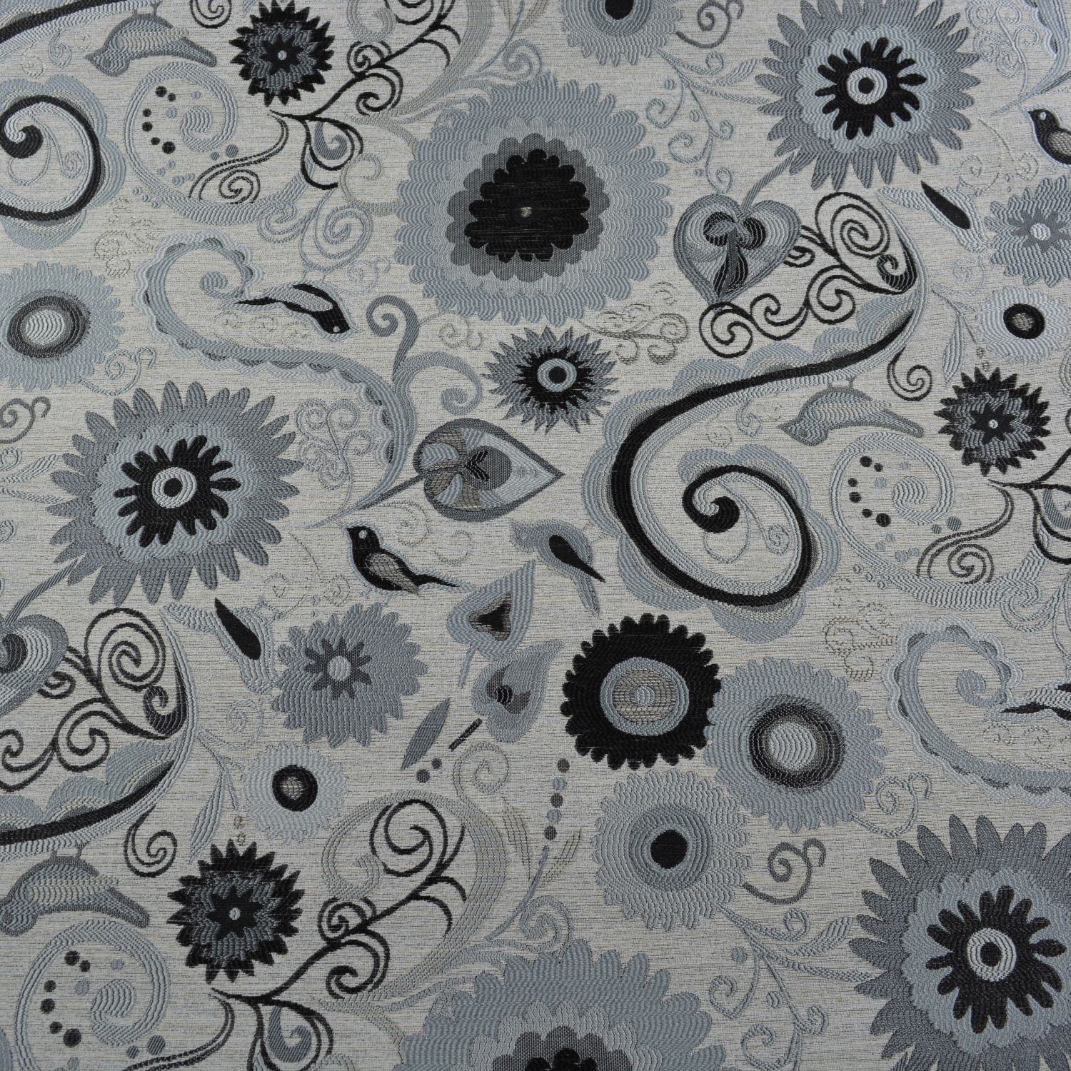 Dieser hochwertige Jacquard-Möbelstoff überzeugt mit einem detailreichen floralen Ornamentmuster in eleganten Grau- und Schwarztönen. Die kunstvoll eingewebten Blüten, geschwungenen Ranken und kleinen Vogelmotive verleihen dem Stoff eine moderne und zugleich stilvolle Ausstrahlung.