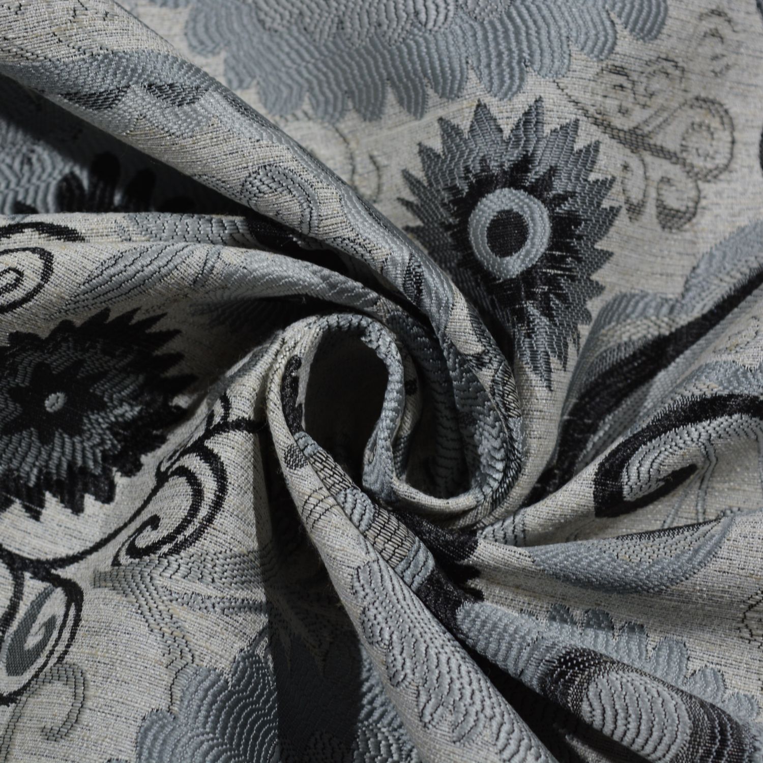 Jacquard Möbelstoff – florales Ornamentdesign in Grau & Schwarz